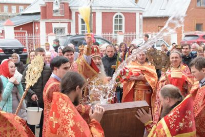 После Литургии прошел крестный ход вокруг храма с чтением Евангелия и кроплением святой водой. Затем Владыка обратился к собравшимся с проповедью: