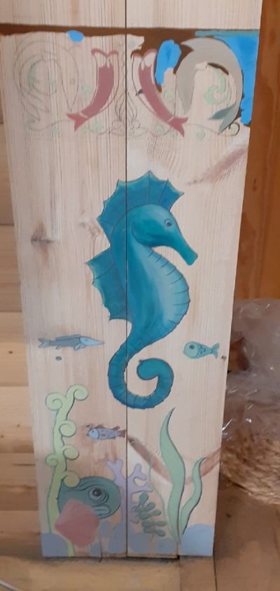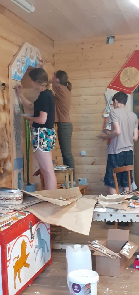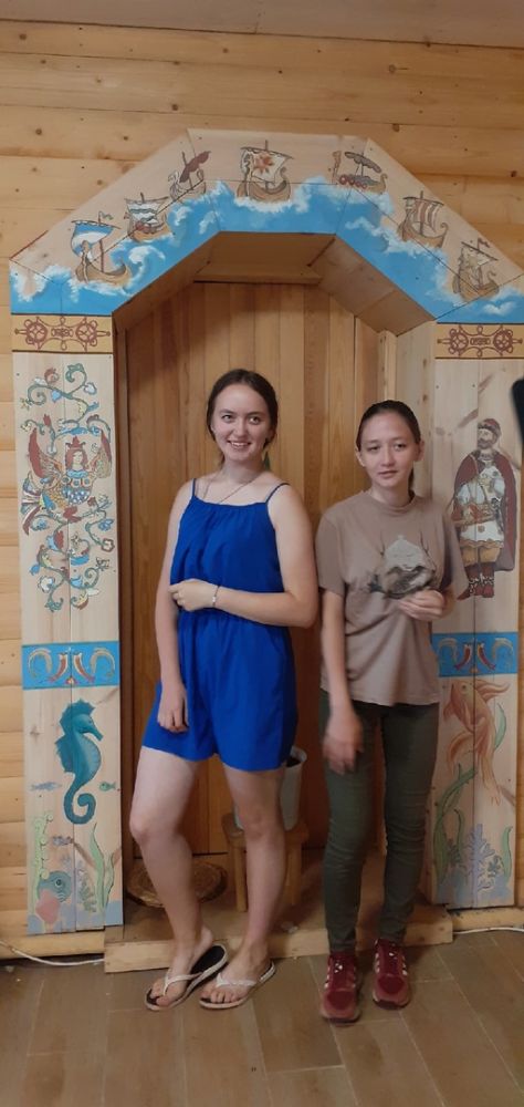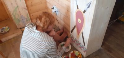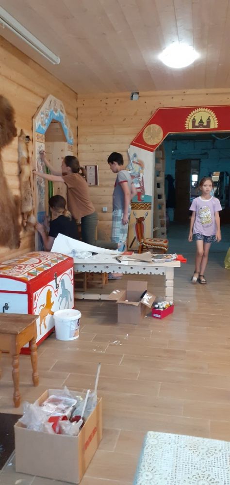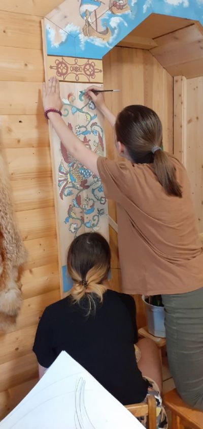 За неделю яркими росписями в былинном стиле украшены дверные косяки и оконные наличники, начата роспись потолка. Работы будут продолжаться и в дальнейшем.