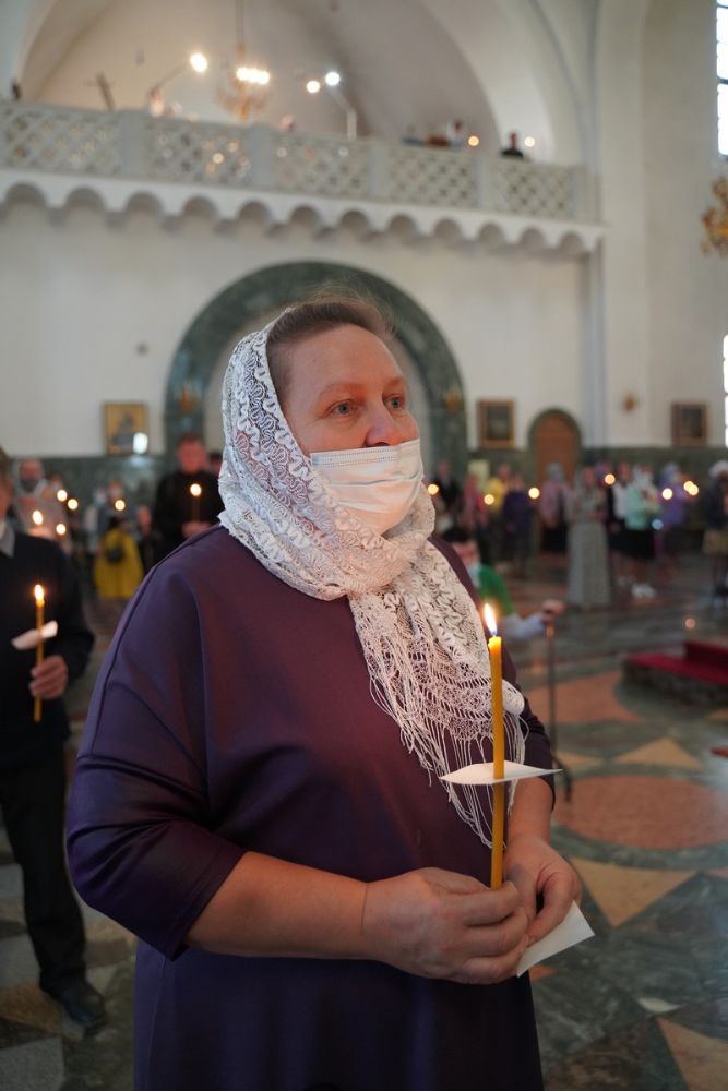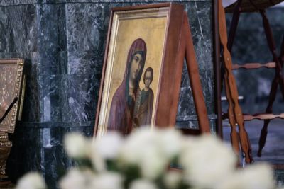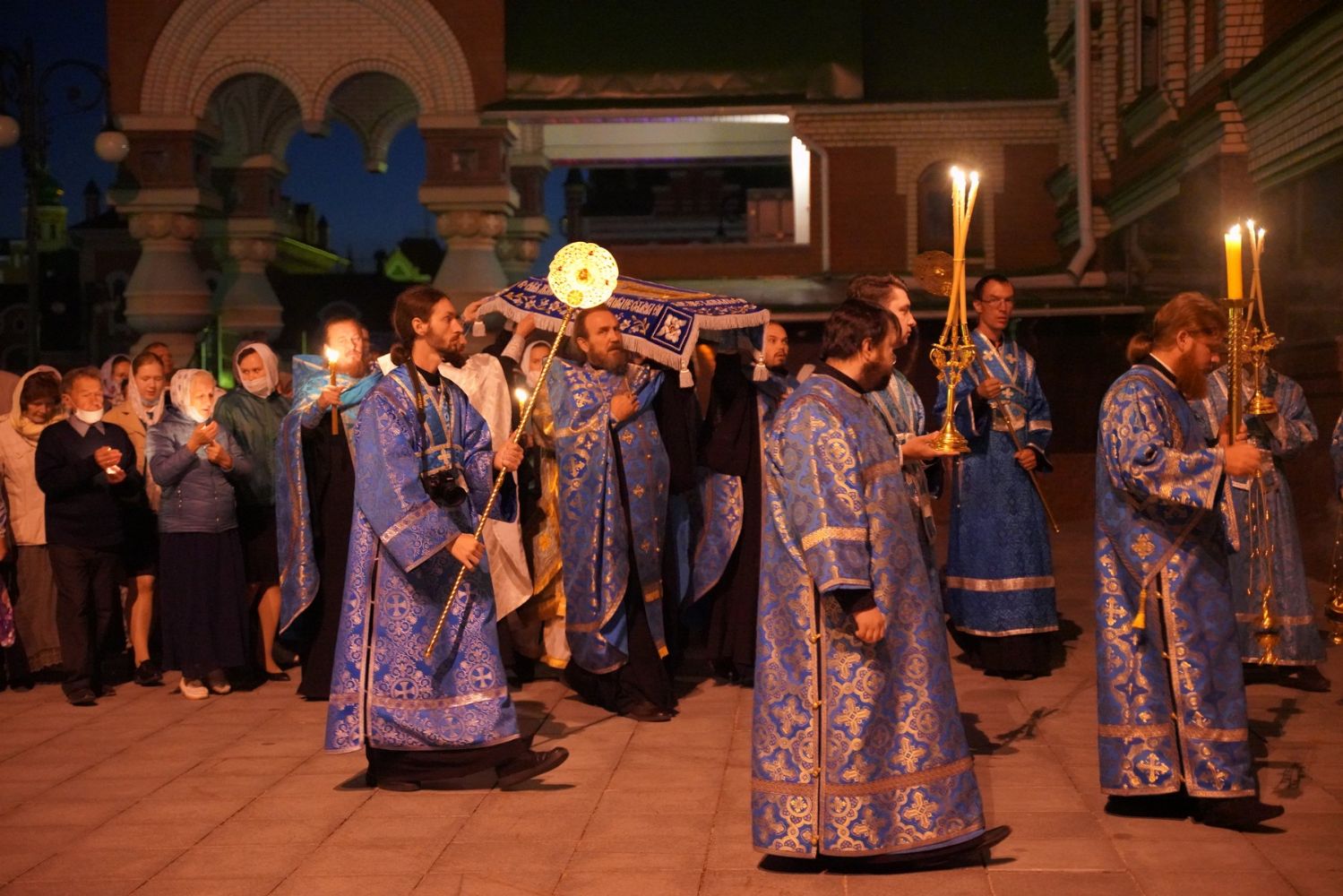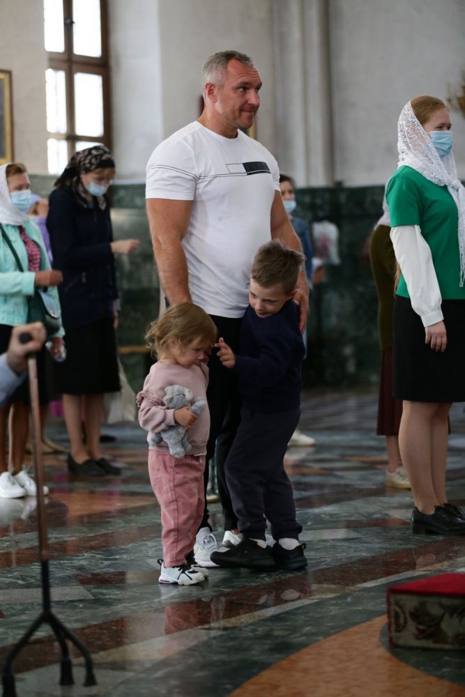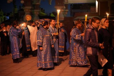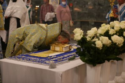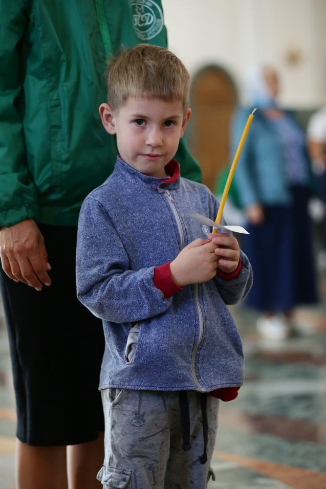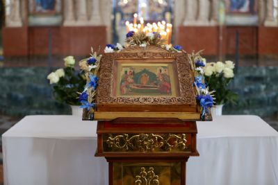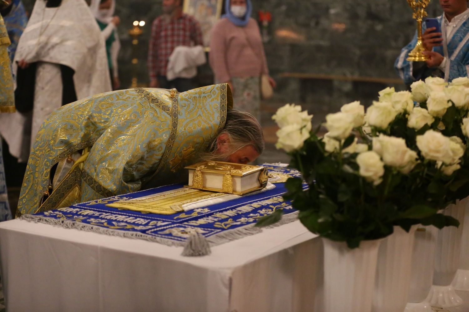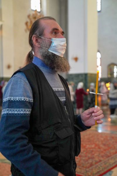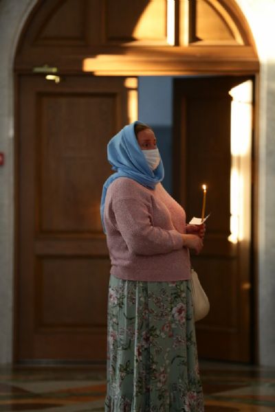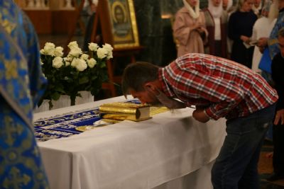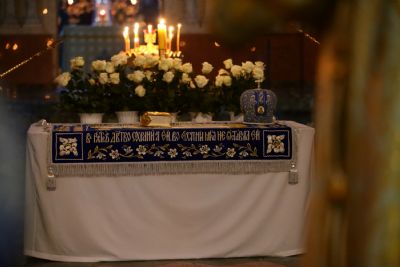 После великого славословия при пении «Трисвятого» Плащаница с изображением Пресвятой Богородицы была обнесена крестным ходом вокруг собора и унесена в алтарь, где и будет пребывать до отдания праздника Успения.
