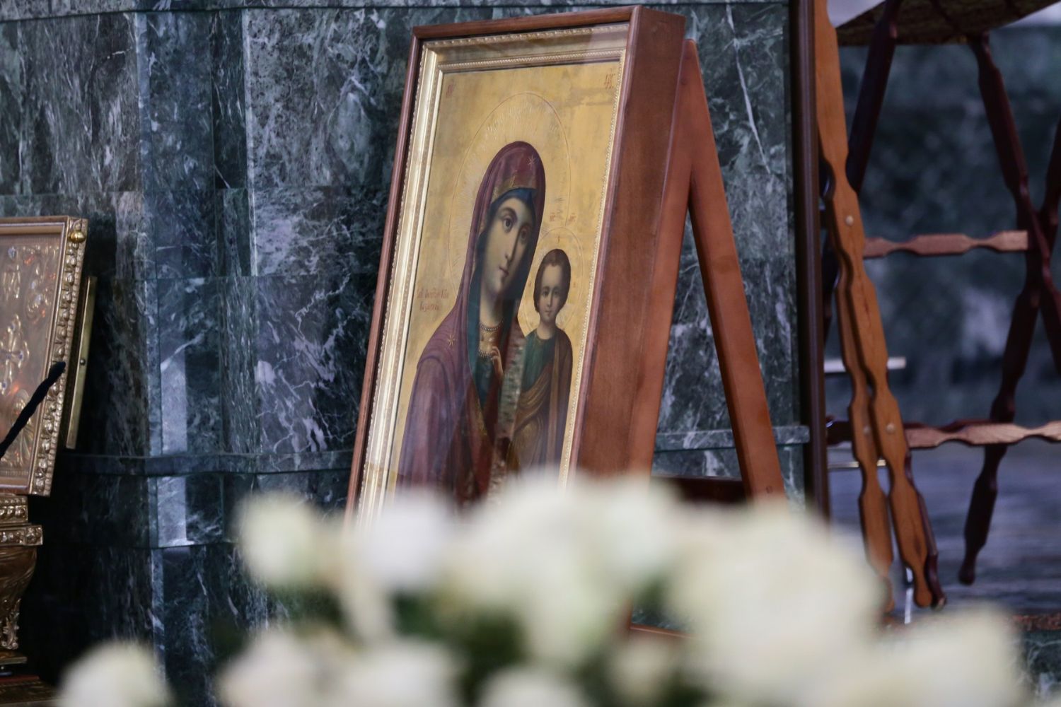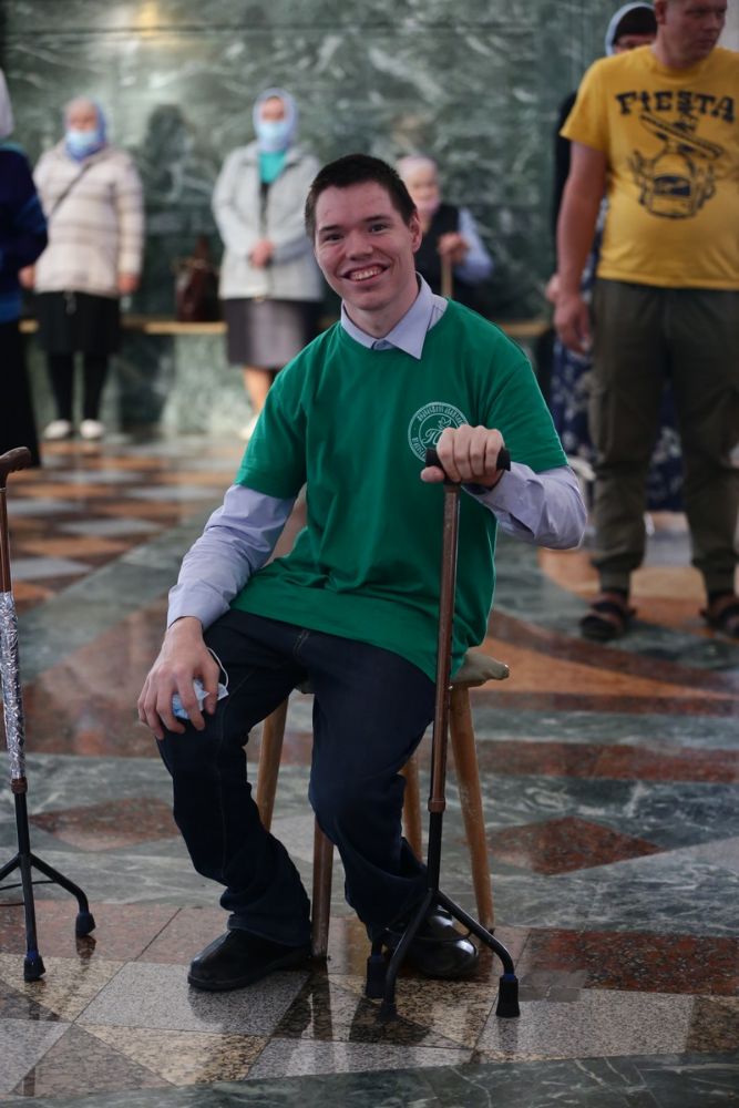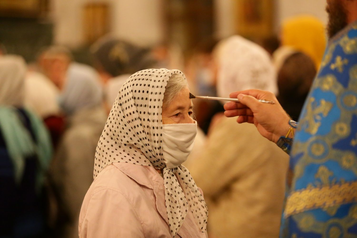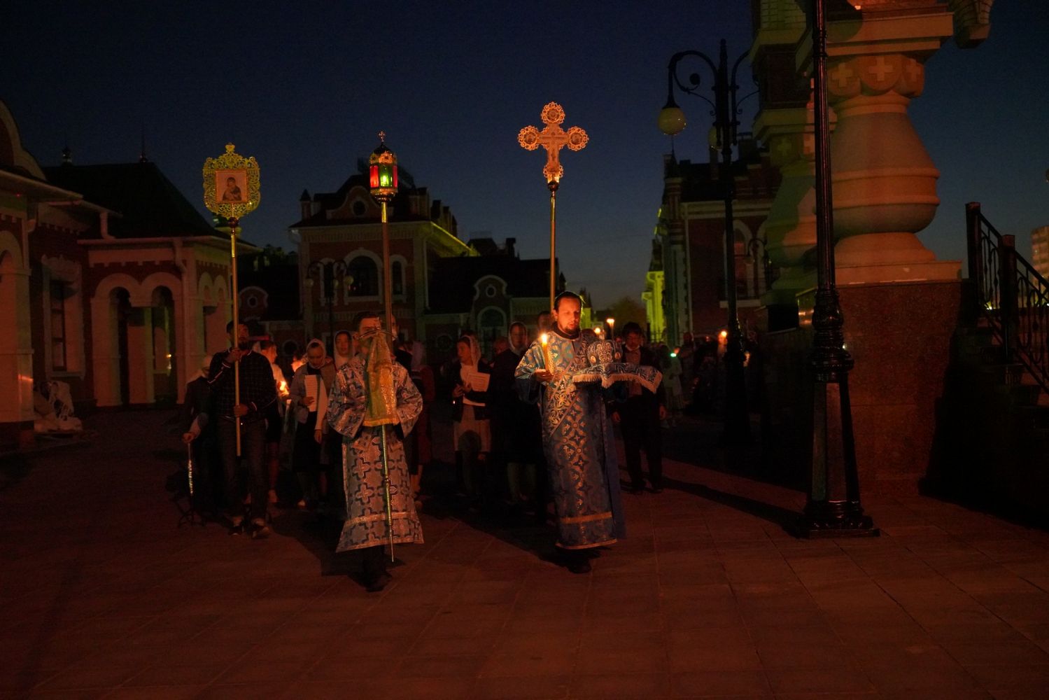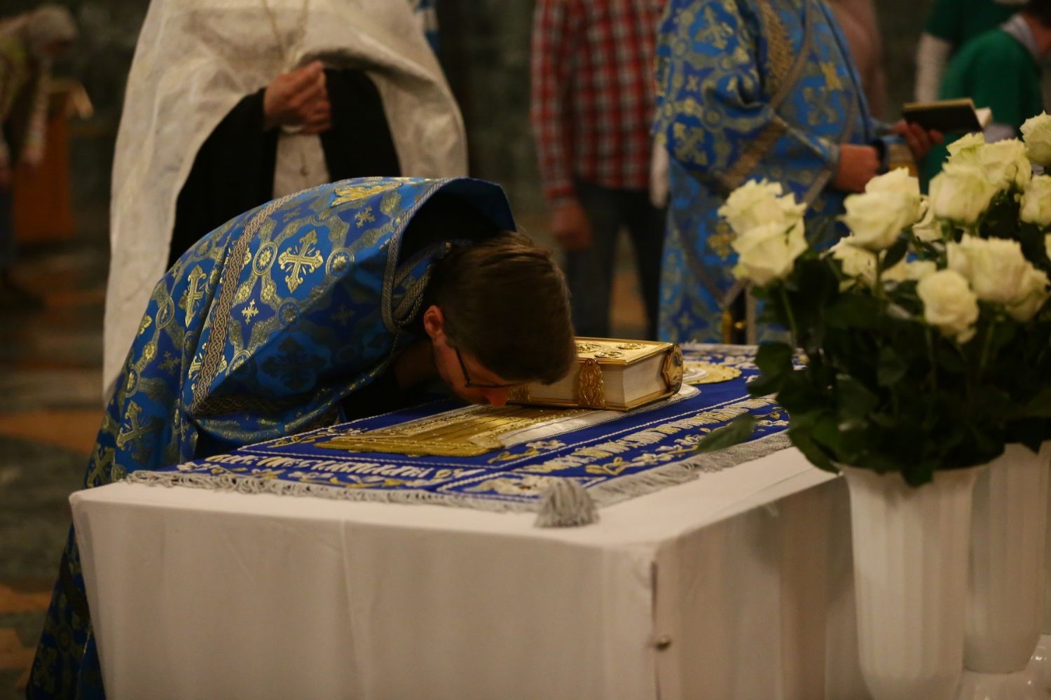После великого славословия при пении «Трисвятого» Плащаница с изображением Пресвятой Богородицы была обнесена крестным ходом вокруг собора и унесена в алтарь, где и будет пребывать до отдания праздника Успения.