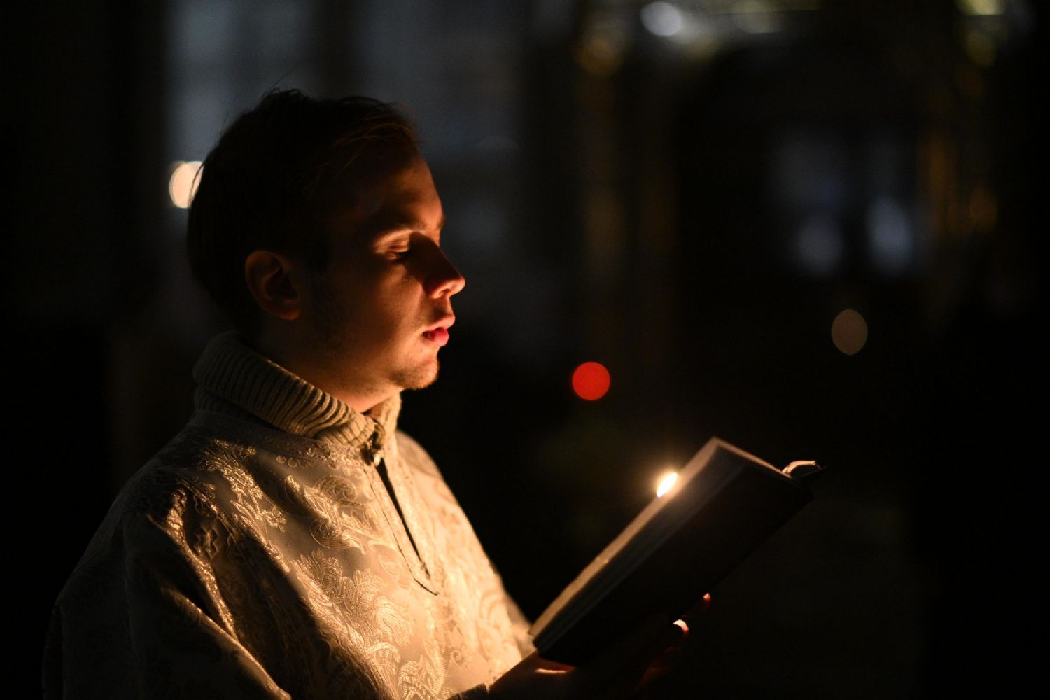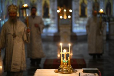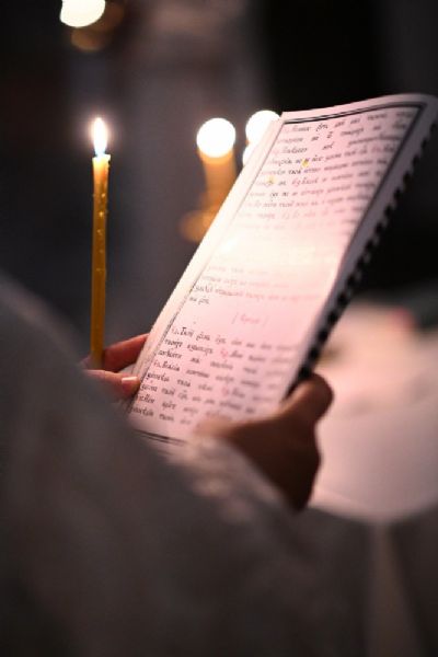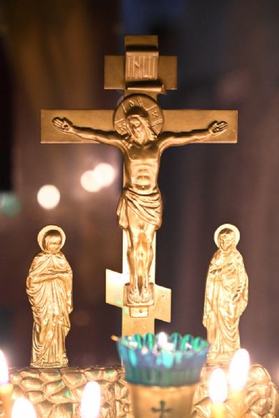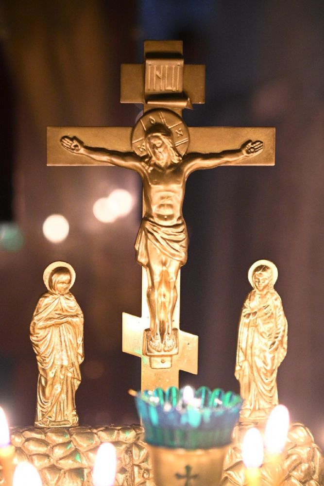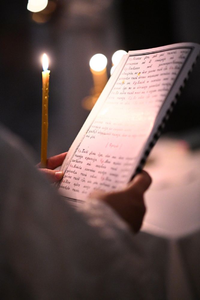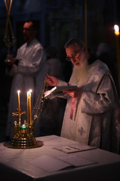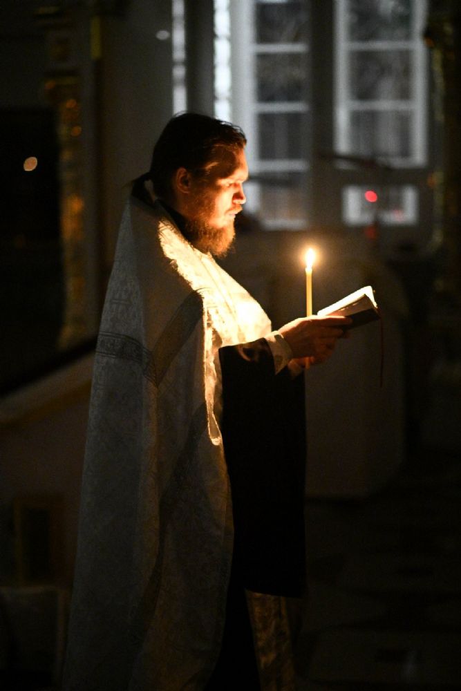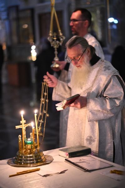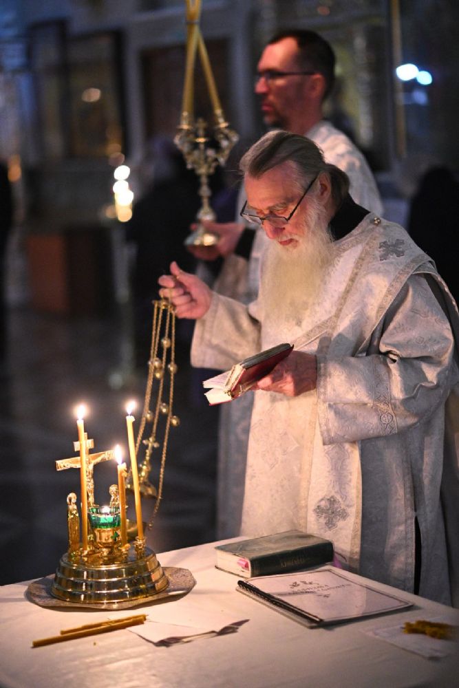 После шестопсалмия владыка с сослужащими перед кануном с Голгофой читал 17 кафизму с заупокойными ектеньями.