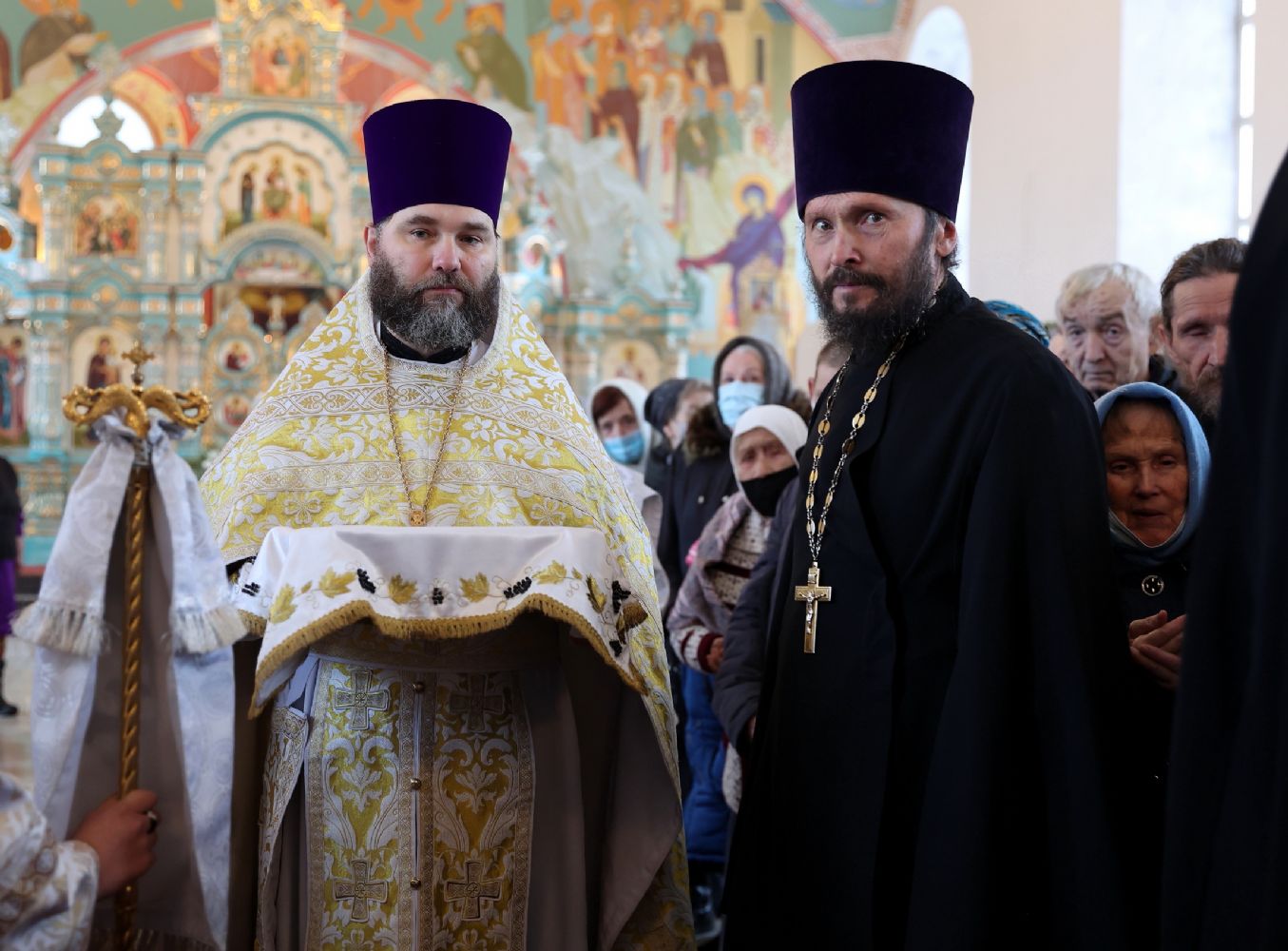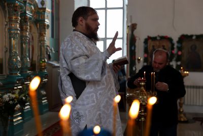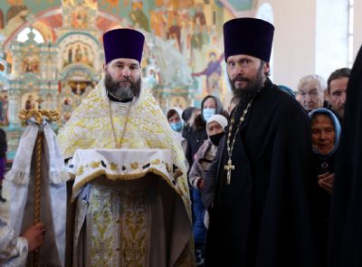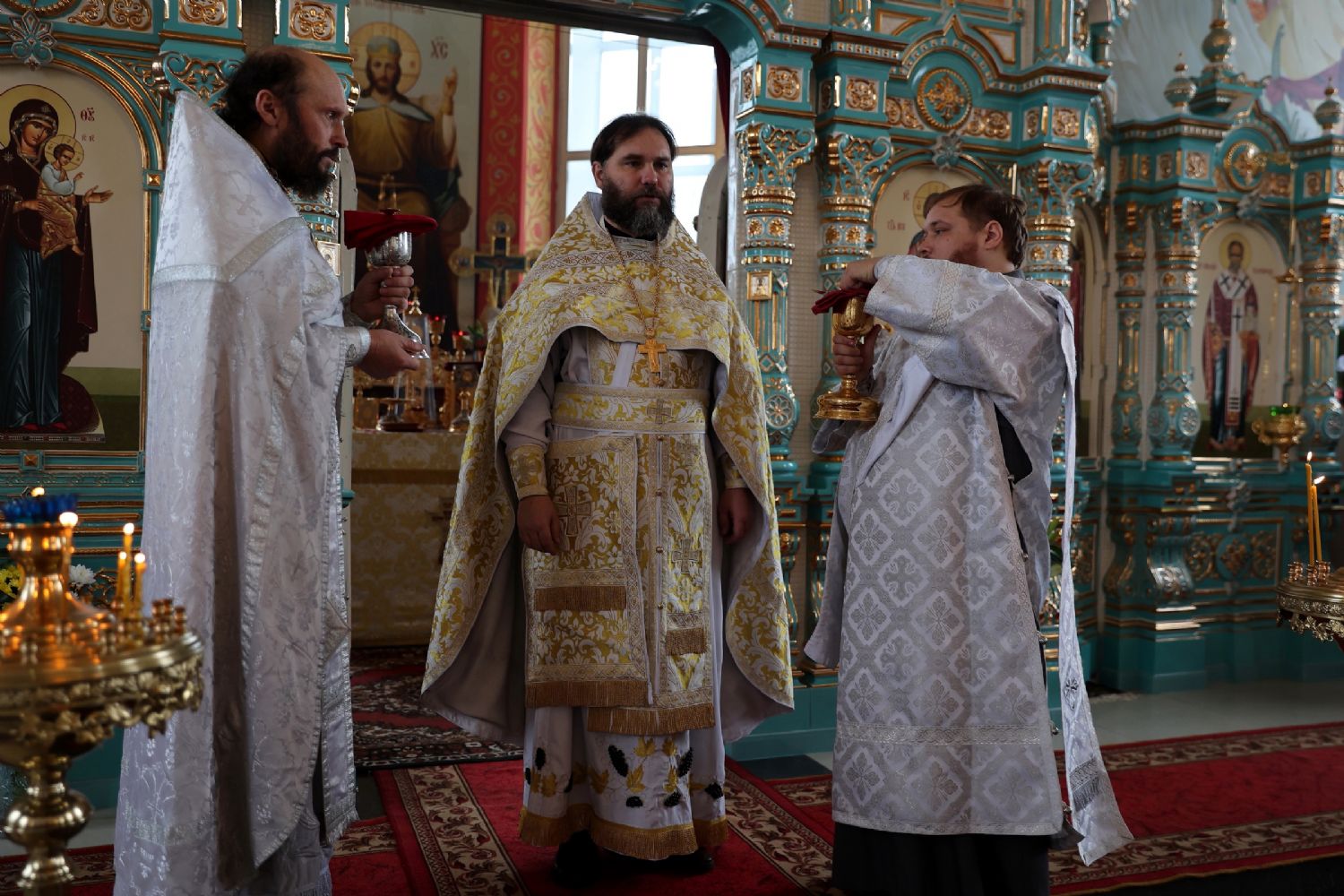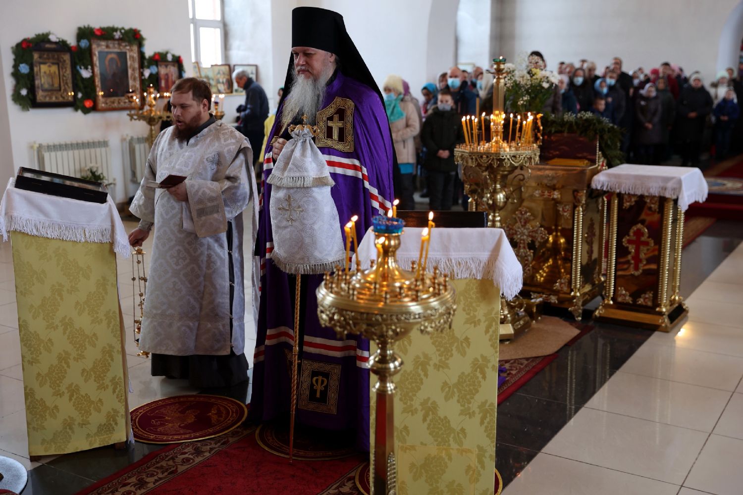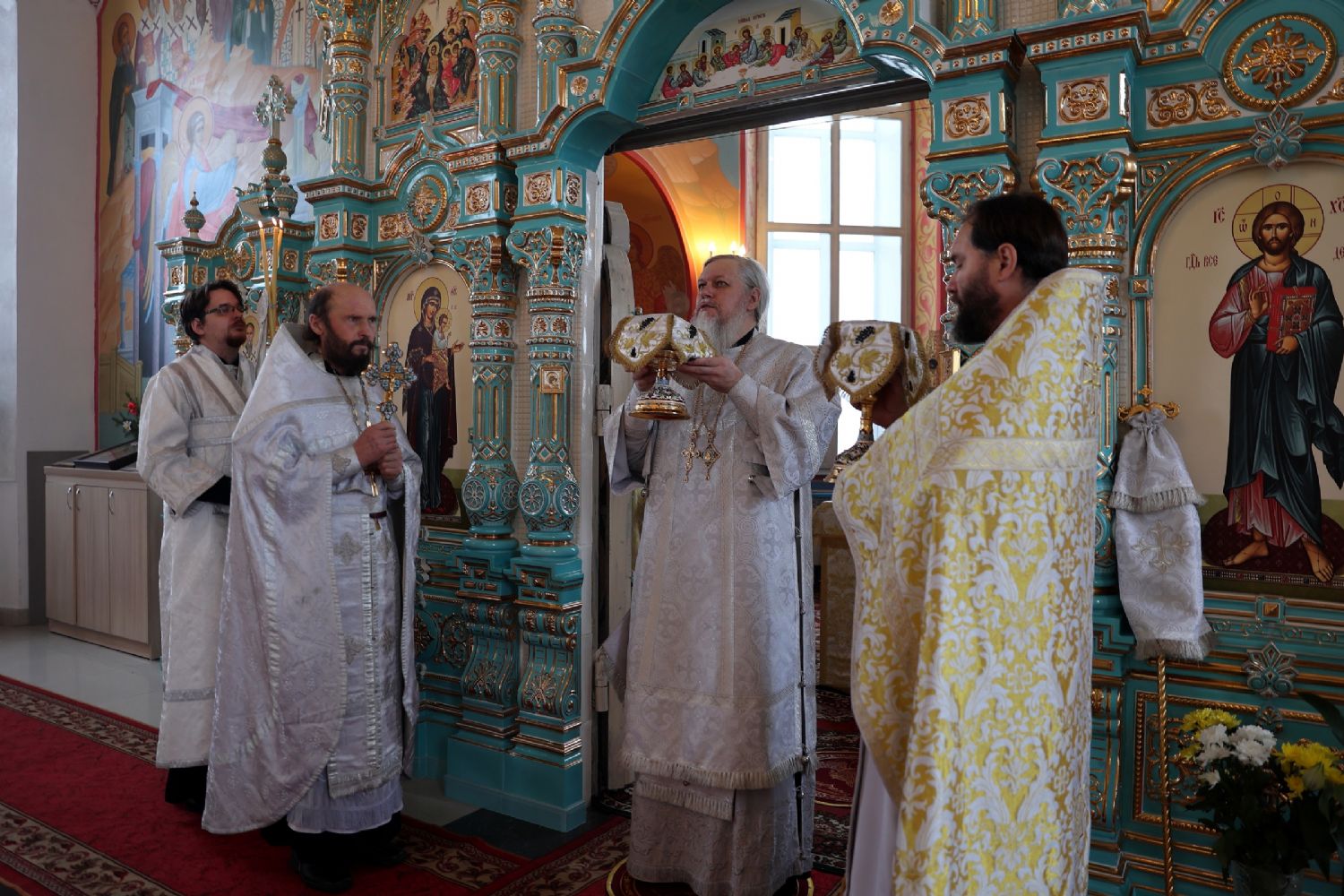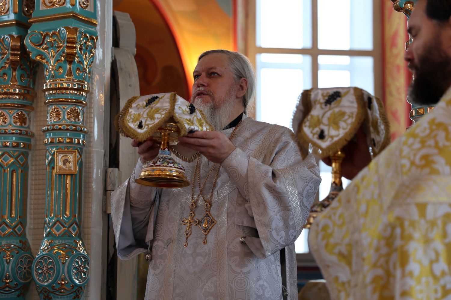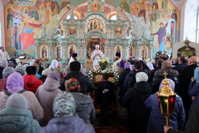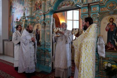 Его Преосвященству сослужили настоятель храма протоиерей Владимир Власов, настоятель храма Покрова Пресвятой Богородицы с. Марисола протоиерей Сергий Сильдушкин, клирик Никольского собора г. Волжска диакон Иоанн Захаров. Песнопения исполнял хор храма.