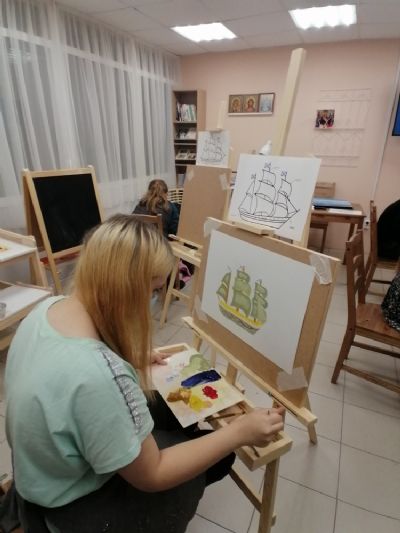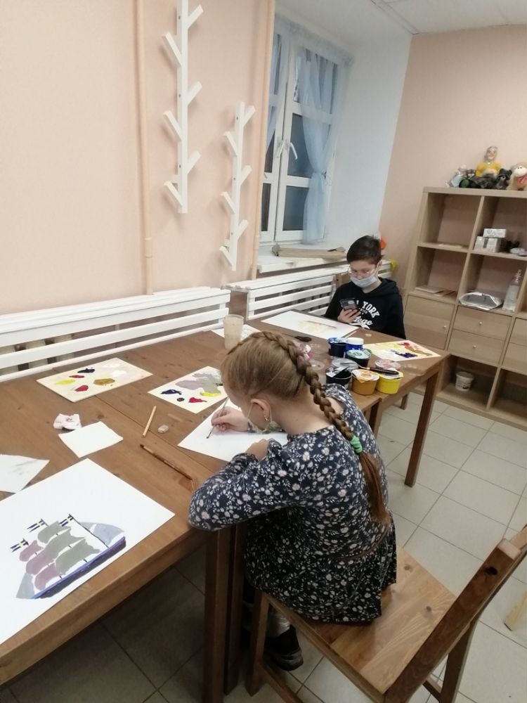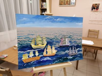 По задумке педагога, ребятам предстояло выполнить коллективную работу, отражающую морское сражение между Швецией и Россией. Корабли неприятеля выполнялись в холодных, темных тонах, российские – в светлых, солнечных, что усилило контраст, противостояние и вызвало патриотический настрой юных художников и зрителей. Готовые корабли были аккуратно вырезаны и наклеены на общий холст, изображающий море – таким образом получилась картина морского боя.