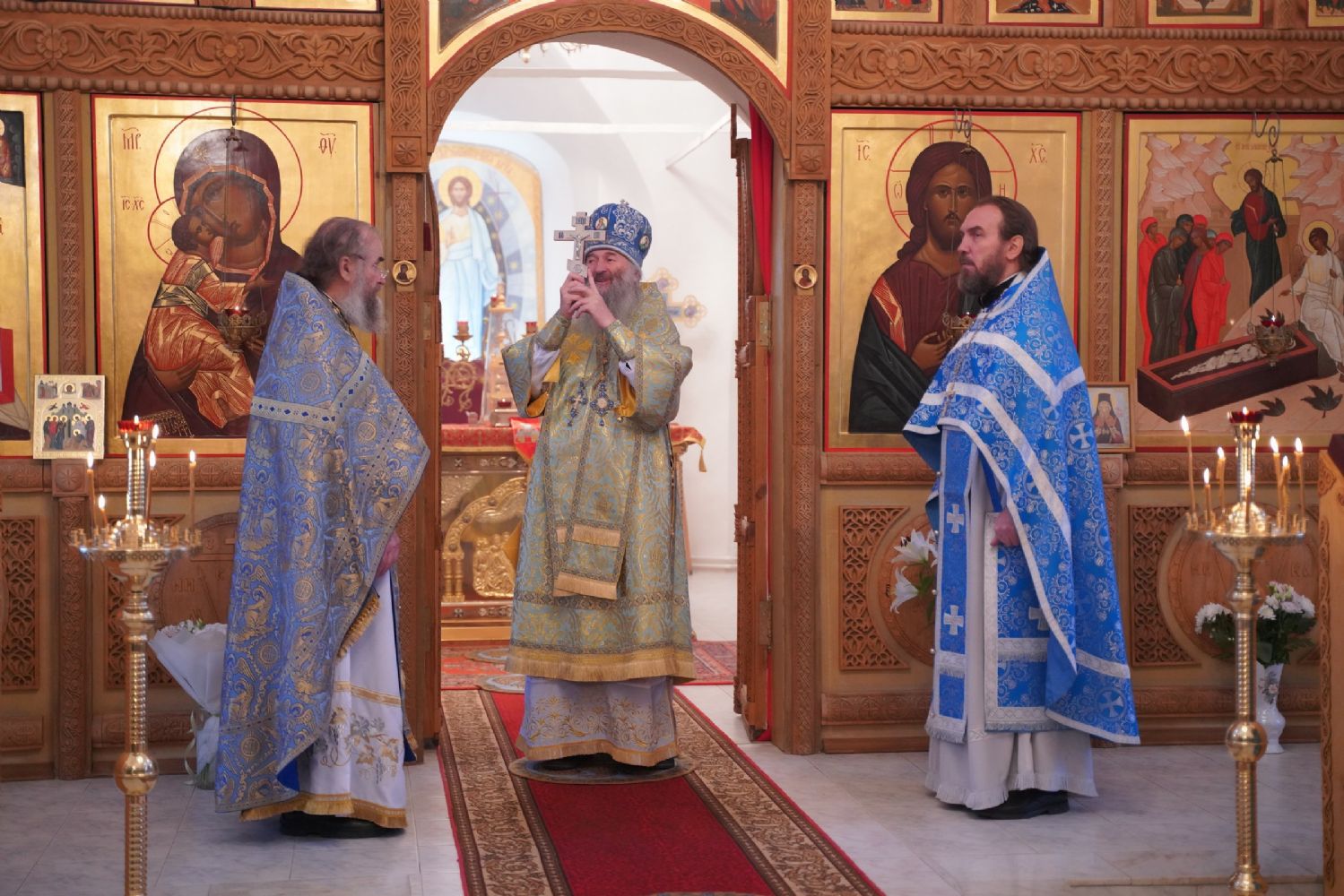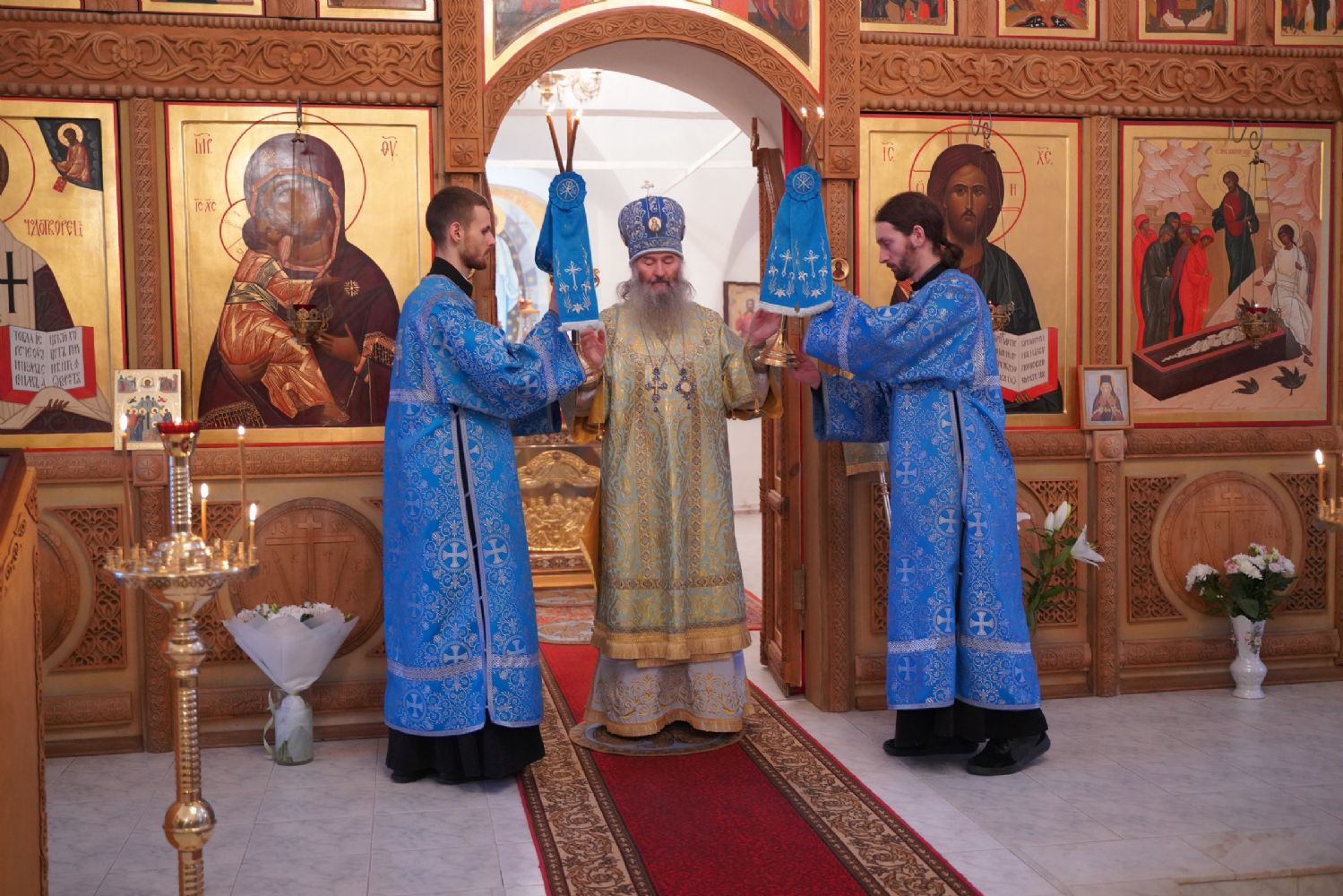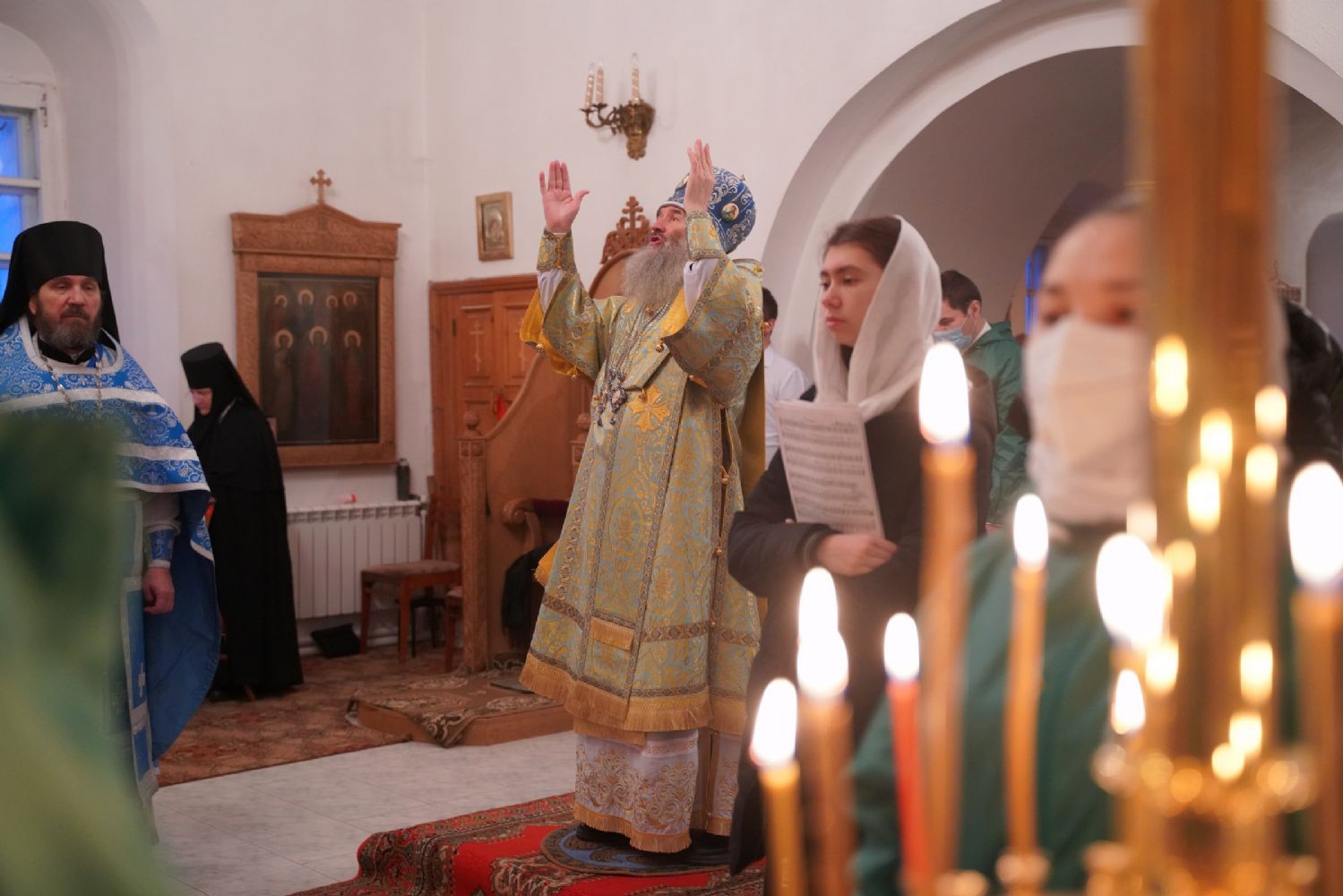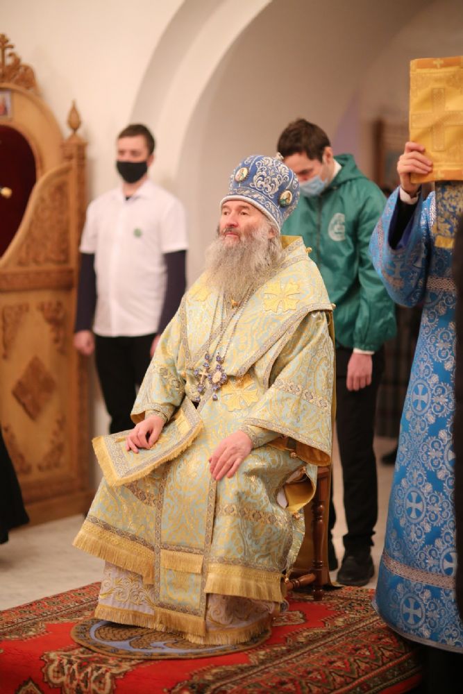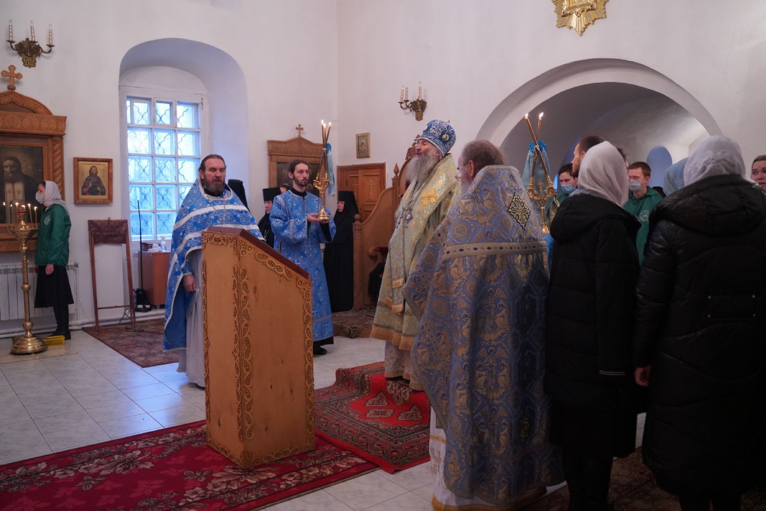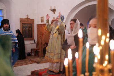 За Литургией архипастырю сослужили секретарь Йошкар-Олинского епархиального управления иеромонах Серафим (Пасанаев), клирик монастыря иерей Михаил Лежнин и протодиакон Михаил Козловский. Песнопения исполнял детско-юношеский хор «Благовест» под руководством регента Татьяны Черновой.