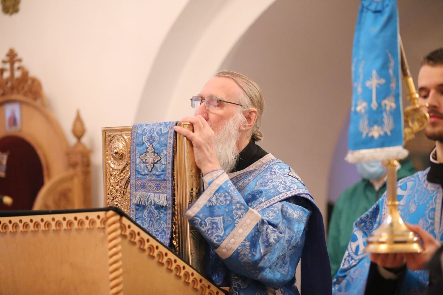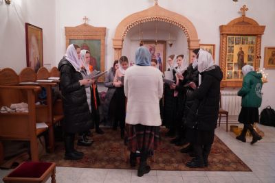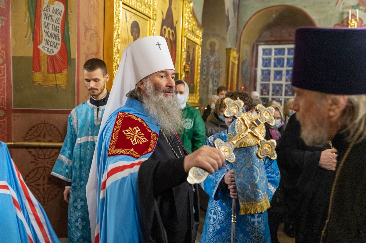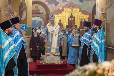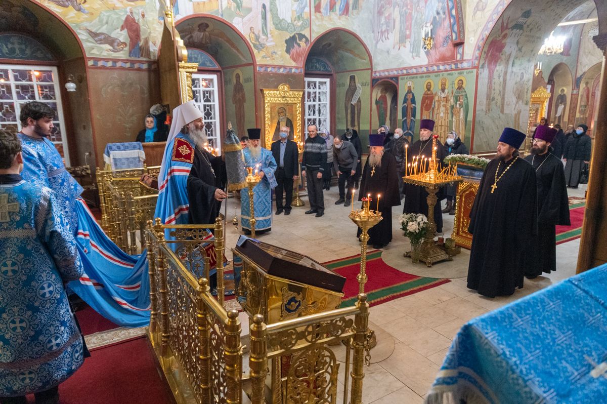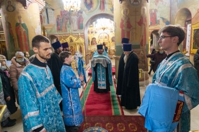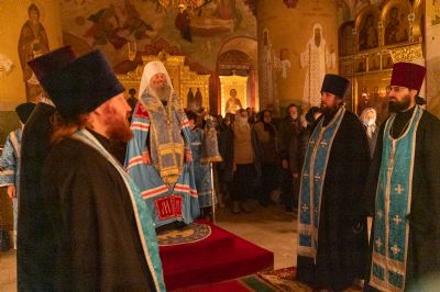 После Литургии владыка с сослужащими совершили славление: пропели тропарь, кондак и величание праздника Введения во храм Пресвятой Богородицы.