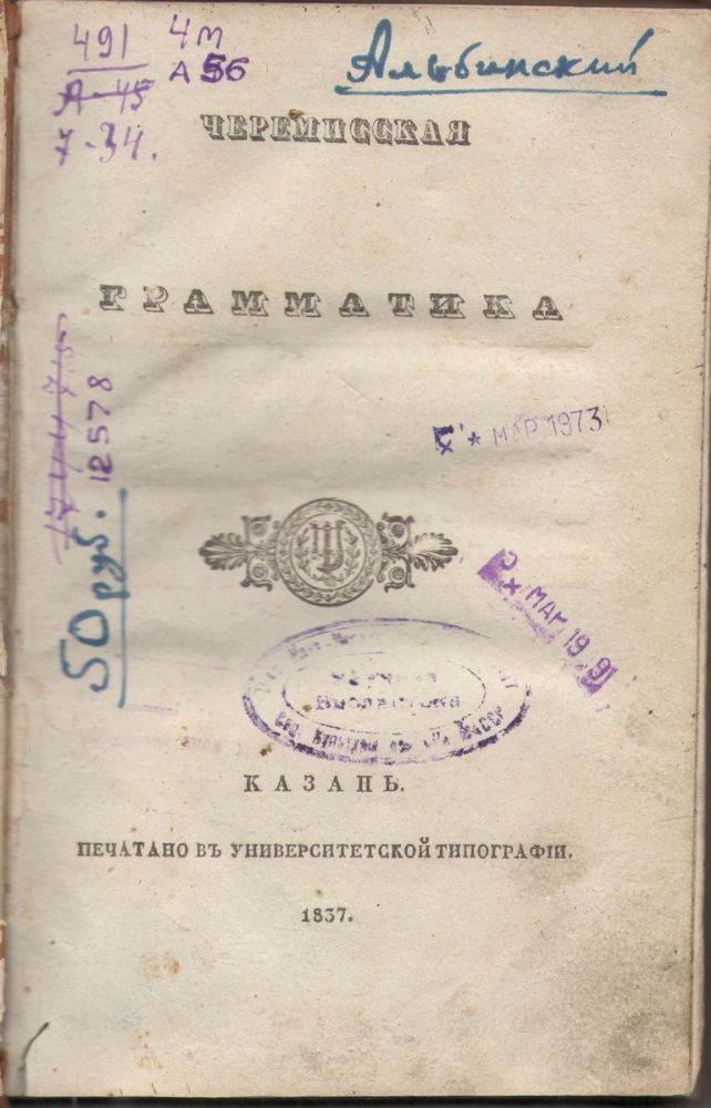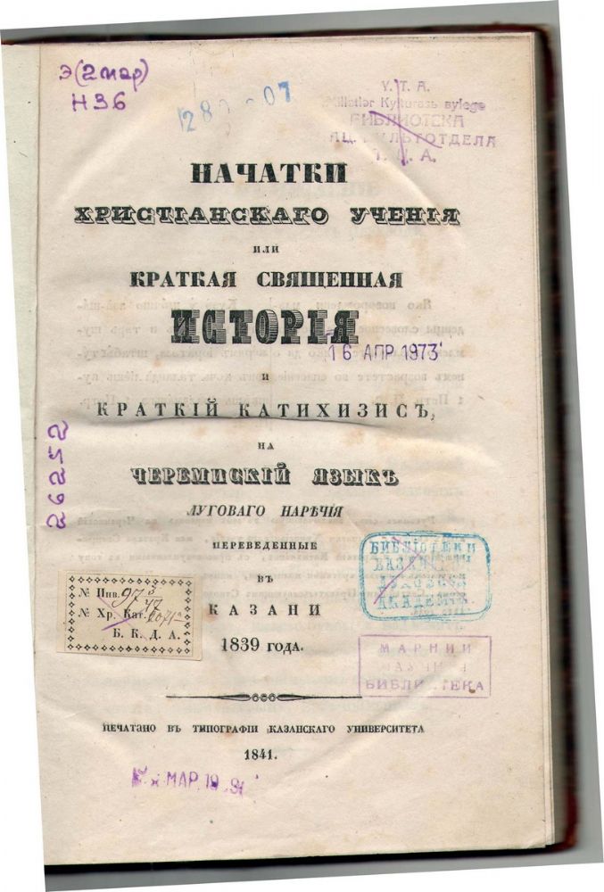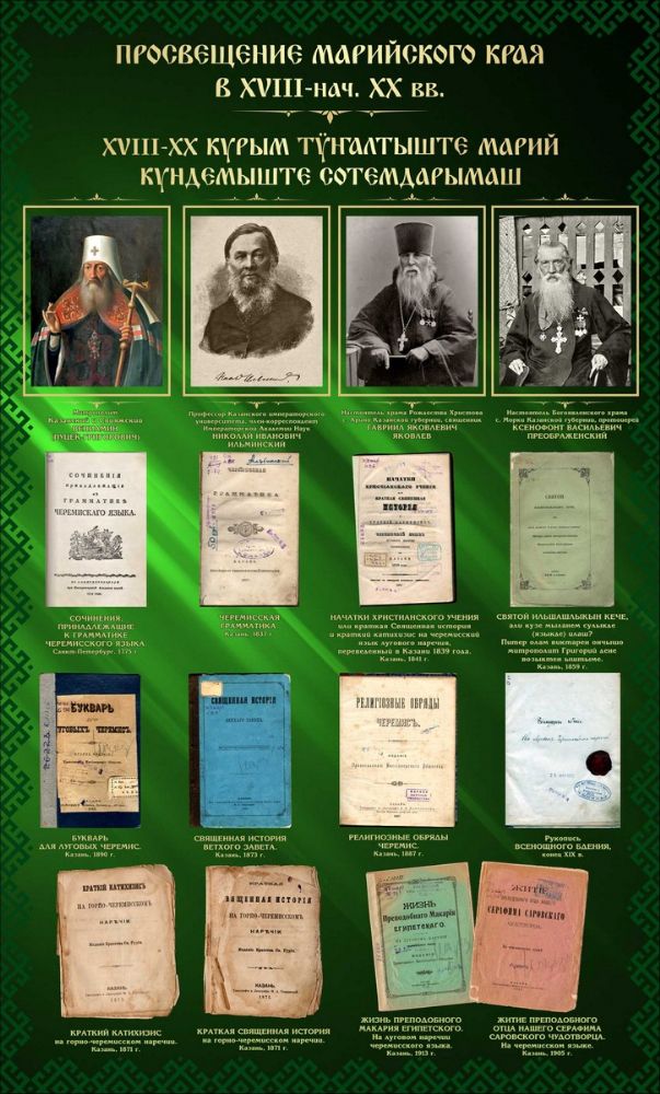 Первой книгой, напечатанной на марийском языке, стал «Сокращенный катехизис» (1804 г.) – книга, в которой в краткой форме раскрываются основы православного вероучения и нравственности. В последующие годы были изданы Евангелие, марийские буквари диакона Иоанна Михайловича Кедрова и священника Гавриила Яковлева, «Черемисская грамматика» протоиерея Феодора Васильева и многие другие.