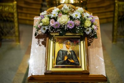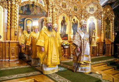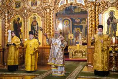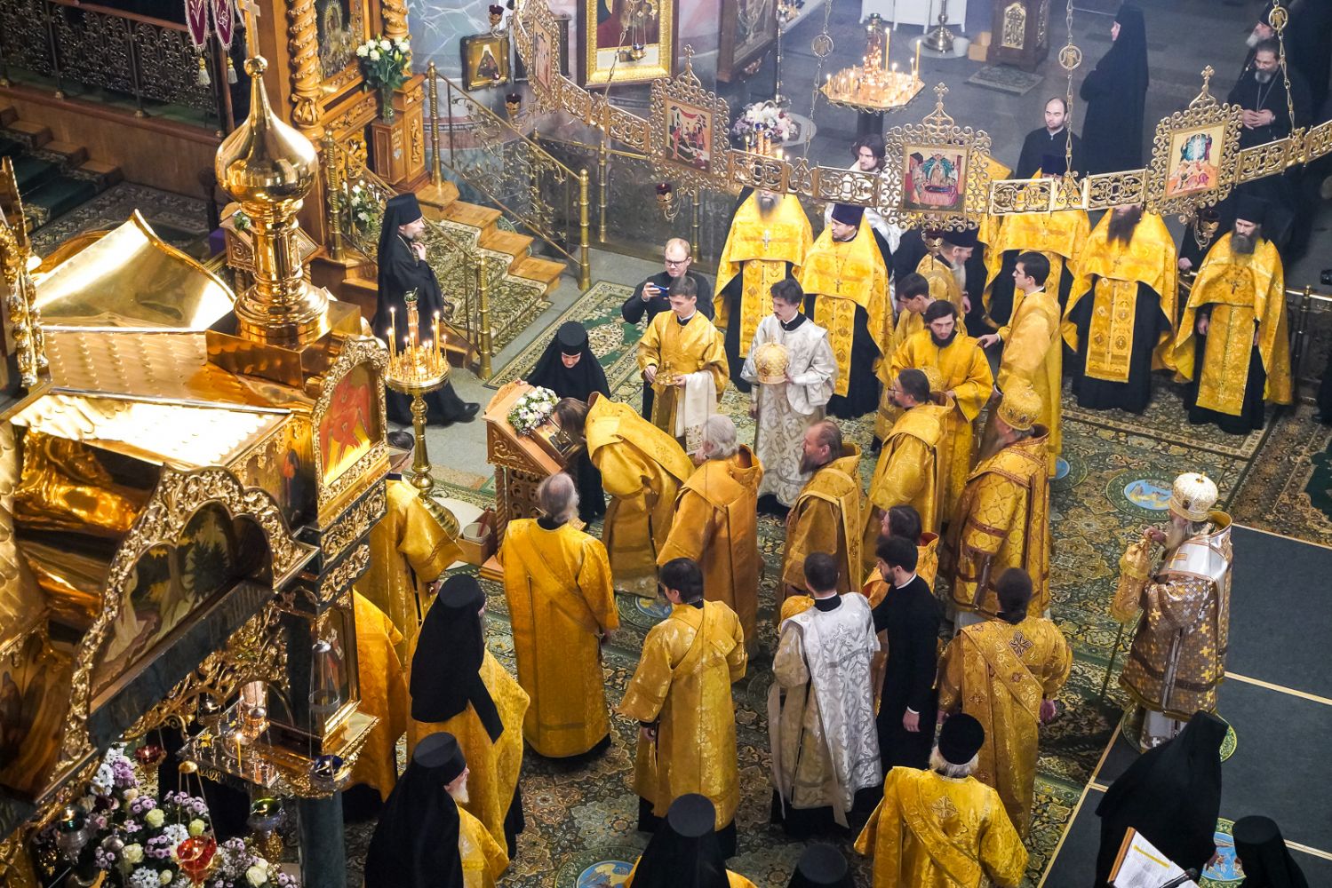 Богослужение состоялось в Троицком соборе обители, где постоянно пребывает рака со святыми мощами преподобного Серафима Саровского.