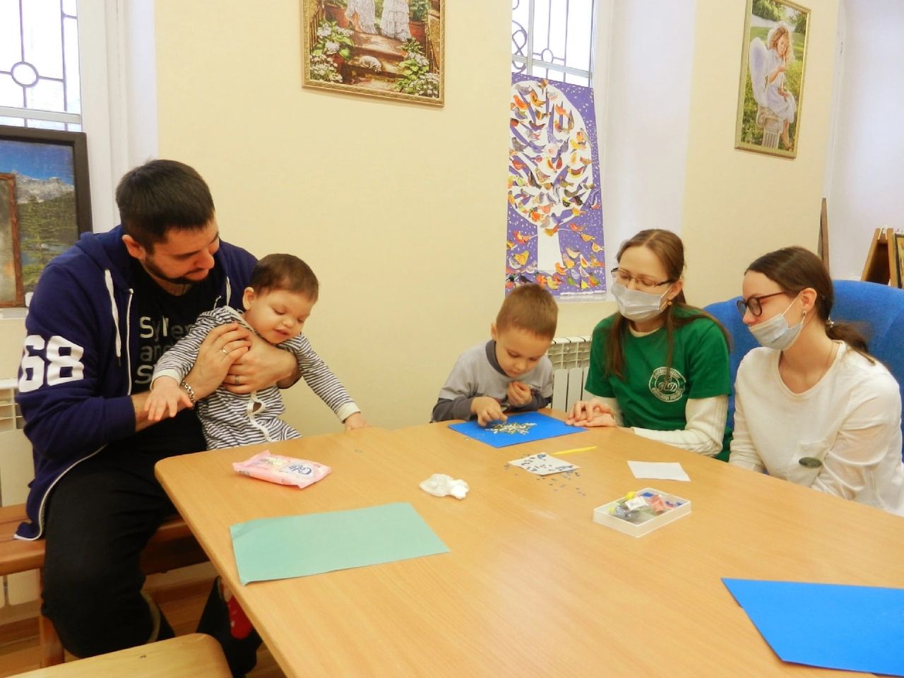 В ожидании гостей девушки-добровольцы нарядили новогоднюю елку и разделили комнату на две творческих зоны: в одной проходил мастер-класс по рукоделию для мам, а в другой – дети при помощи добровольцев изготовляли праздничные поделки.