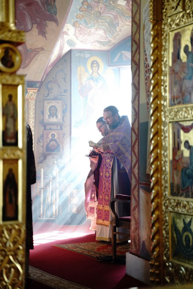 По заамвонной молитве перед Царскими вратами духовенство совершило молебный канон великомученику Феодору Тирону, и владыка освятил коливо.