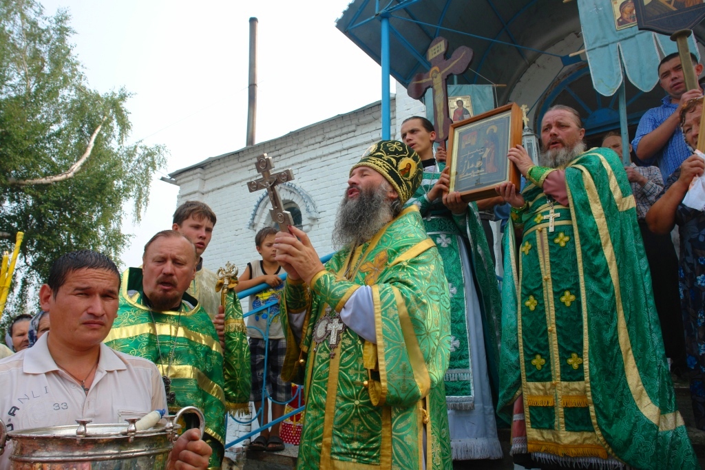 После литургии был совершен крестный ход вокруг храма, Владыка всех присутствовавших окропил святой водой. Все остались очень довольны от посещения прихода своим Архипастырем.