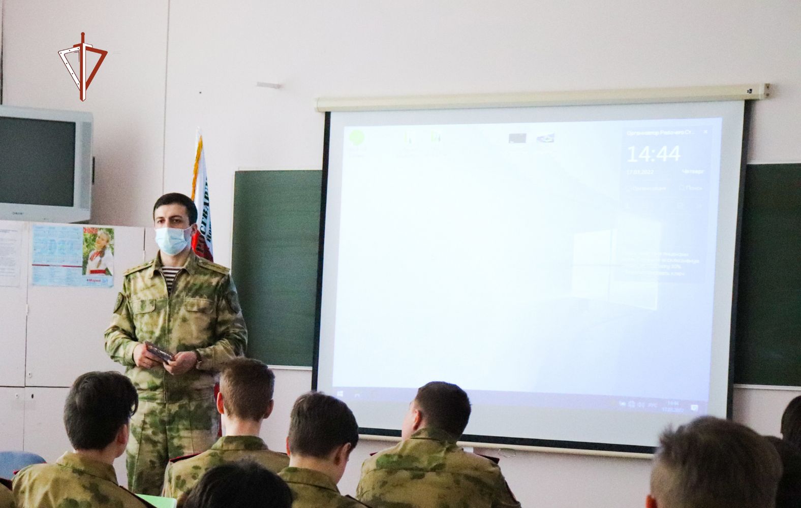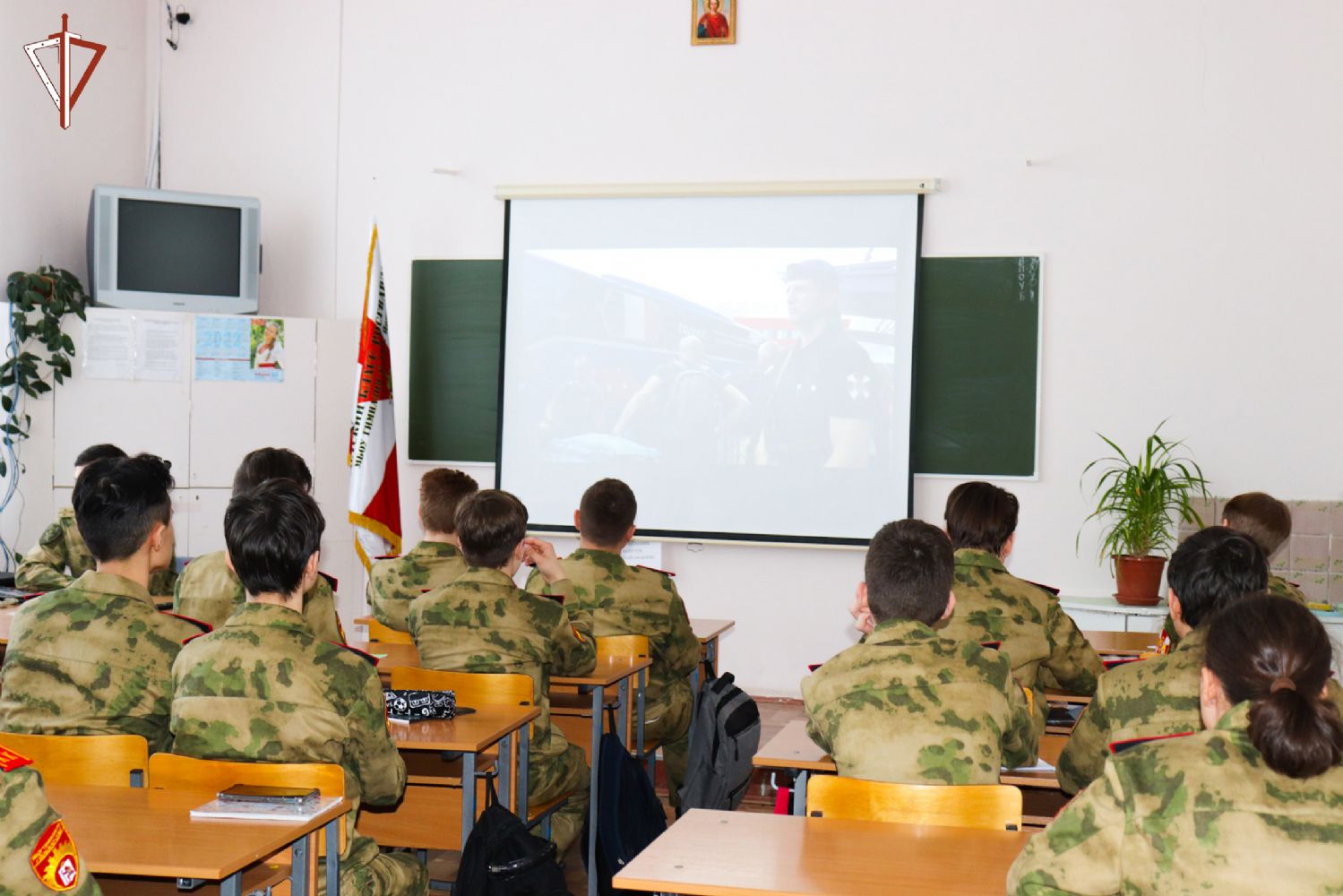 Капитан Руслан Абдуллаев рассказал ребятам и о героических поступках сотрудников и военнослужащих, выполнявших свой служебный долг, о традициях и значимых символах войск правопорядка, одним из которых является право на ношение крапового берета, и продемонстрировал им информационный видеофильм о служебно-боевой деятельности ведомства.