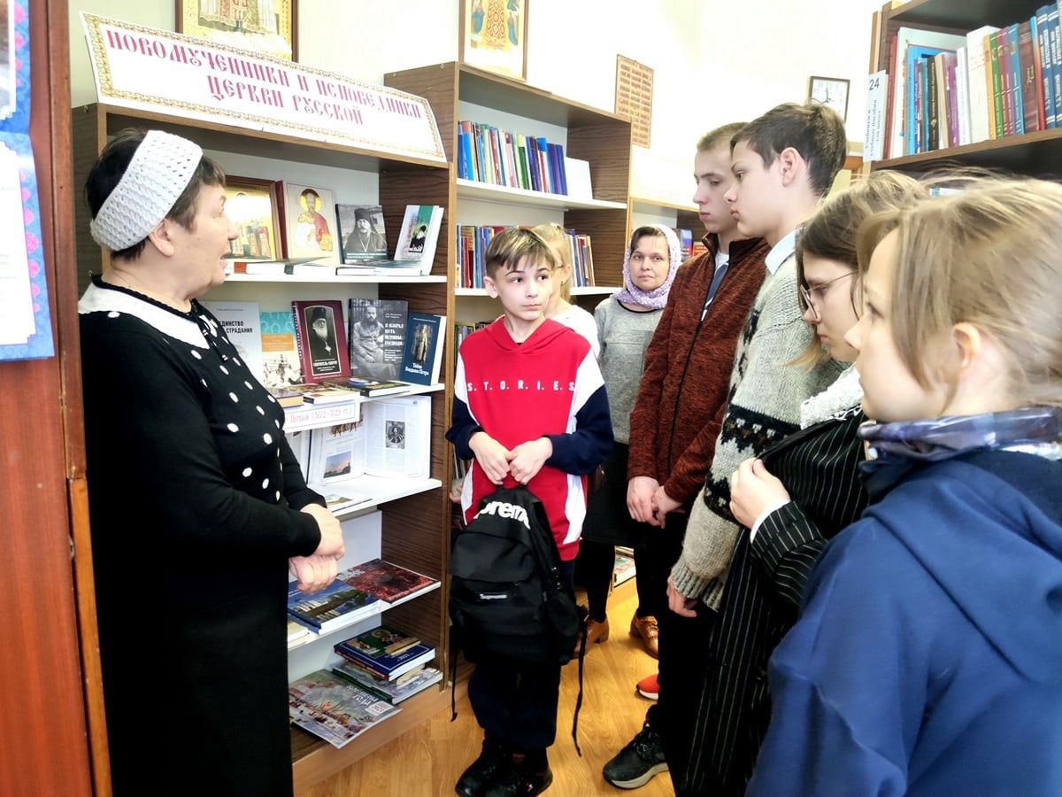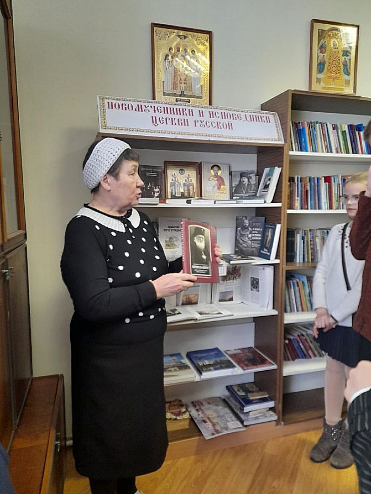 Старший библиотекарь храма Галина Сергеевна Астафьева рассказала ребятам об истории праздника, ознакомила их с книжным фондом библиотеки, а также показала книжные выставки, посвященные новомученикам и исповедникам Церкви Русской, которым посвящен нынешний 2022 год. Работники библиотеки рассказали ребятам о некоторых святых ХХ века, проявивших в годы испытаний мужество и твердость в вере.