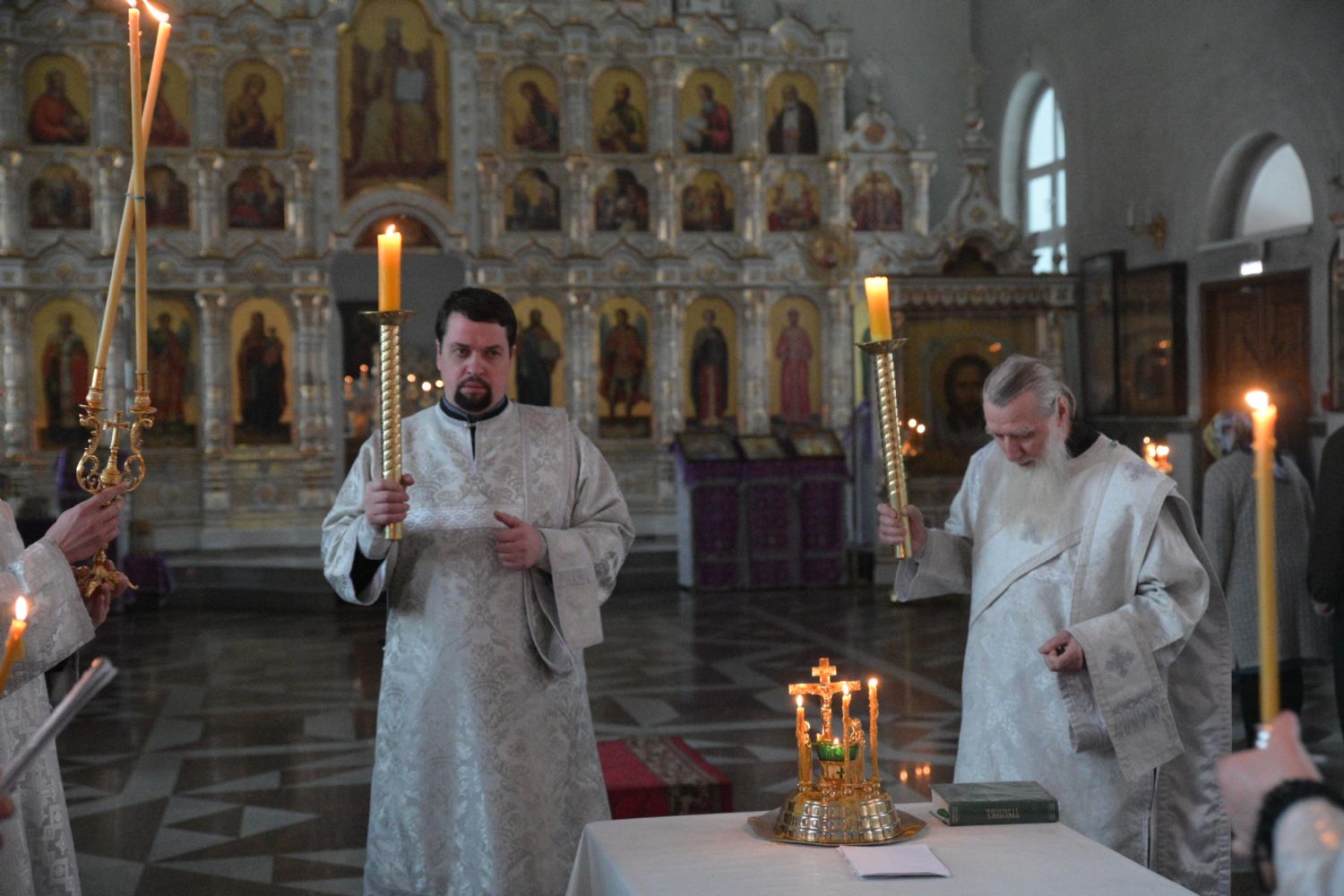 Владыке сослужили секретарь Йошкар-Олинского епархиального управления иеромонах Серафим (Пасанаев), настоятель собора иерей Алексий Кирюшкин, клирики собора и протодиакон Михаил Козловский. Песнопения исполнял хор собора под управлением регента Елены Поглазовой.