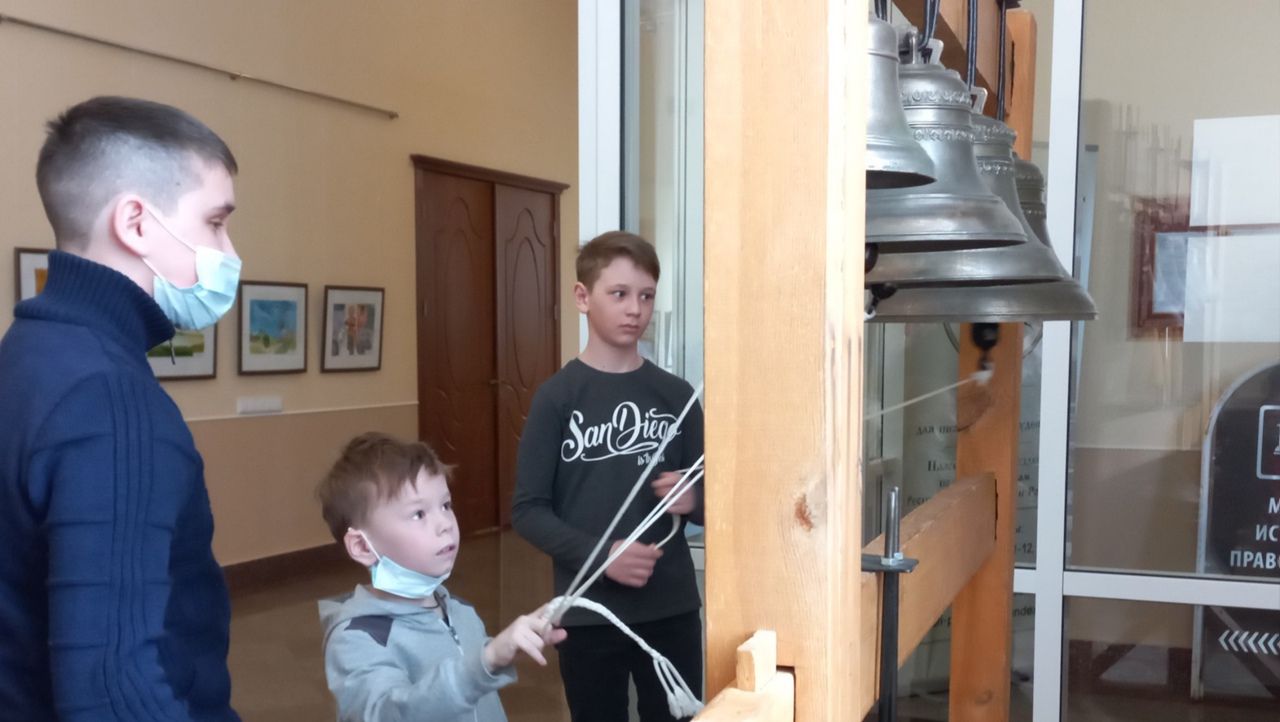 Далее дети посетили зал, посвященный Первой мировой войне. Здесь особенно интересно было мальчикам – они увидели предметы, которыми пользовались солдаты тех времен. В завершение экскурсии ребята представили себя в роли звонарей – им разрешили позвонить в колокола на переносной звоннице.
