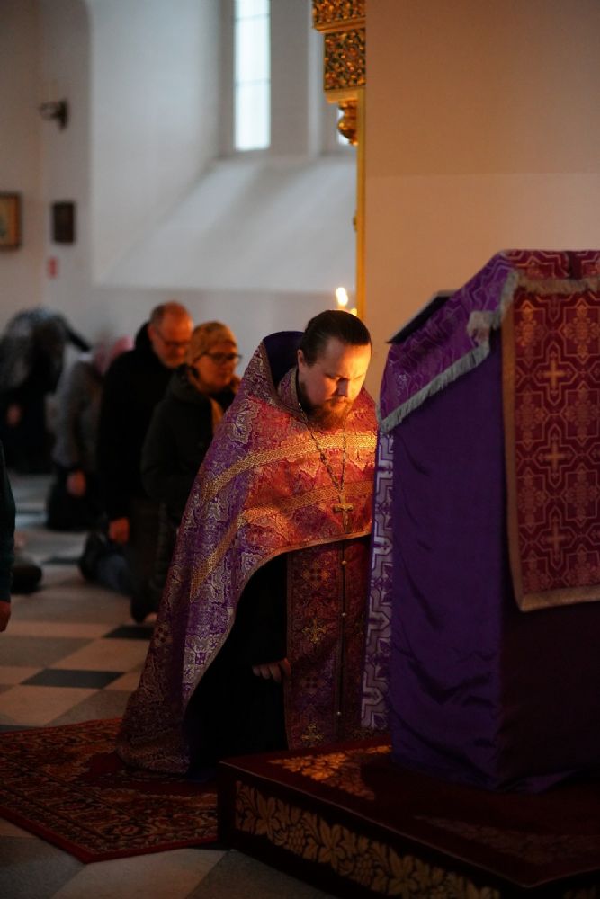 В начале утрени настоятель храма протоиерей Александр Бачурин прочитал с амвона первую часть жития преподобной Марии. Затем в центре храма митрополит Иоанн прочитал первые две песни Великого канона, а третью - иеромонах Серафим. После этого прихожане услышали вторую часть жития Марии Египетской.