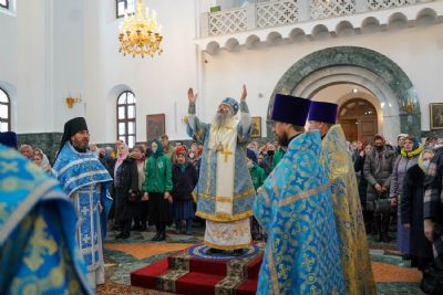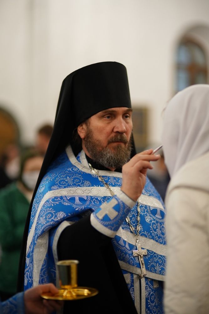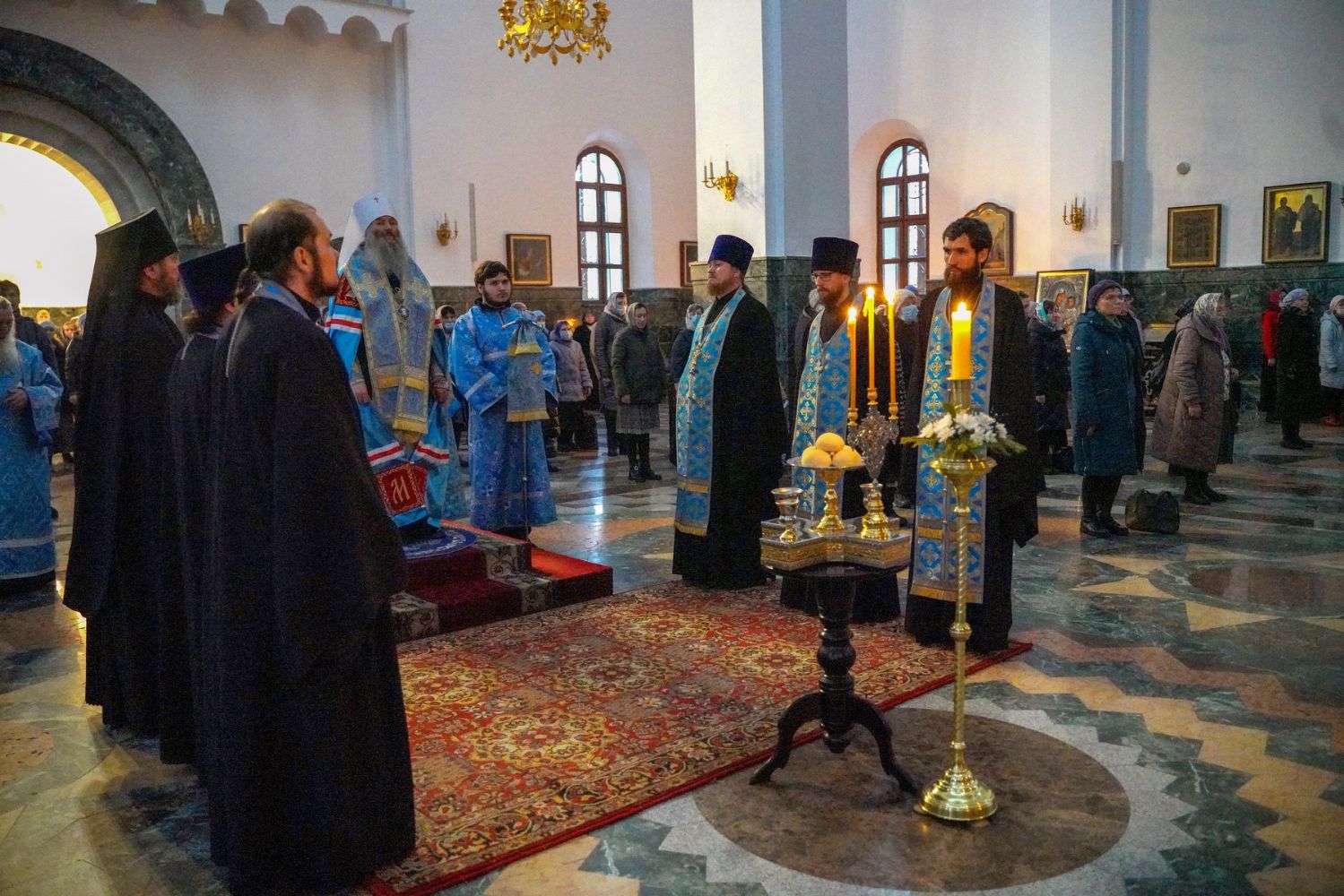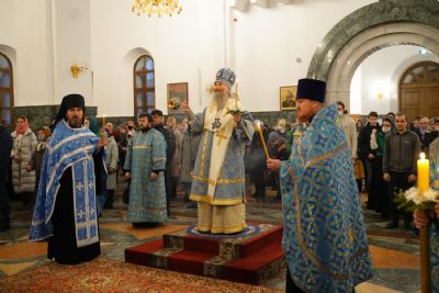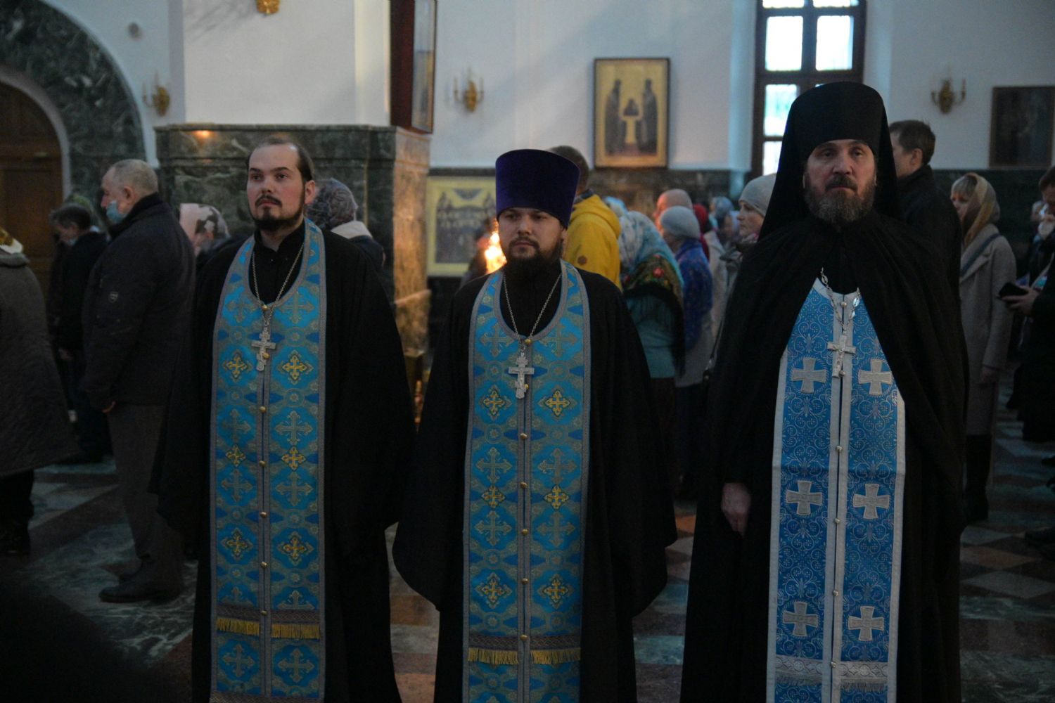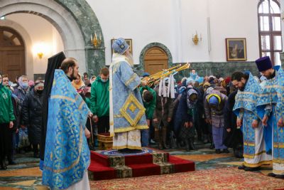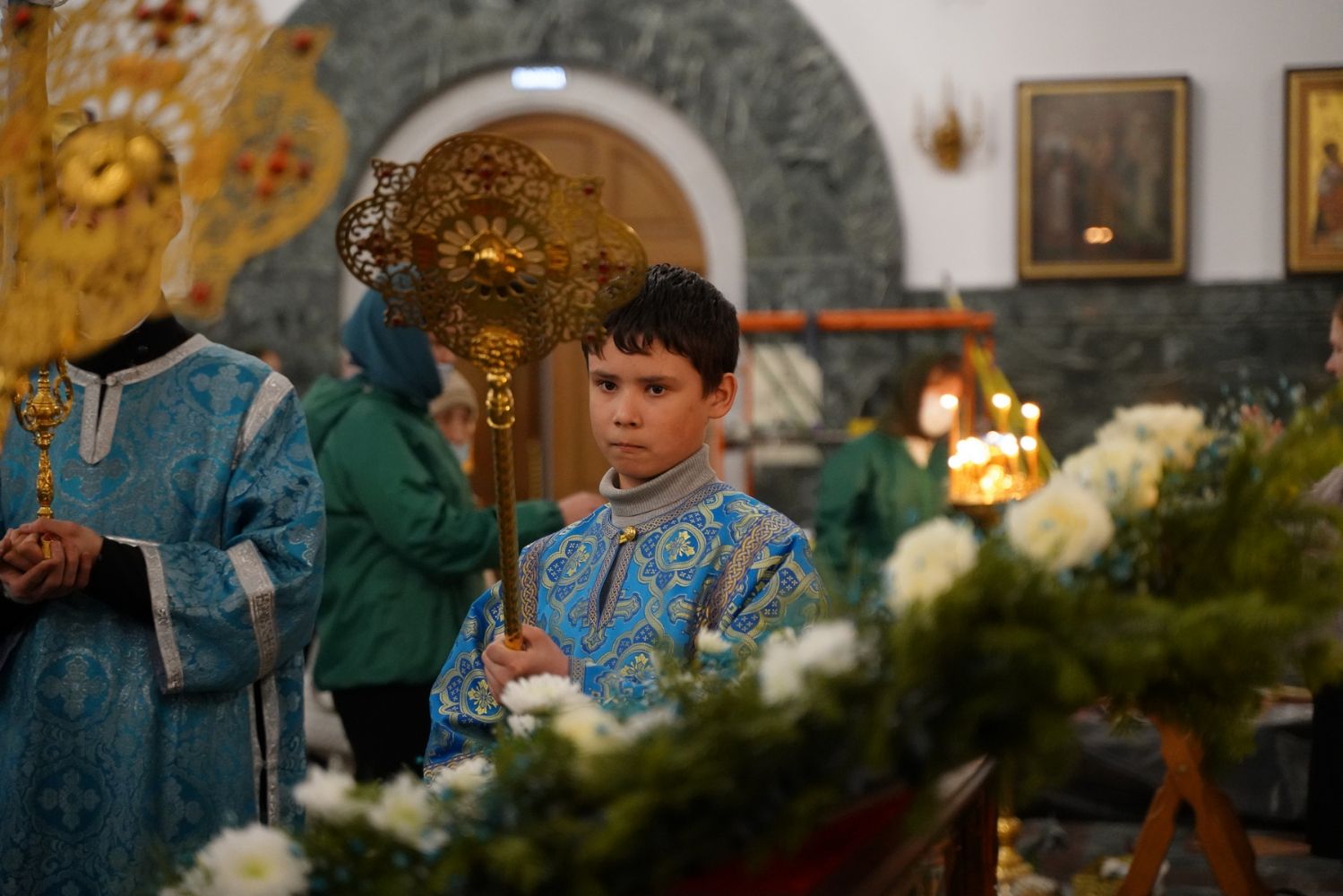 Его Высокопреосвященству сослужили секретарь Йошкар-Олинского епархиального управления иеромонах Серафим (Пасанаев), ключарь собора протоиерей Сергий Поглазов, клирики собора и протодиакон Михаил Козловский. Песнопения исполнял детско-юношеский хор «Благовест» под управлением регента Татьяны Черновой.