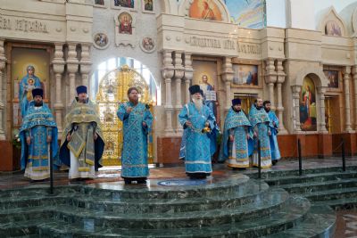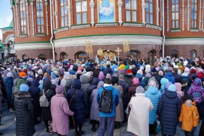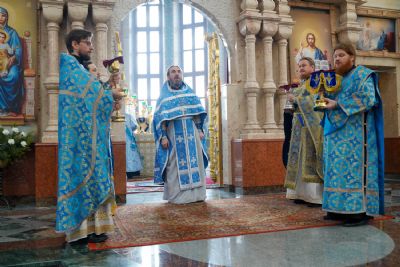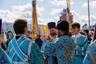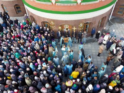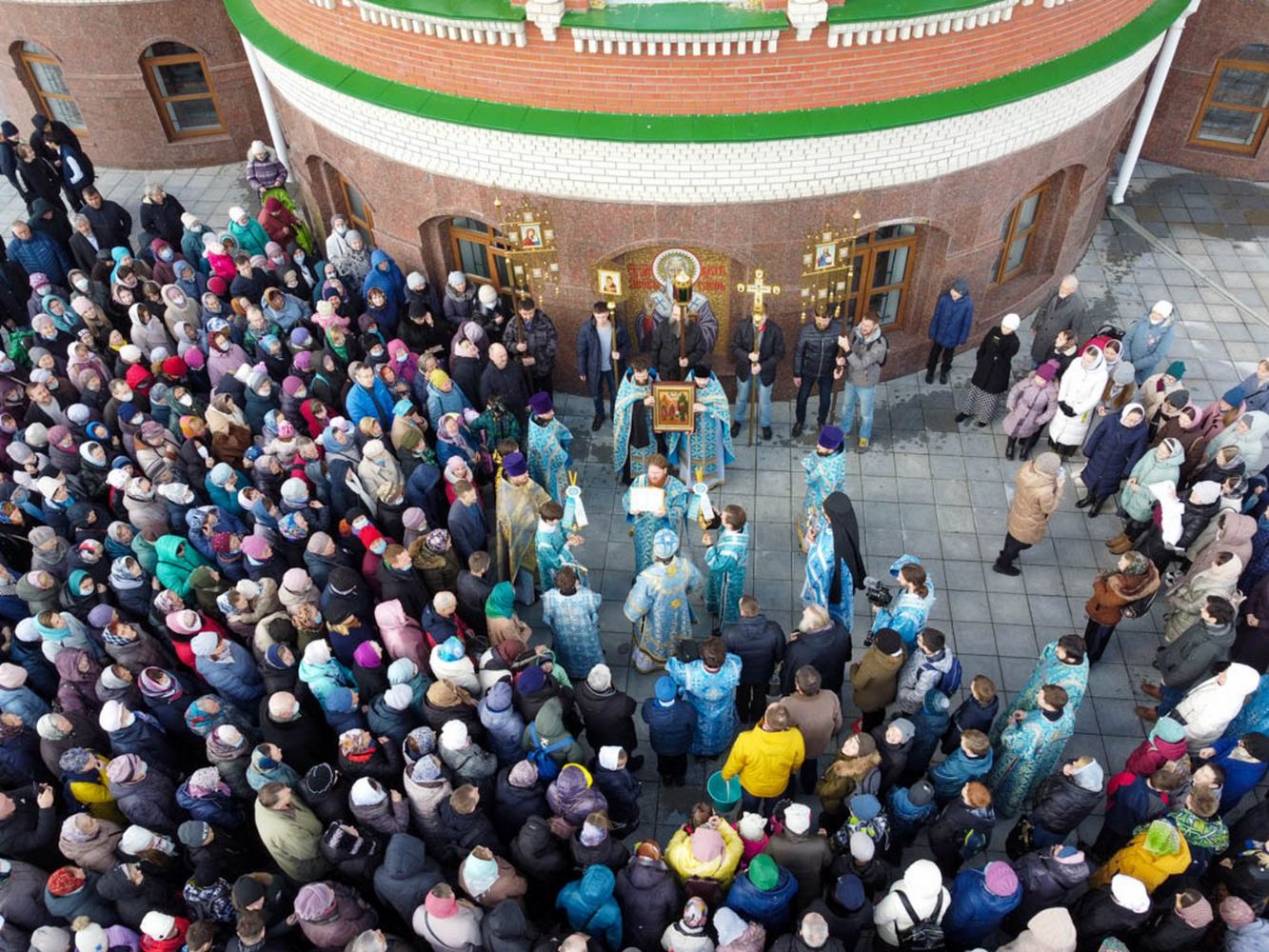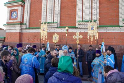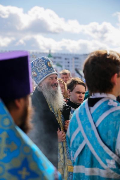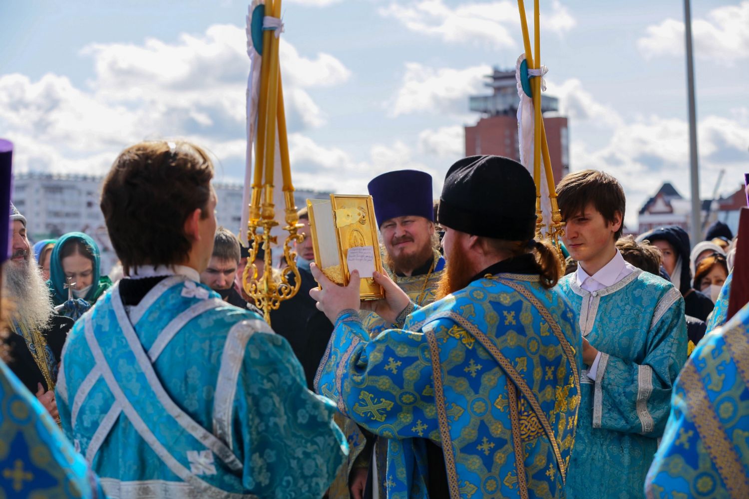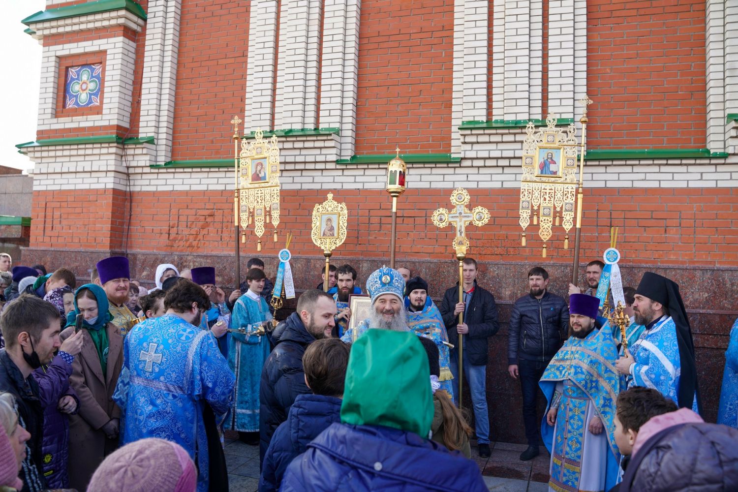 После Литургии в ознаменование престольного праздника состоялся крестный ход вокруг храма с чтением Евангелия и кроплением святой водой. По традиции, сложившейся за последние годы, священство и миряне подошли к скульптурной композиции «Пресвятая Богородица с Младенцем Христом». Здесь верующие вознесли соборную молитву Покровительнице нашего края.