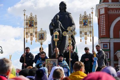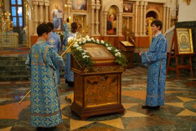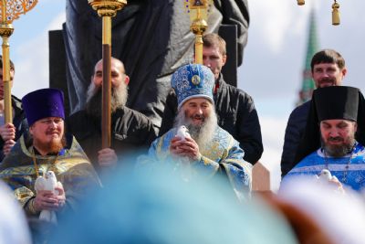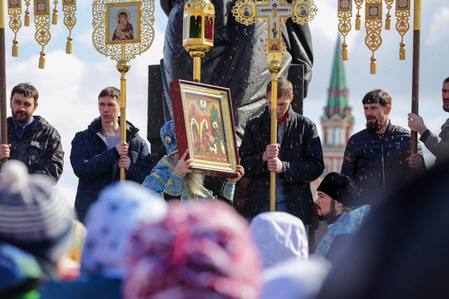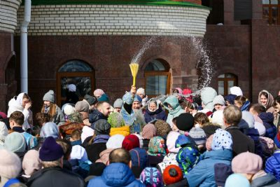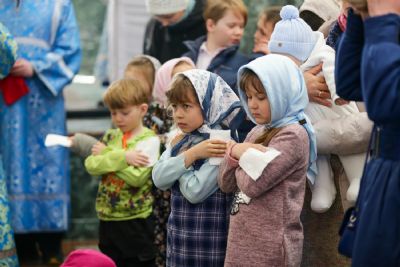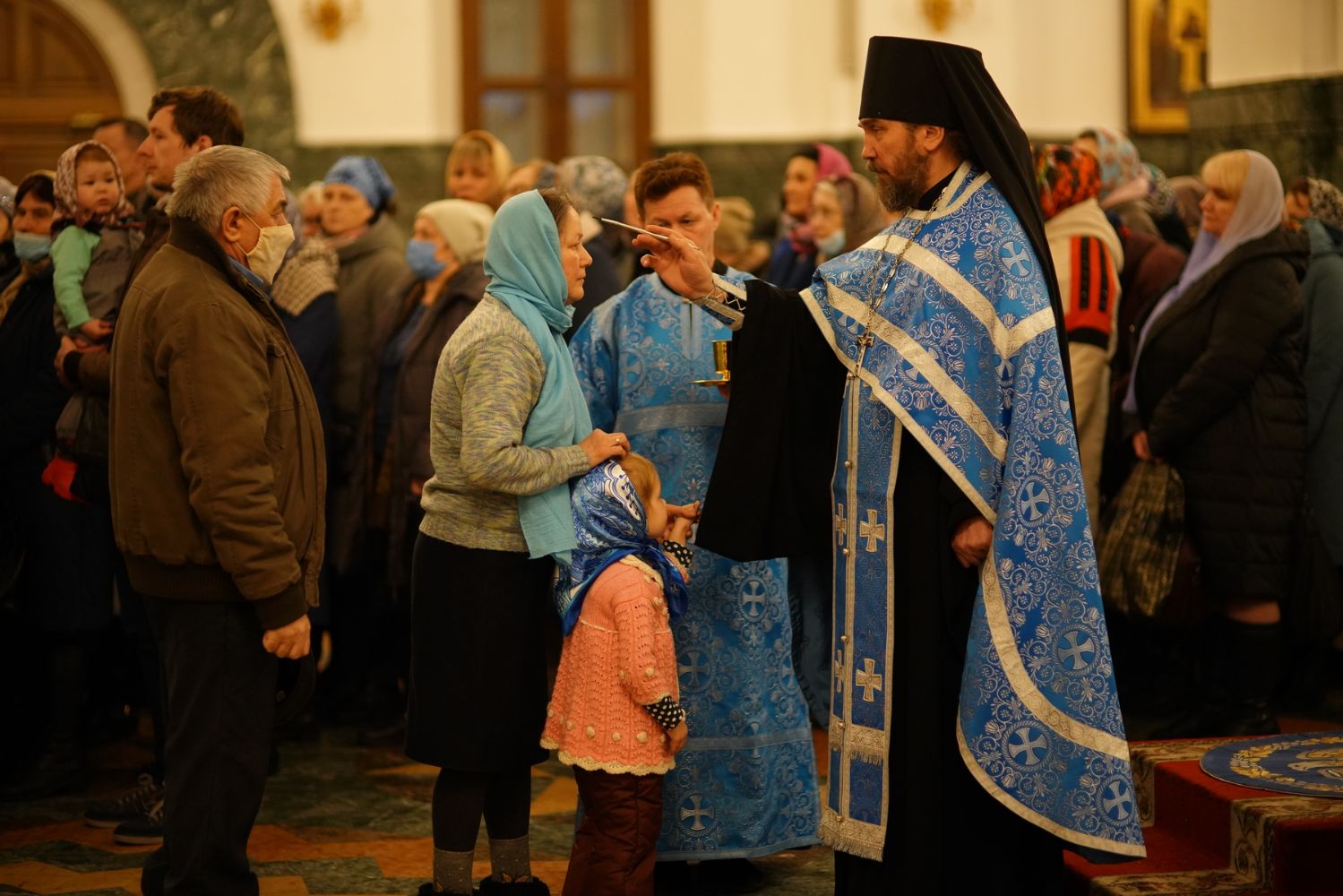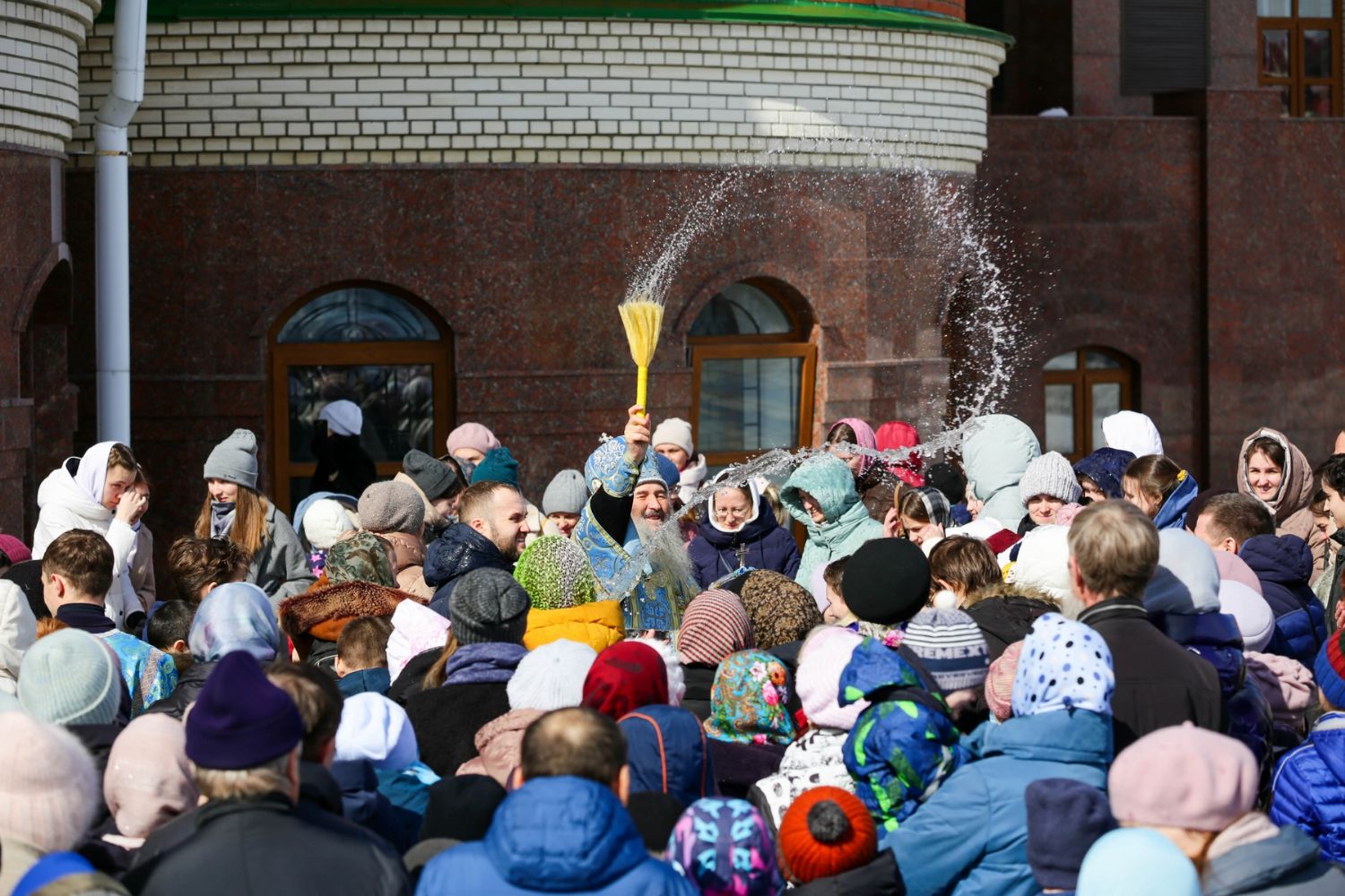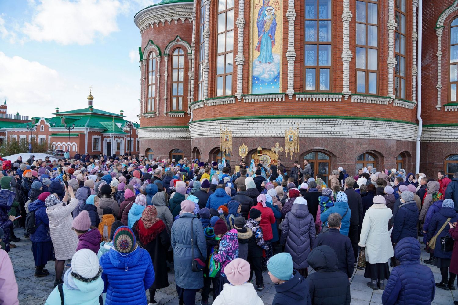 После Литургии в ознаменование престольного праздника состоялся крестный ход вокруг храма с чтением Евангелия и кроплением святой водой. По традиции, сложившейся за последние годы, священство и миряне подошли к скульптурной композиции «Пресвятая Богородица с Младенцем Христом». Здесь верующие вознесли соборную молитву Покровительнице нашего края.