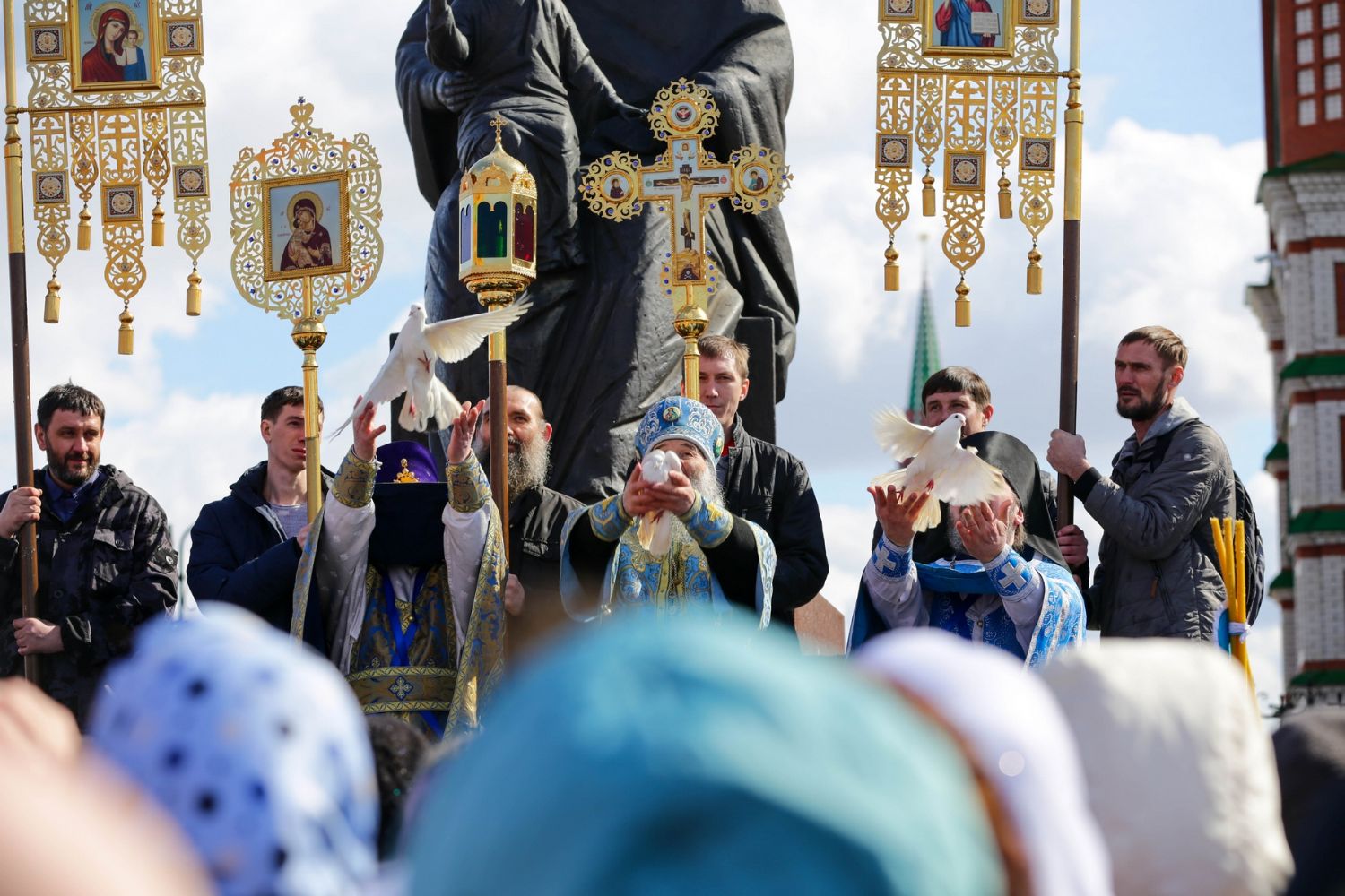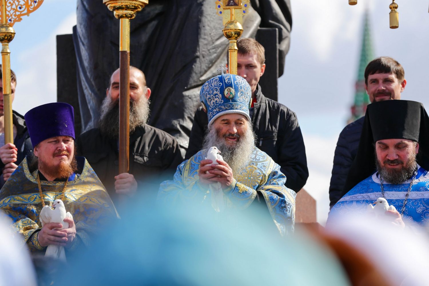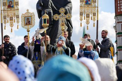 Под пение величания Деве Марии «Архангельский глас…» митрополит Иоанн, иеромонах Серафим и протоиерей Сергий выпустили в небо белых голубей.