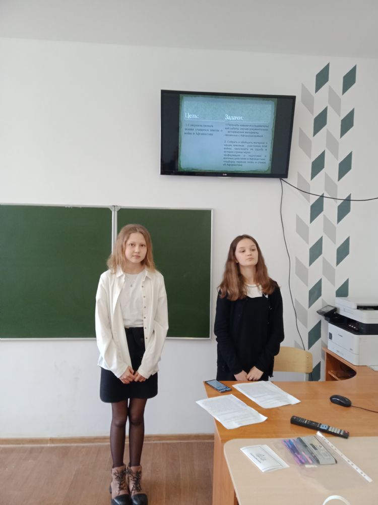С проектом «Герои Афганистана» собравшихся ознакомили ученицы 6 класса Новоарбанской школы Александра Пескова и Алина Назипова. Руководитель проекта – педагог О.В. Смоленцева.