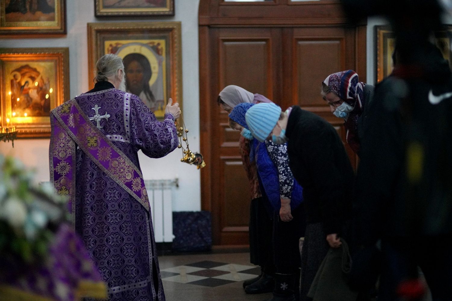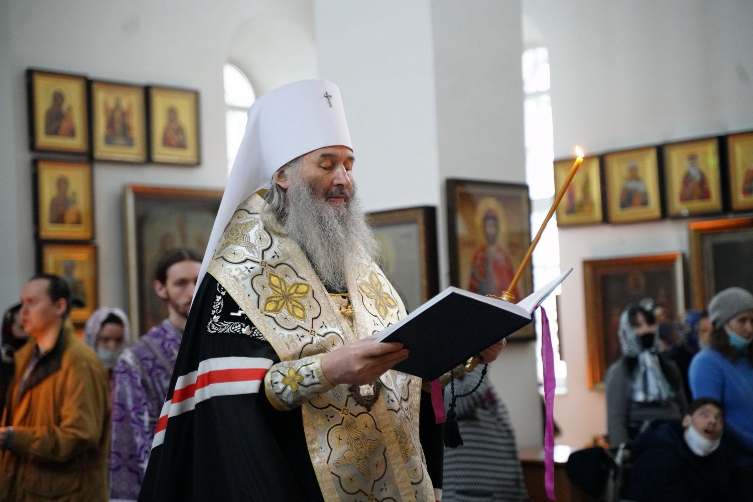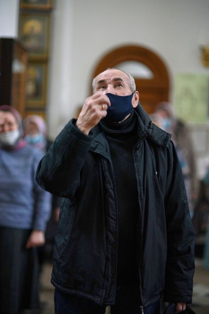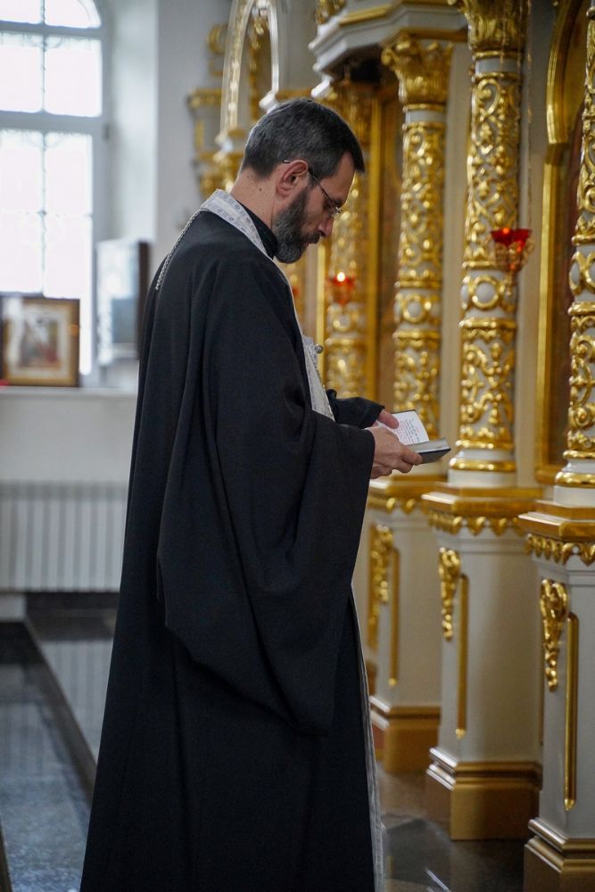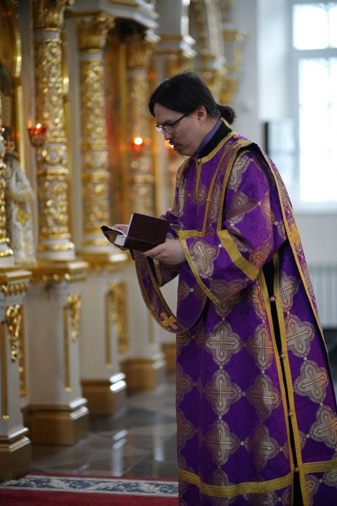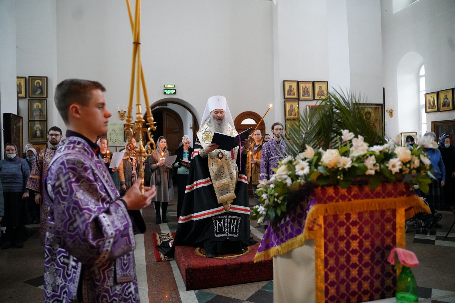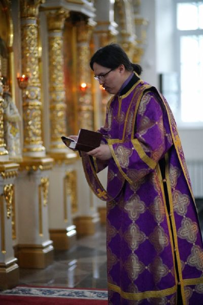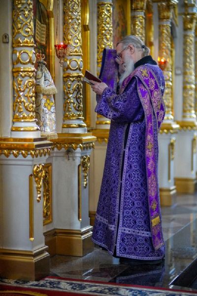 После чтения трех кафизм на утрене в алтаре владыка прочитал отрывок из Евангелия от Иоанна (12 глава), повествующий о вольных страданиях и будущей славе Господа нашего Иисуса Христа и вере в Него.