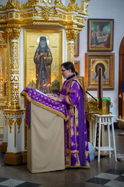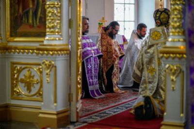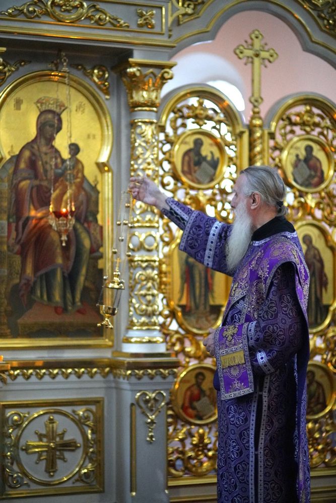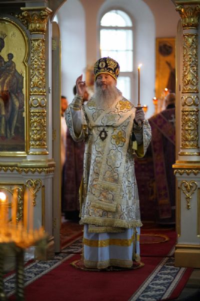 Владыке сослужили секретарь епархиального управления иеромонах Серафим (Пасанаев), настоятель храма иерей Александр Лоскутов, клирики храма и протодиакон Михаил Козловский. Песнопения исполнял хор храма под руководством регента Наталии Поповой.