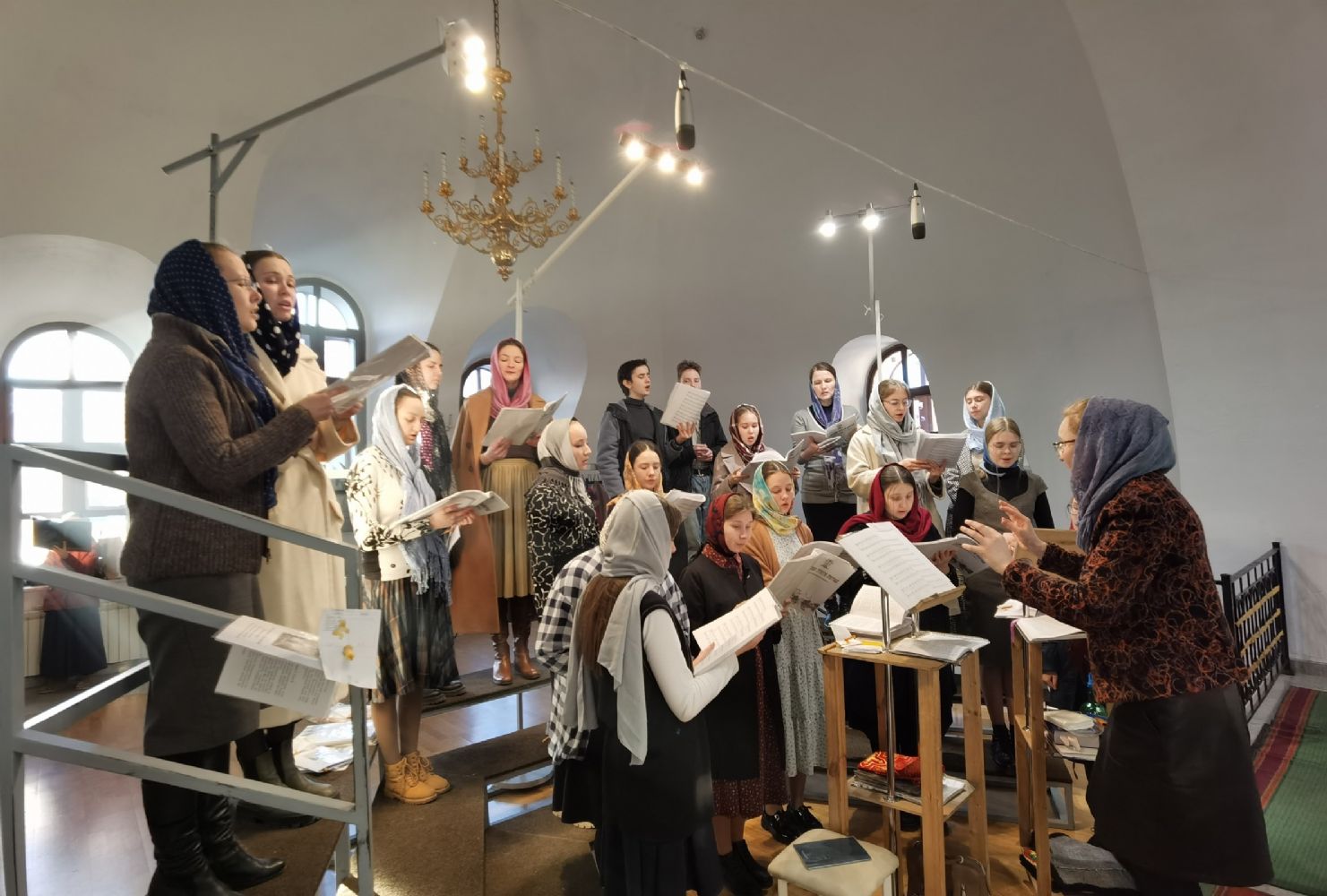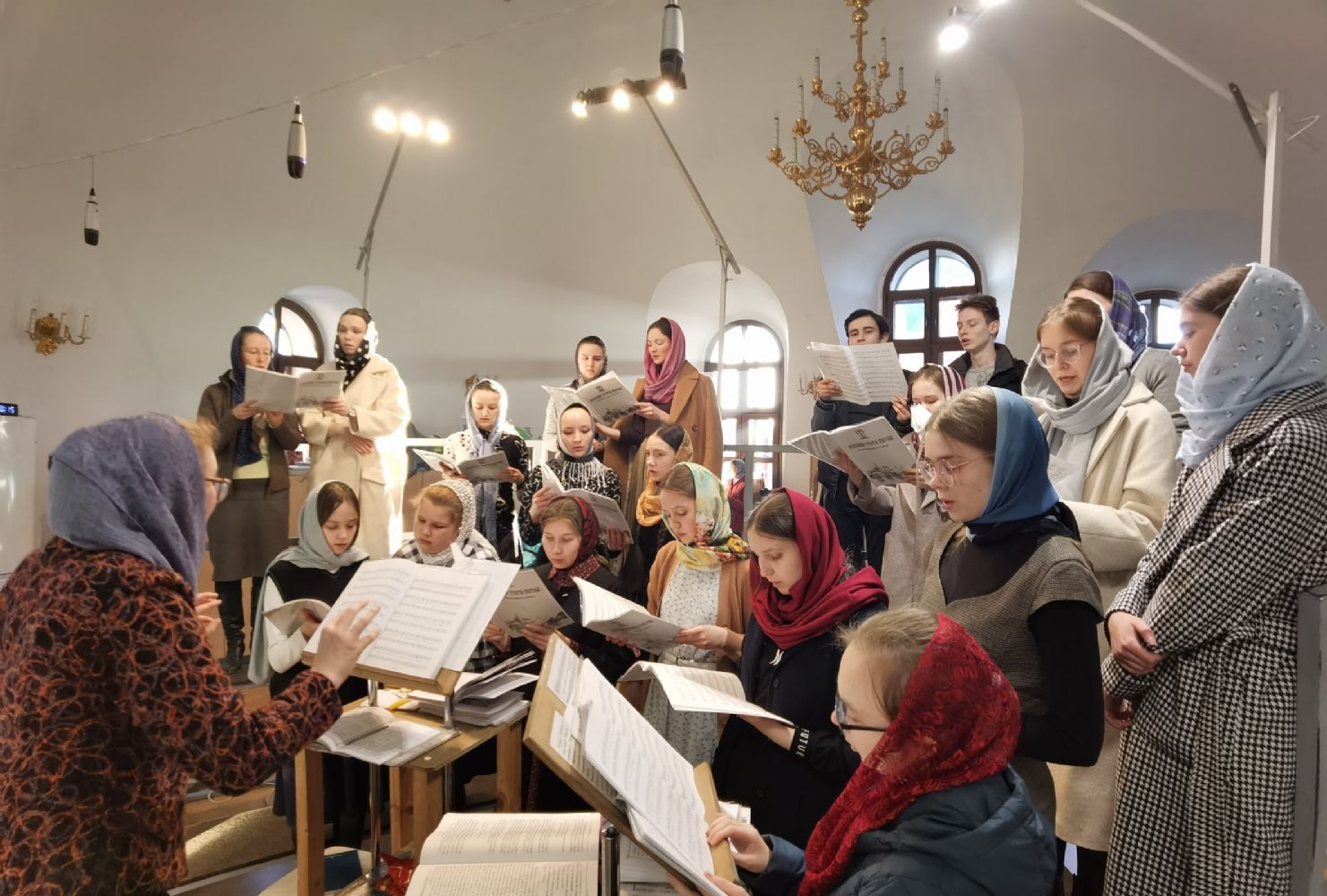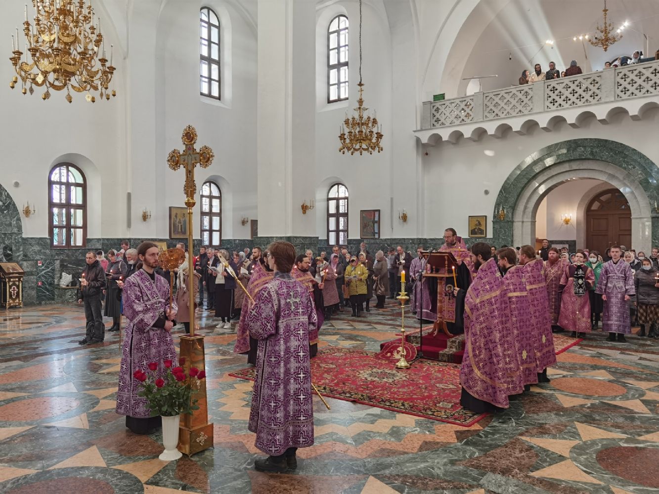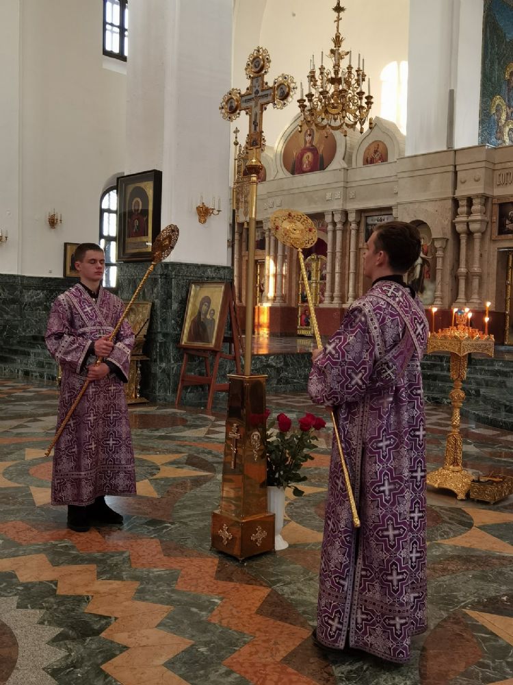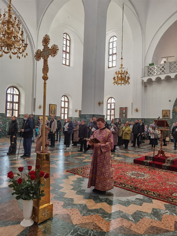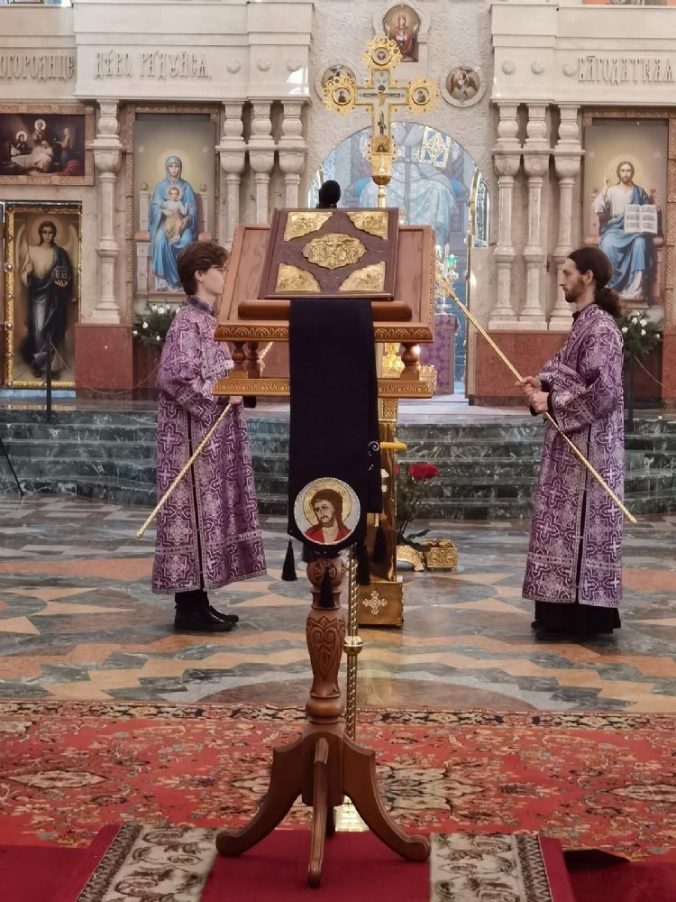 За богослужением пел детско-юношеский хор «Благовест» под руководством регента Татьяны Черновой. Песнопение «Днесь висит на древе...» исполнил перед Распятием иерей Евгений Самойлов. Тропарь «Искупил ны еси от смерти законныя...» и светилен «Разбойника благоразумного…» исполнял мужской хор священства кафедрального собора.