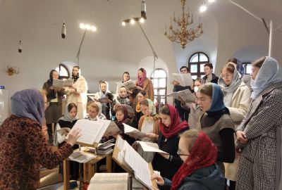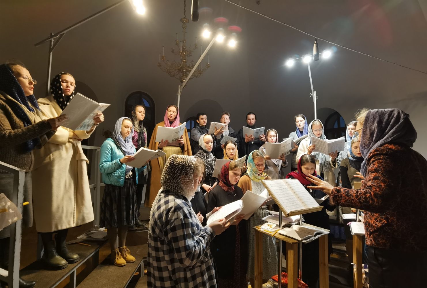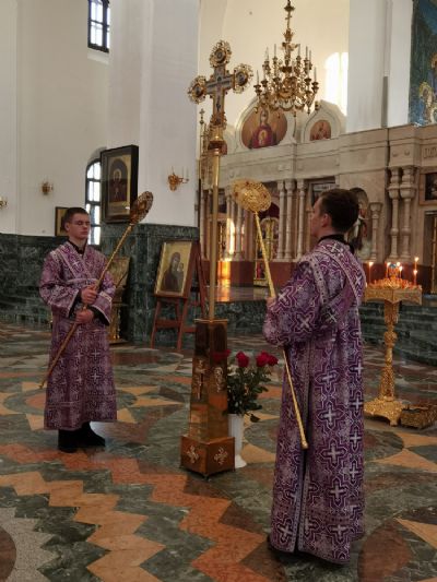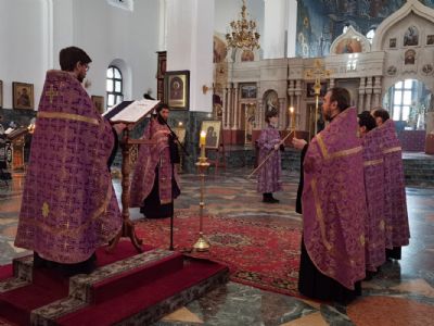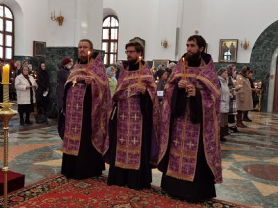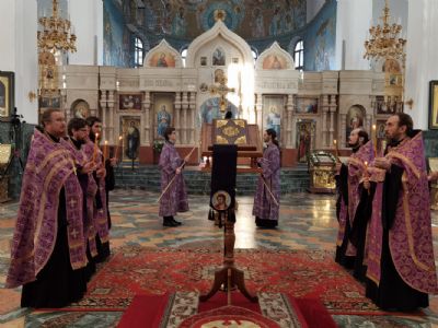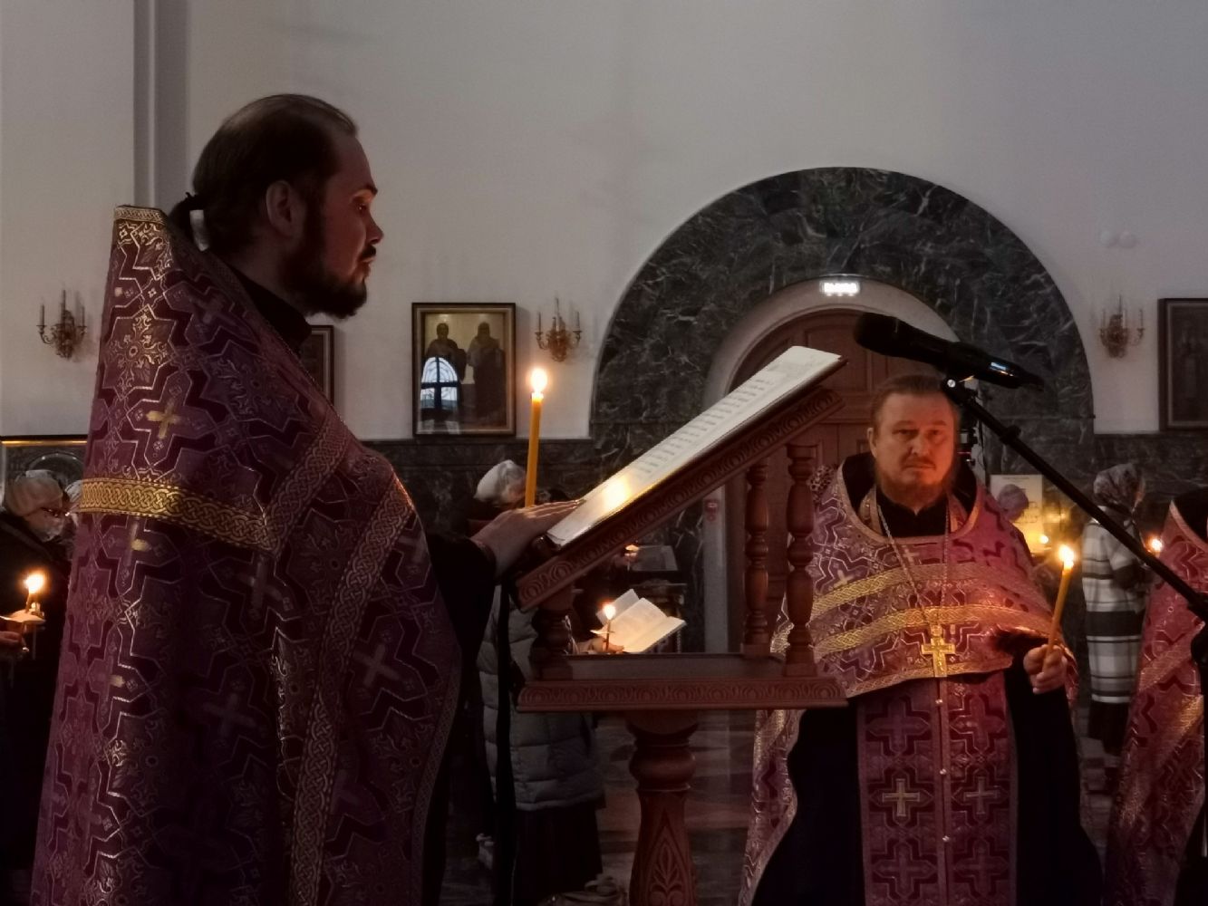 Трепеснец преподобного Космы Маюмского в центре храма перед Распятием читали иереи Никифор Захаров и Евгений Самойлов.