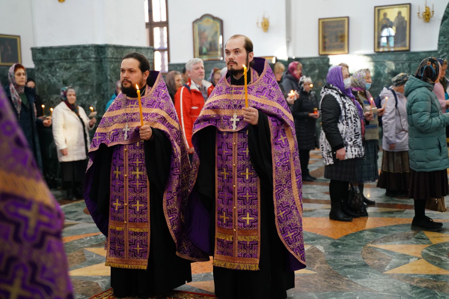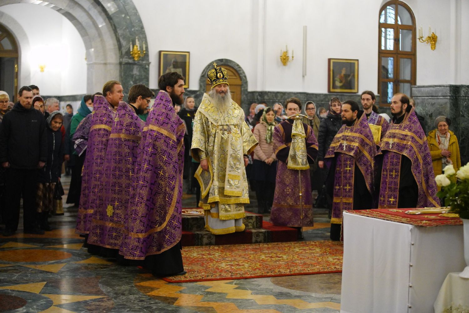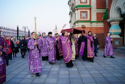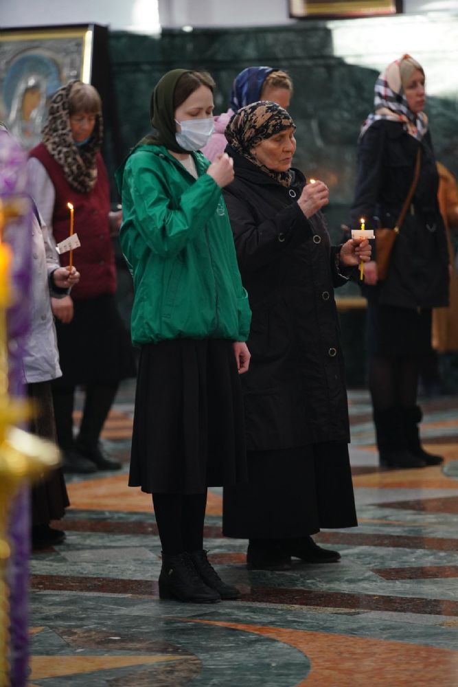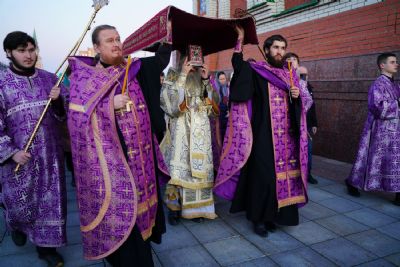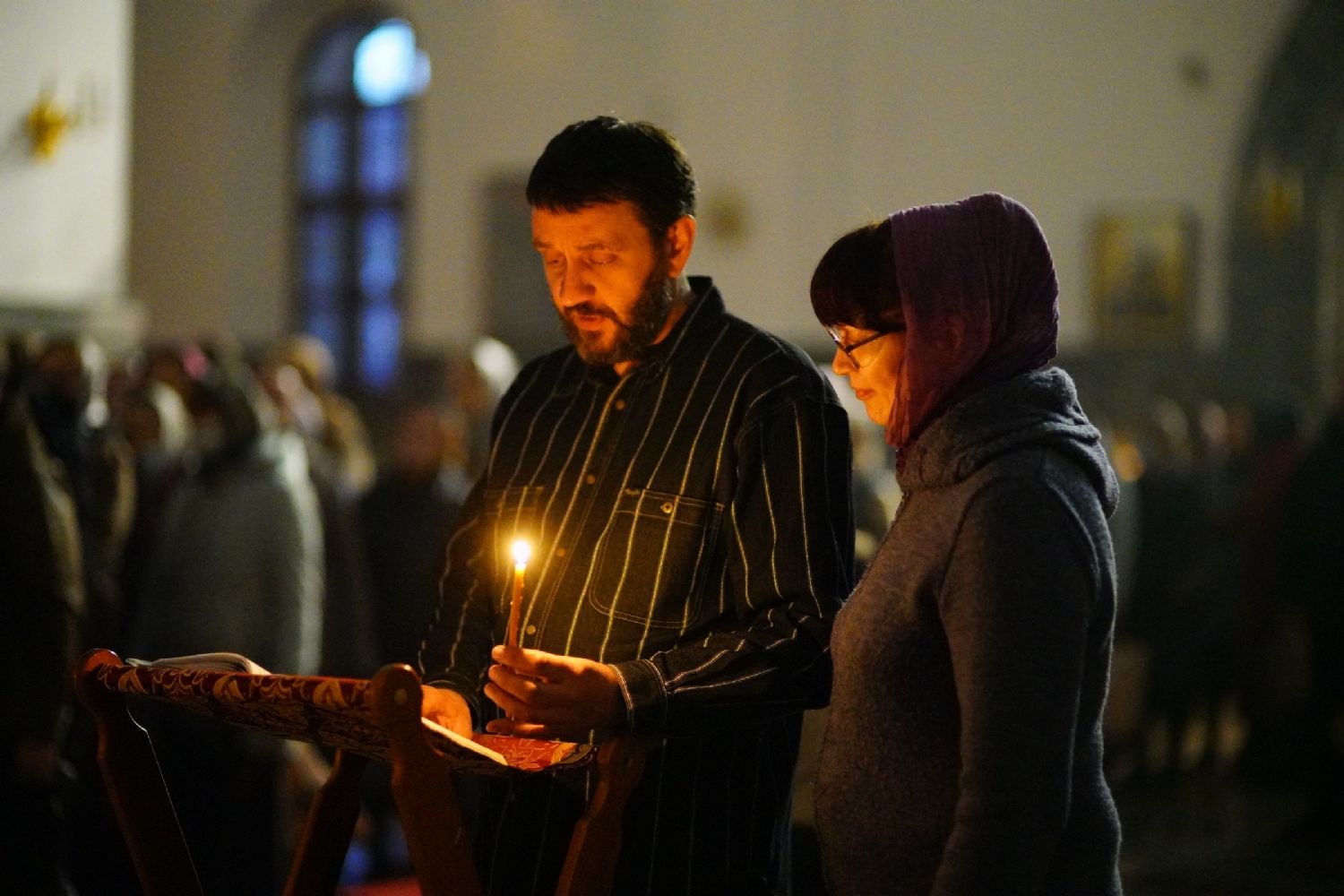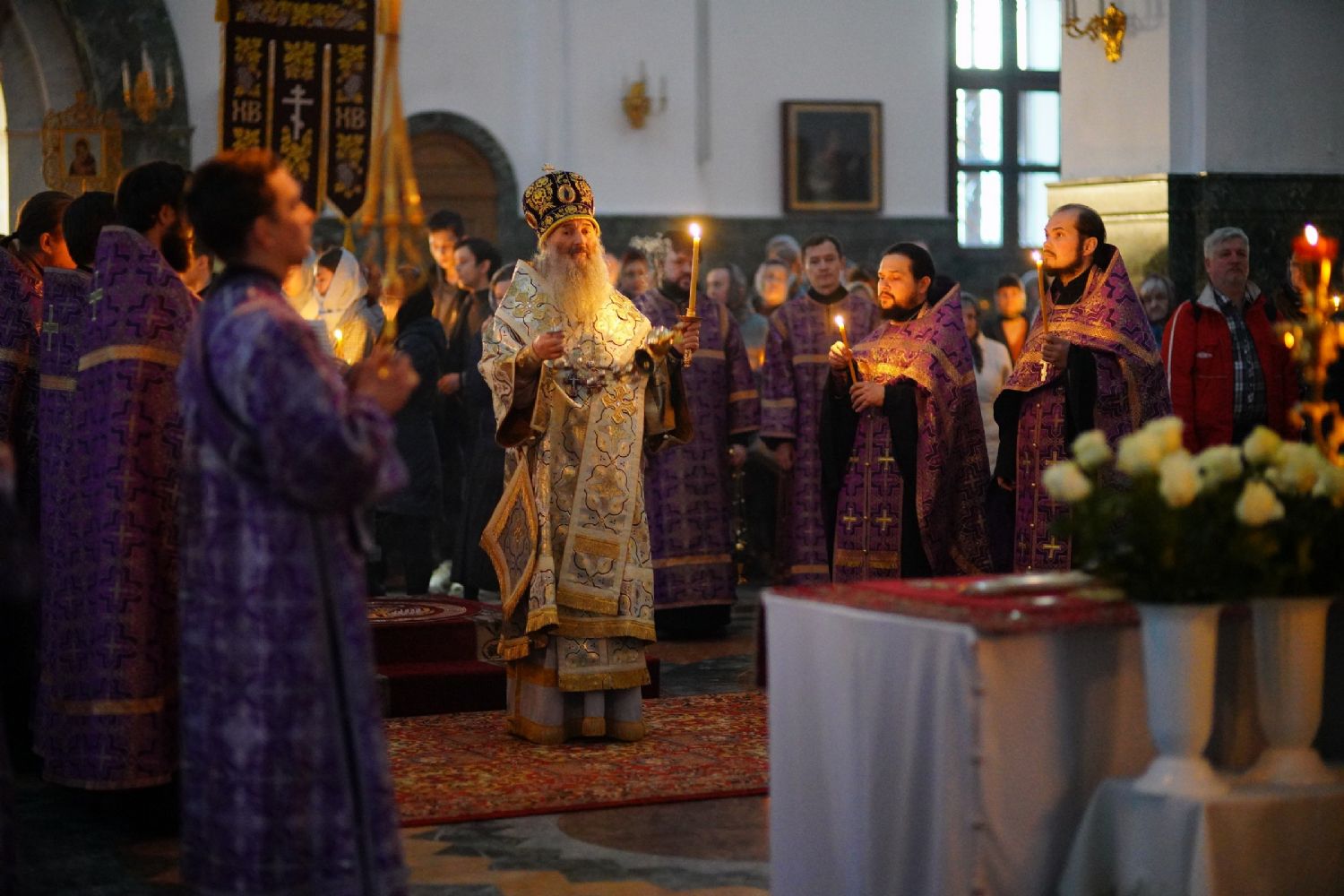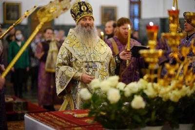 Его Высокопреосвященству сослужили ключарь кафедрального собора протоиерей Сергий Поглазов, протодиакон Михаил Козловский и клирики собора. Песнопения исполнял хор «Благовест» под руководством регента Татьяны Черновой.