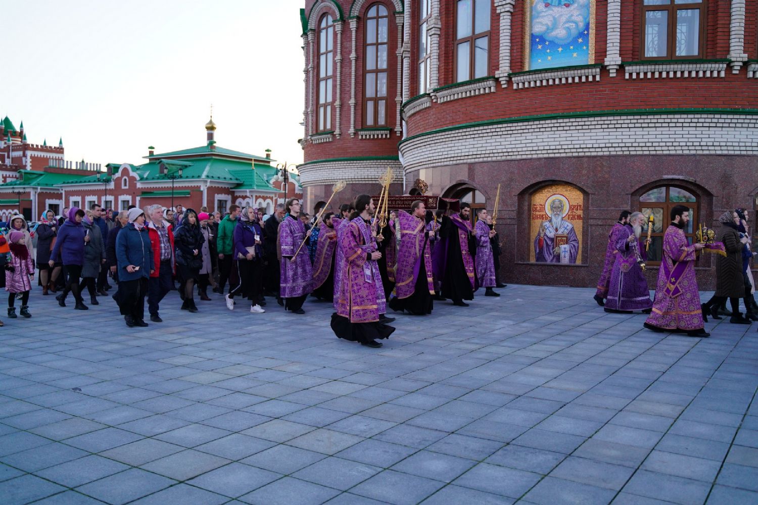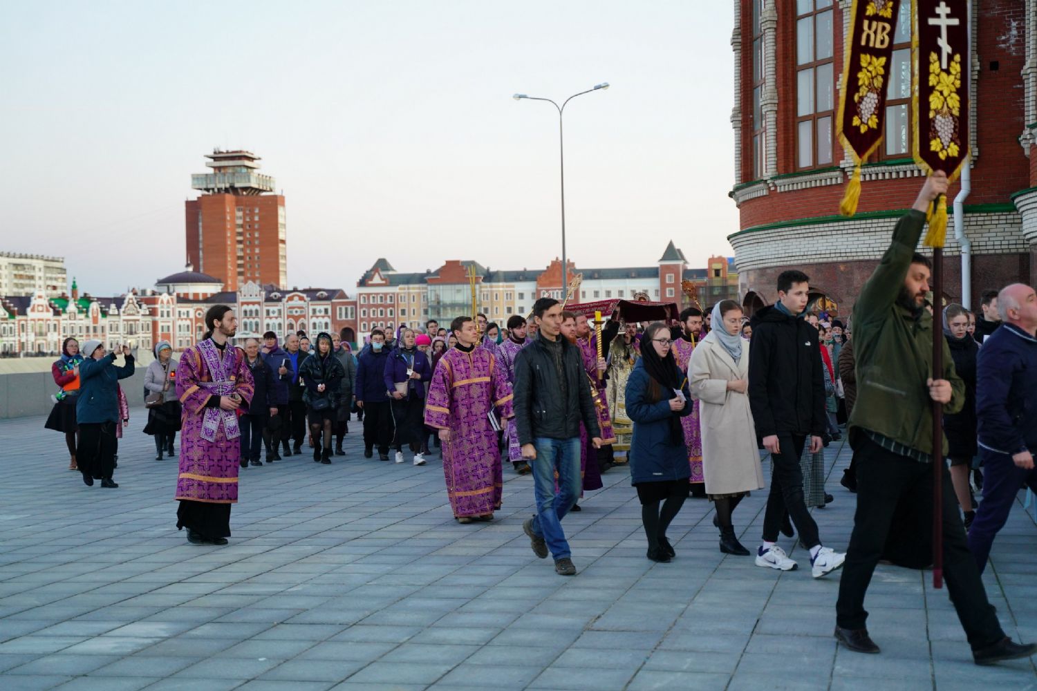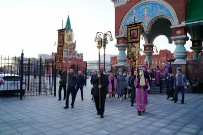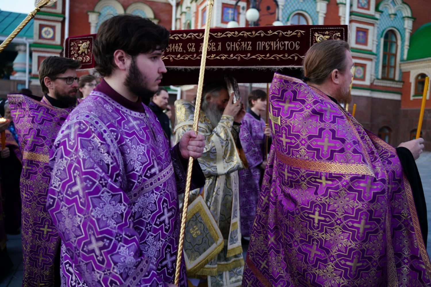 После канона и великого славословия при пении «Святый Боже» и погребальном перезвоне колоколов Плащаница крестным ходом была обнесена вокруг храма в воспоминание погребения Христова, сошествия Его во ад и победы над смертью.