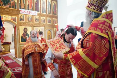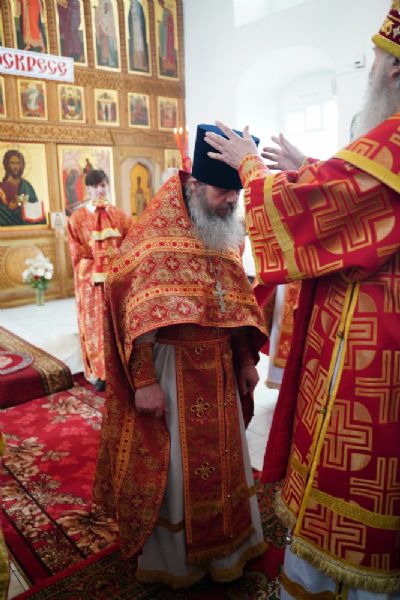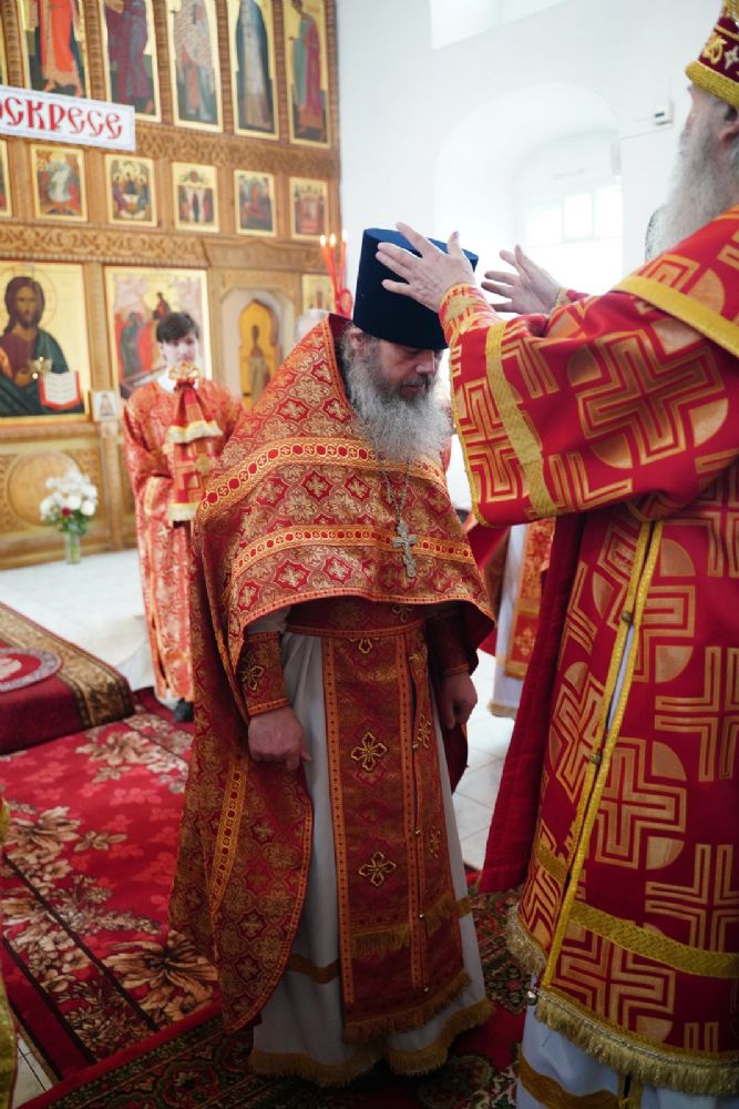 На малом входе митрополит Иоанн вручил богослужебно-иерархические награды: настоятель храма Владимирской иконы Божией Матери с. Кузнецово иерей Василий Яшмолкин удостоен права ношения палицы; настоятель Сретенского храма с. Русский Кадам иерей Владимир Каплунов - права ношения камилавки.