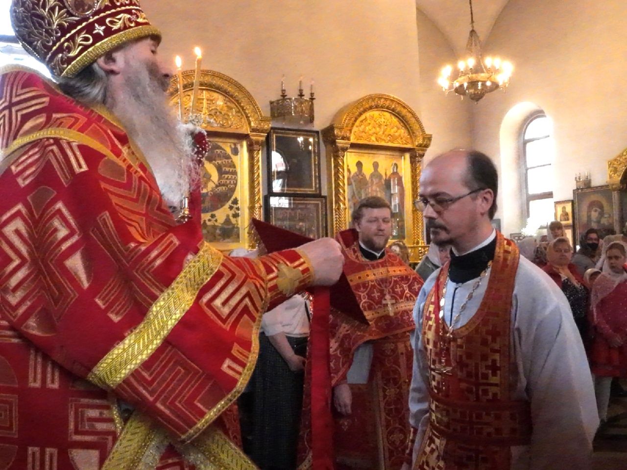 На входе с Евангелием митрополит Иоанн вручил богослужебно-иерархические награды клирикам Успенского храма: иерей Алексий Михеев удостоен права ношения палицы, иерей Вячеслав Булычев – права ношения камилавки.