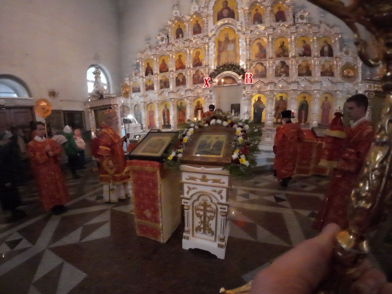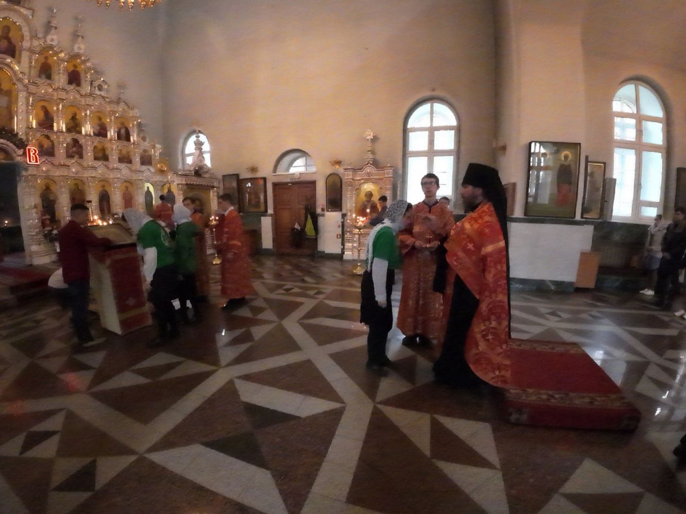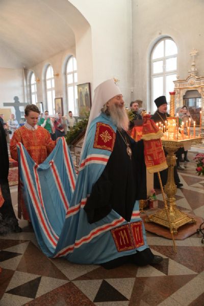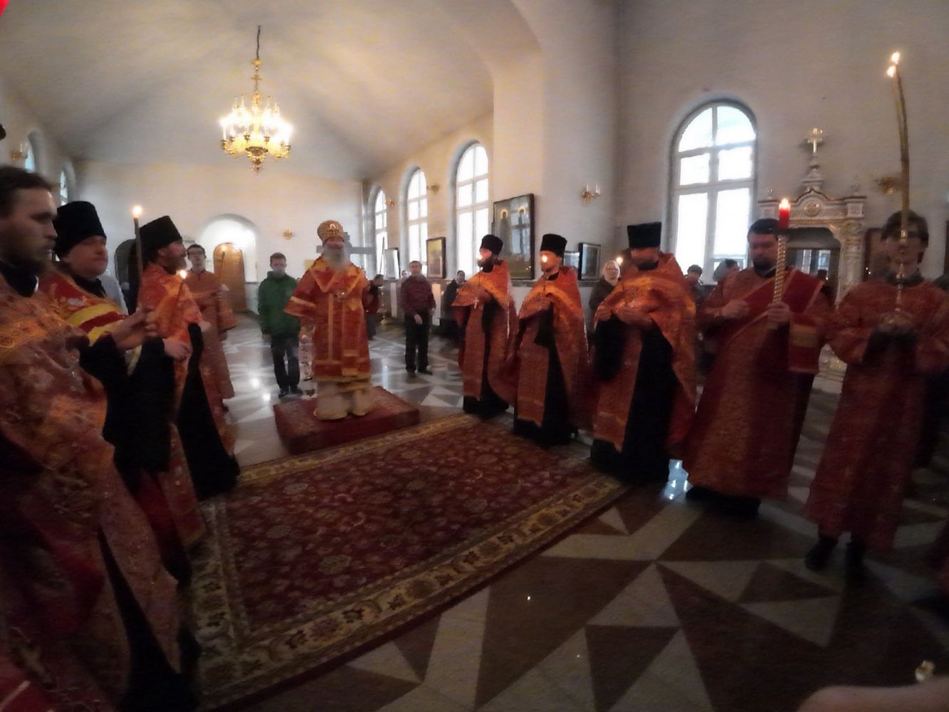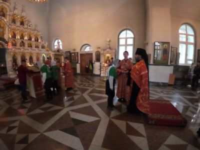 Его Высокопреосвященству сослужили секретарь Йошкар-Олинского епархиального управления иеромонах Серафим (Пасанаев), настоятель собора иерей Алексий Кирюшкин, клирики собора и протодиакон Михаил Козловский. Песнопения исполнял хор собора под руководством регента Алисы Вылегжаниной.