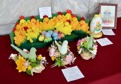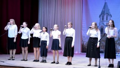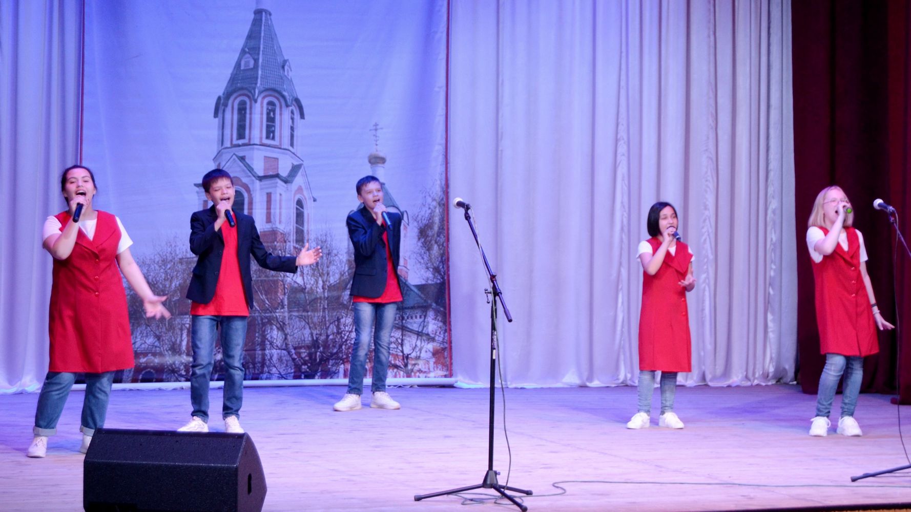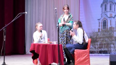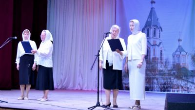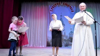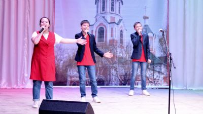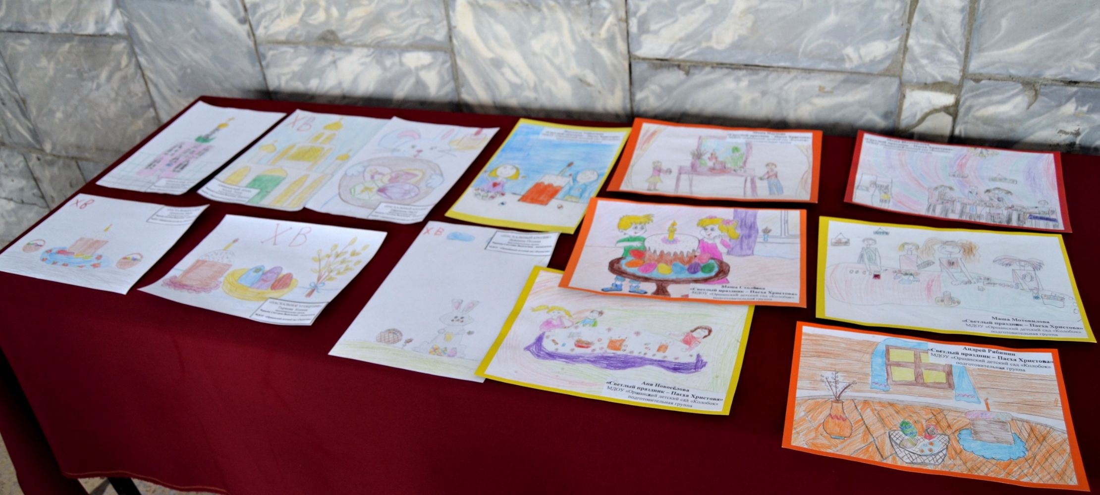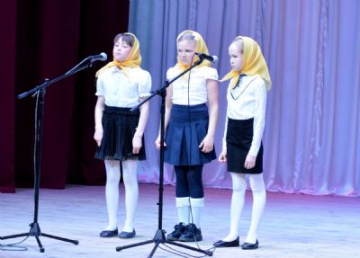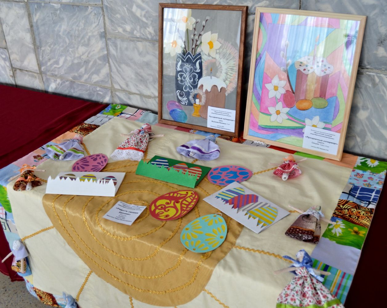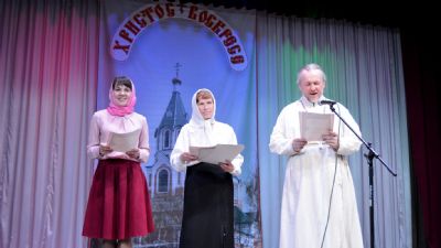 После праздничной Литургии в храме Рождества Иоанна Предтечи все желающие собрались в районном Центре культуры и досуга. В фойе была организована выставка детских рисунков и поделок на пасхальную тему. А к началу концертной части зал был полон зрителей.