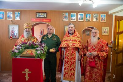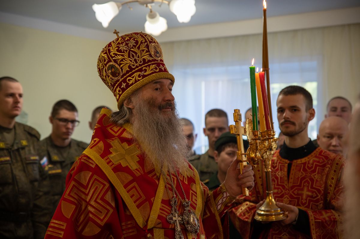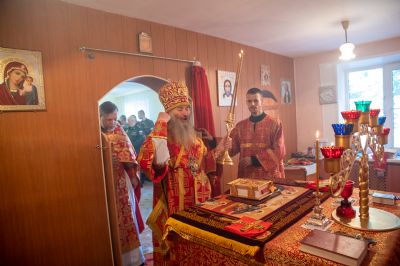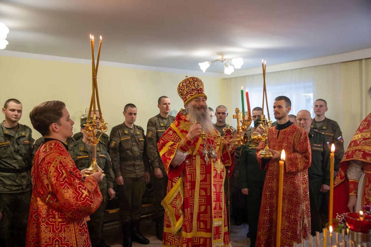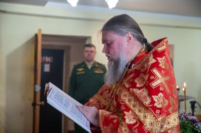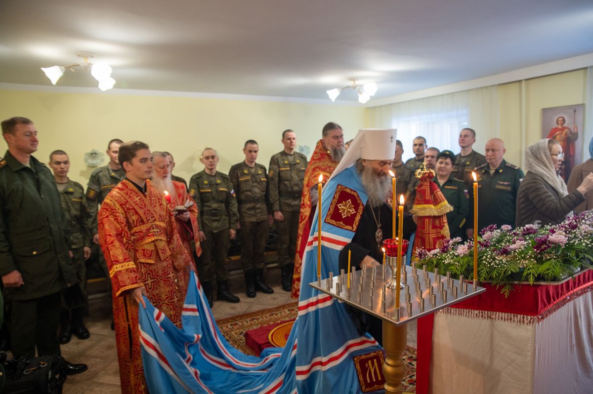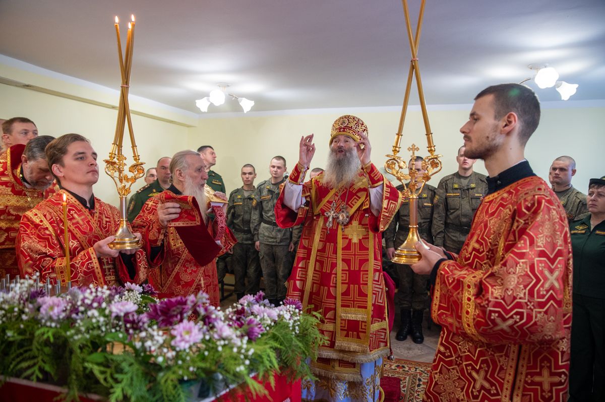 Архипастырю сослужили полковой священник Георгий Колотов, настоятель храма преподобного Серафима Саровского протоиерей Александр Бачурин и протодиакон Михаил Козловский. Песнопения исполнял малый состав хора «Благовест» под управлением регента Татьяны Черновой.