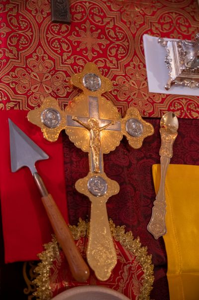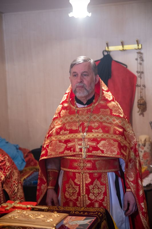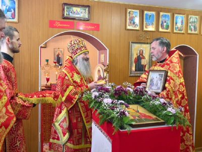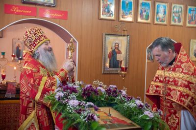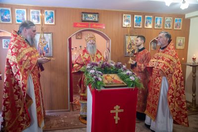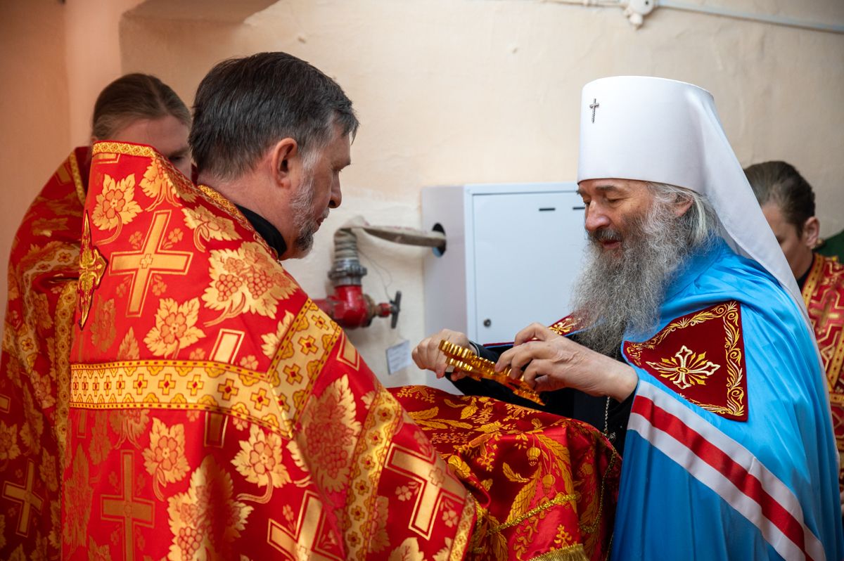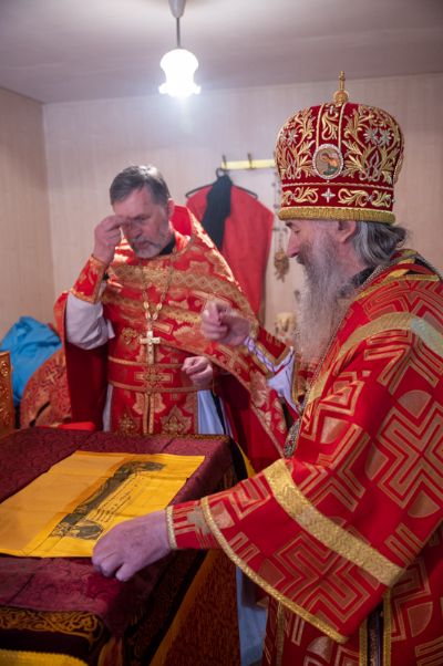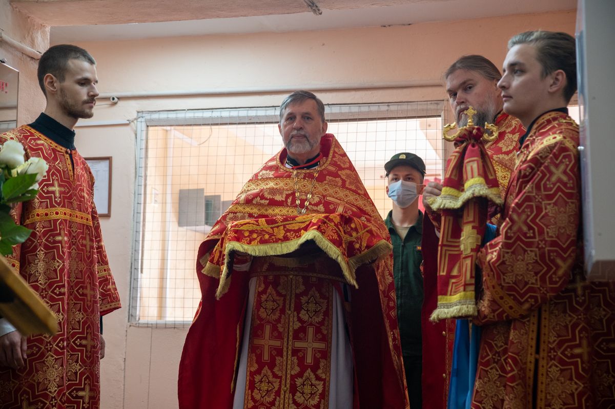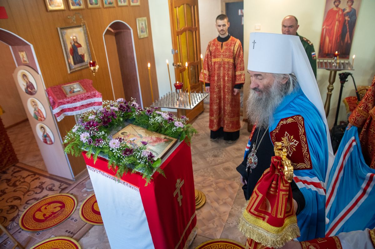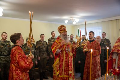 Архипастырю сослужили полковой священник Георгий Колотов, настоятель храма преподобного Серафима Саровского протоиерей Александр Бачурин и протодиакон Михаил Козловский. Песнопения исполнял малый состав хора «Благовест» под управлением регента Татьяны Черновой.