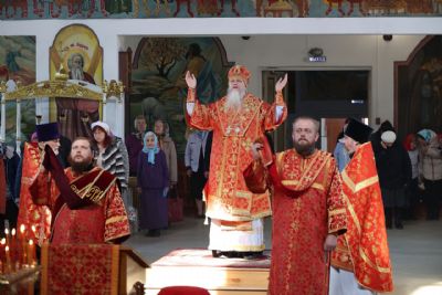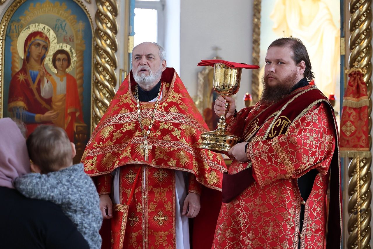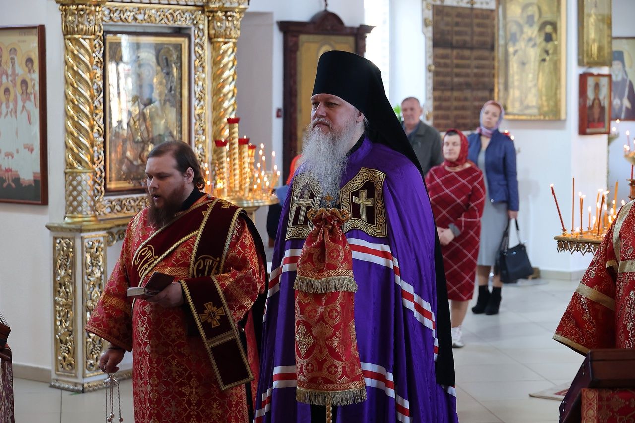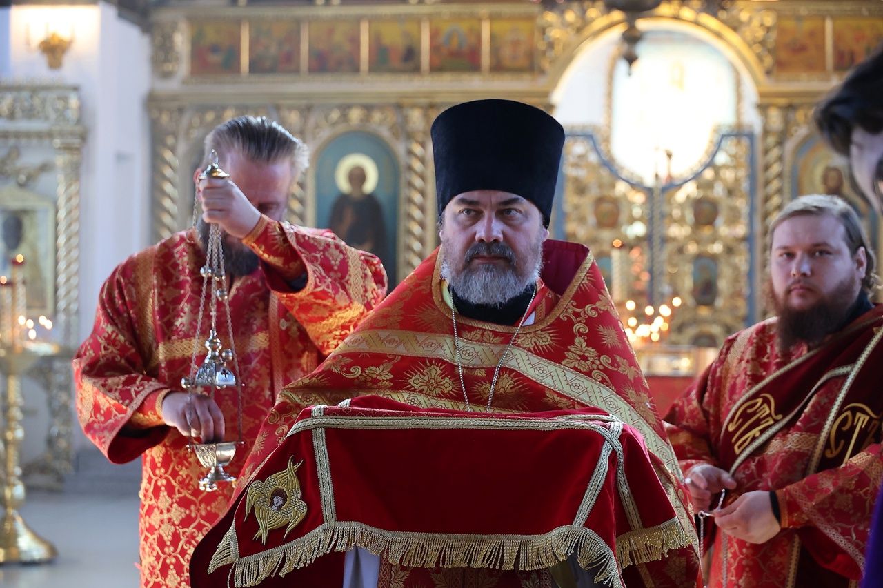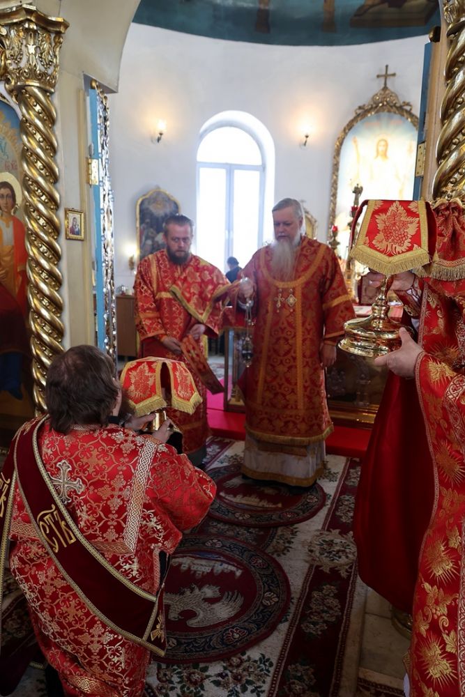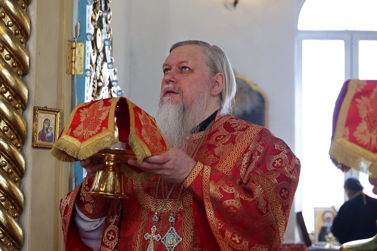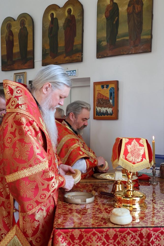 Его Преосвященству сослужили: секретарь епархиального управления иерей Иоанн Лапшинский и клирики Никольского собора протоиерей Виталий Михеев, диаконы Иоанн Захаров и Димитрий Карпетченко. Песнопения исполняли архиерейский хор под управлением регента Тимофея Протасова.