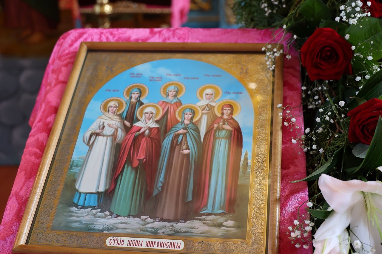 Святые жены-мироносицы являют нам удивительный пример. В те дни, когда один из учеников Иисуса Христа Иуда Искариот предал Его иудеям, когда апостол Пётр, шествовавший за Христом до двора первосвященника, убоялся и трижды отрёкся от Христа, когда народ кричал на суде у Пилата: «Распни Его!», когда у Креста стояла только Божия Матерь и возлюбленный ученик Христов евангелист Иоанн Богослов, тогда и чуть поодаль от Креста стояли святые жены-мироносицы. Молча сострадая в сердце своему Божественному Учителю, взирали издалека на казнь Сына Божия…
