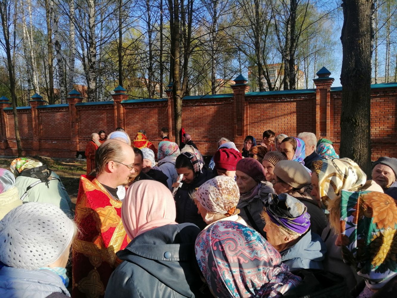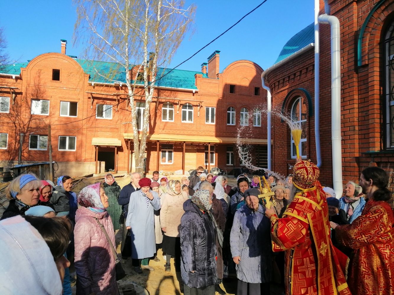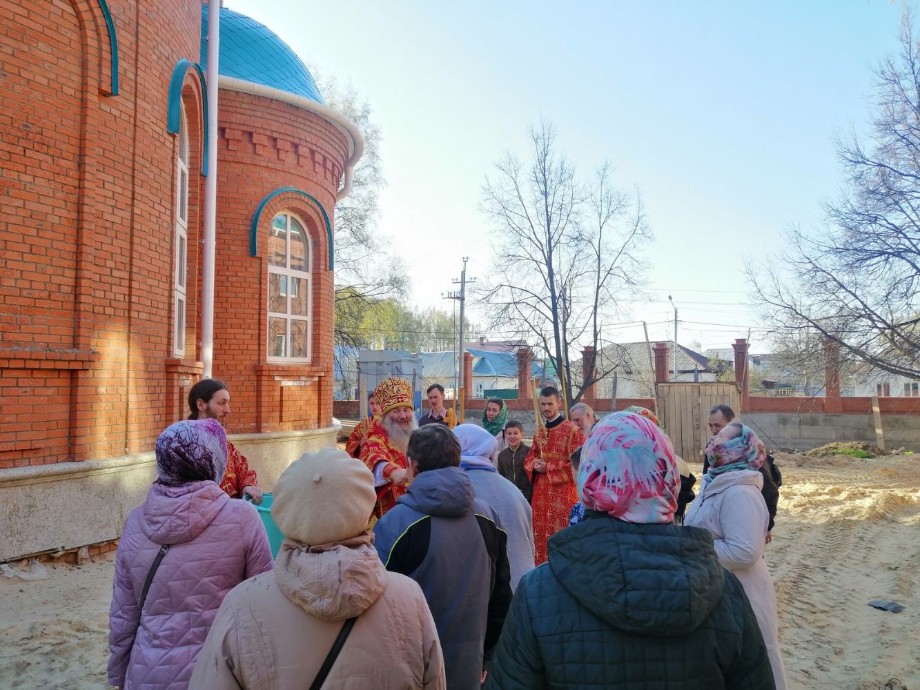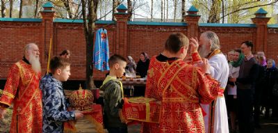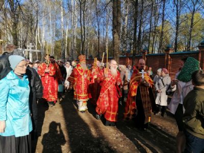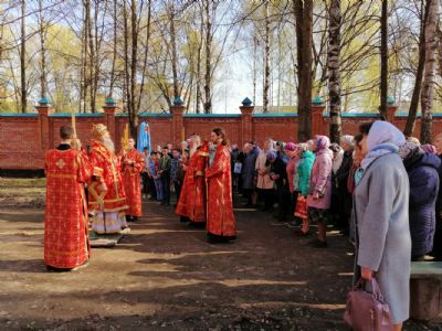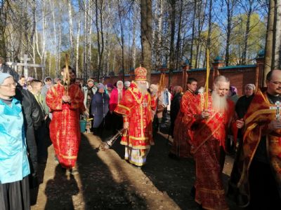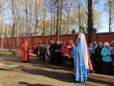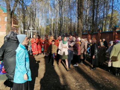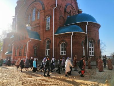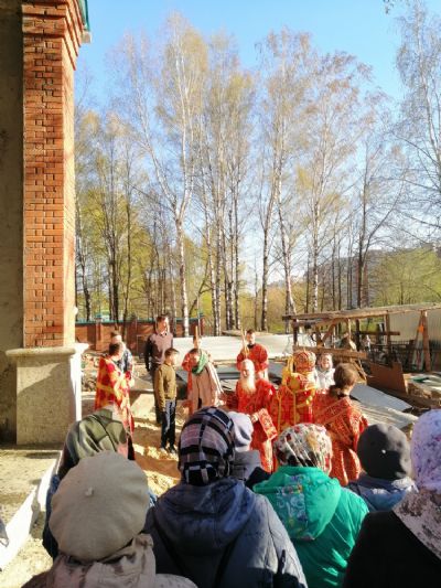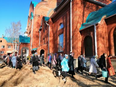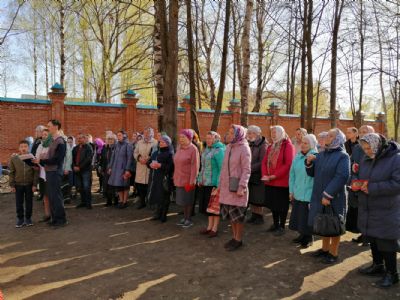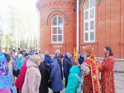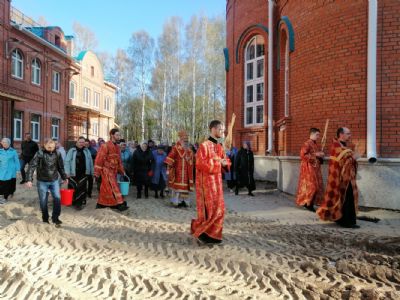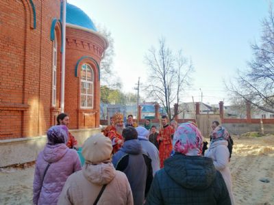 После акафиста верующие прошли крестным ходом вокруг храма. Владыка еще раз поздравил всех с продолжающимся праздником Пасхи и щедро окропил собравшихся святой водой.