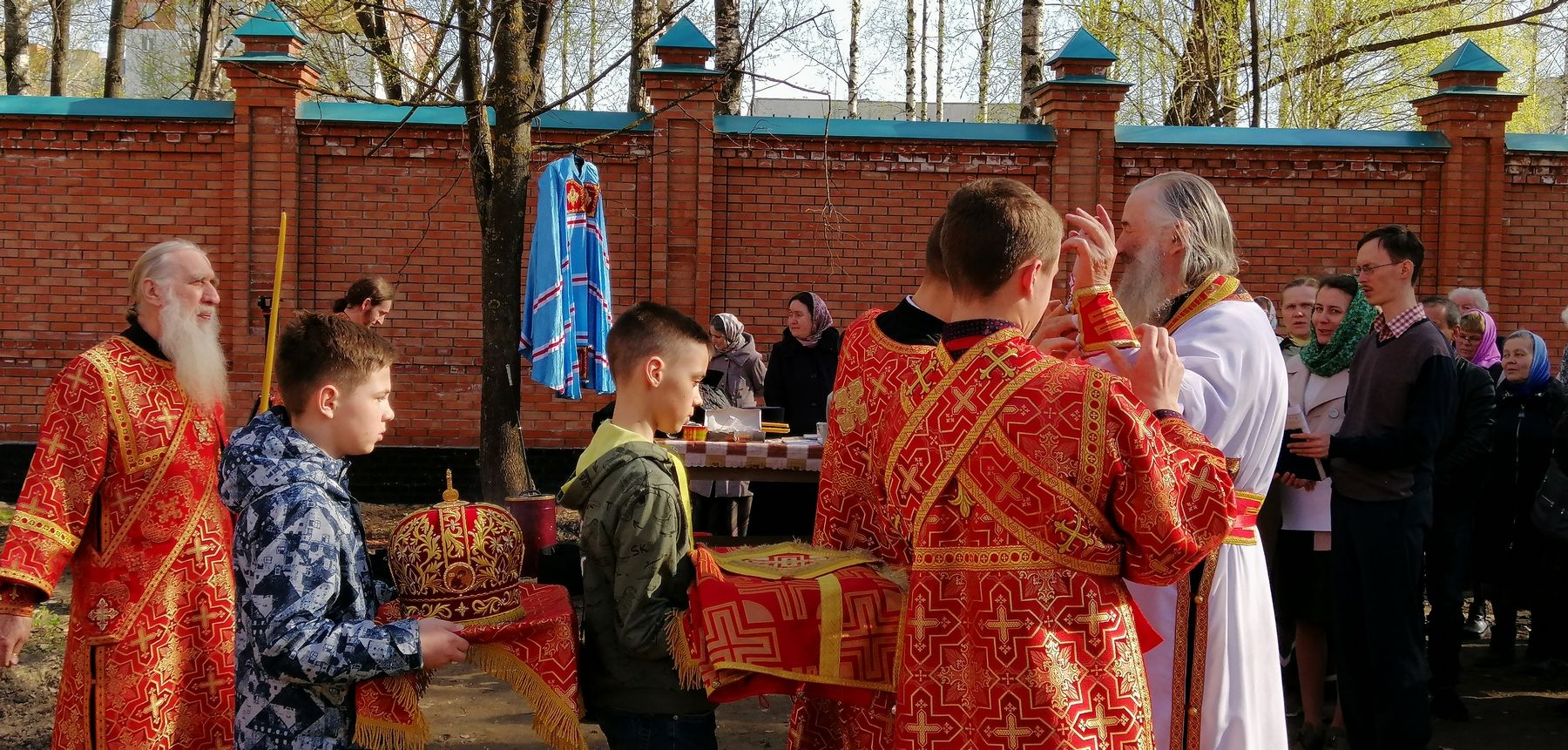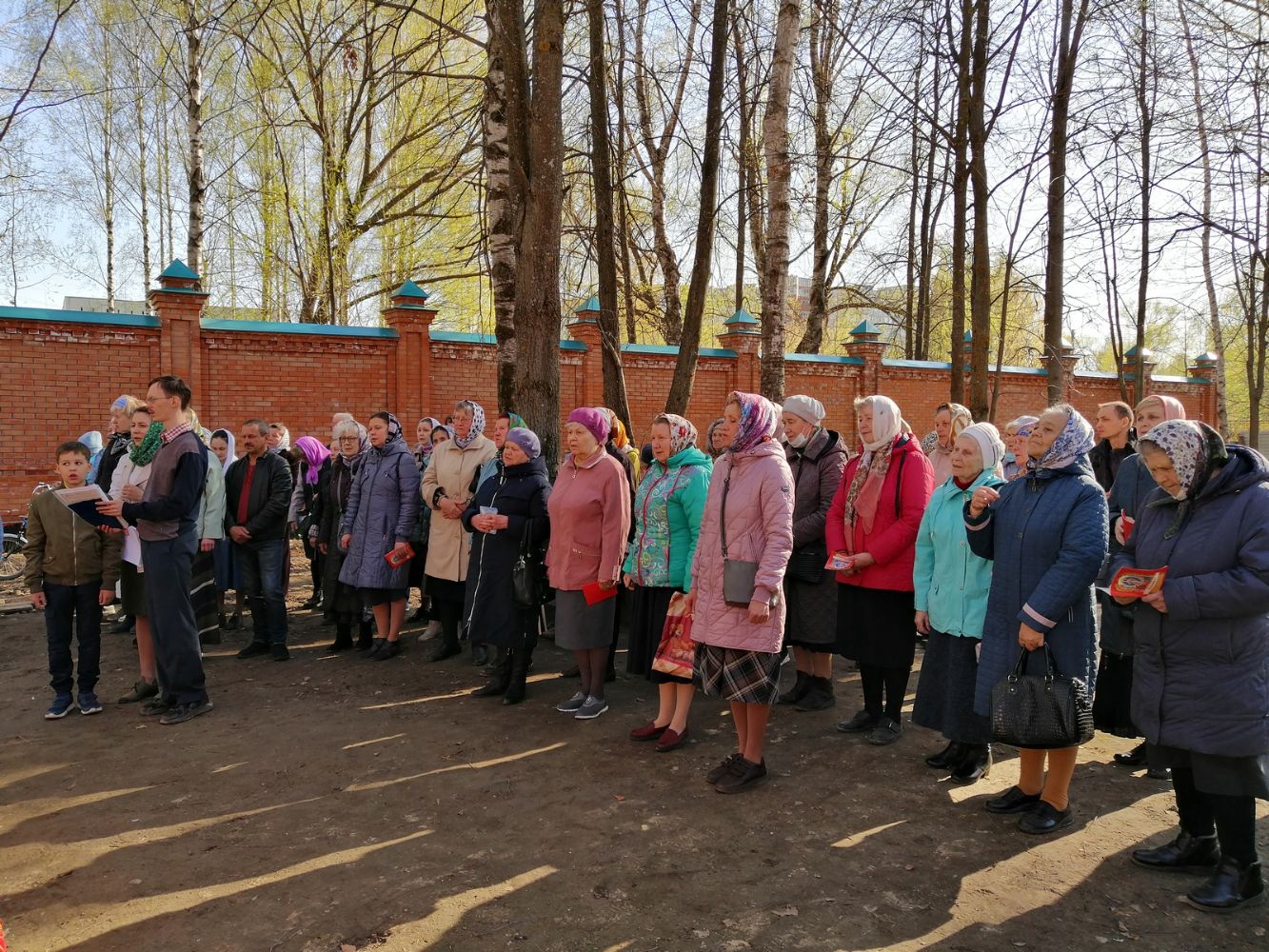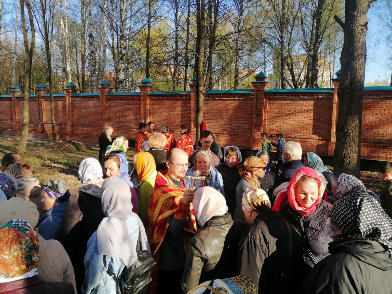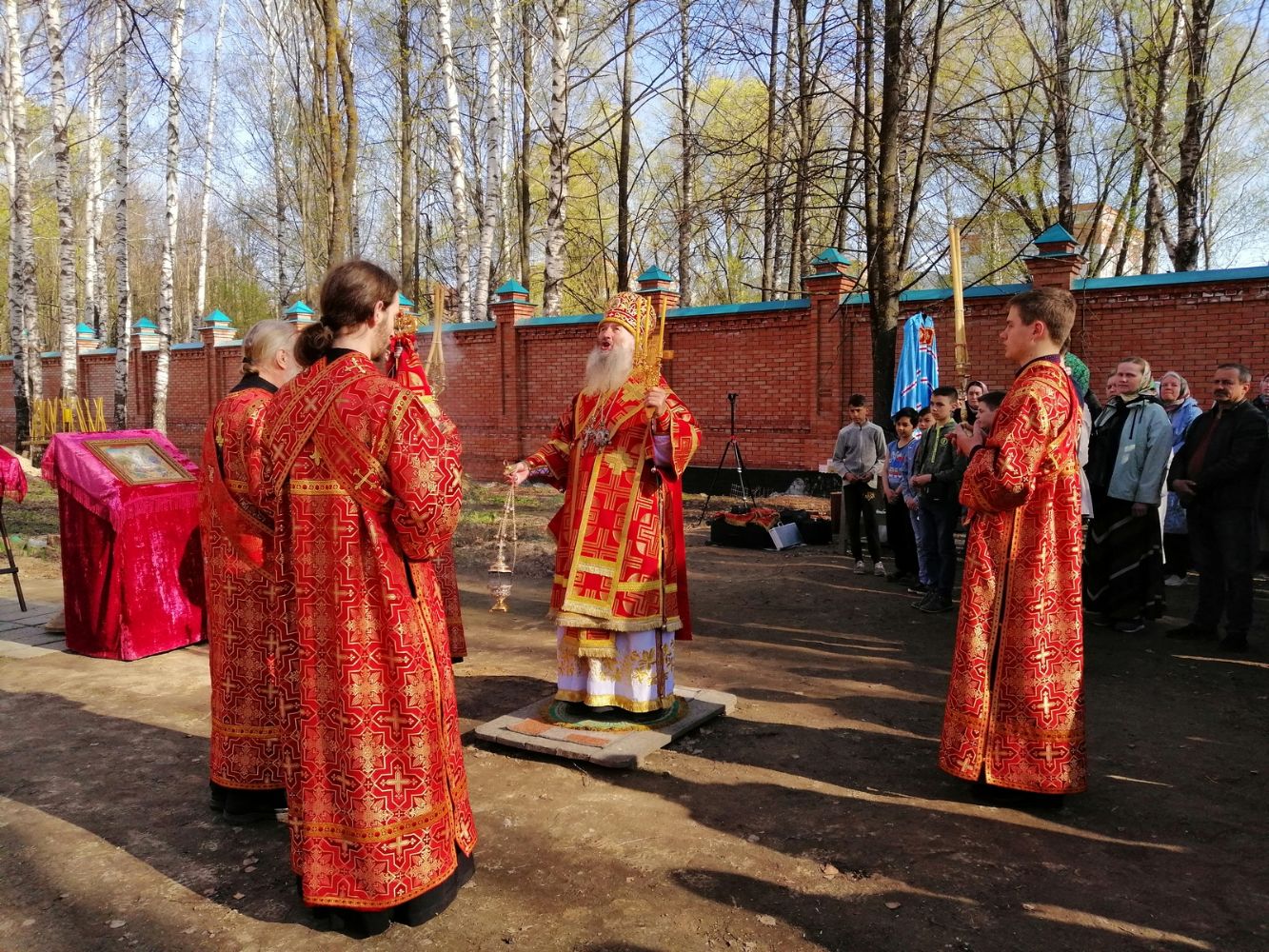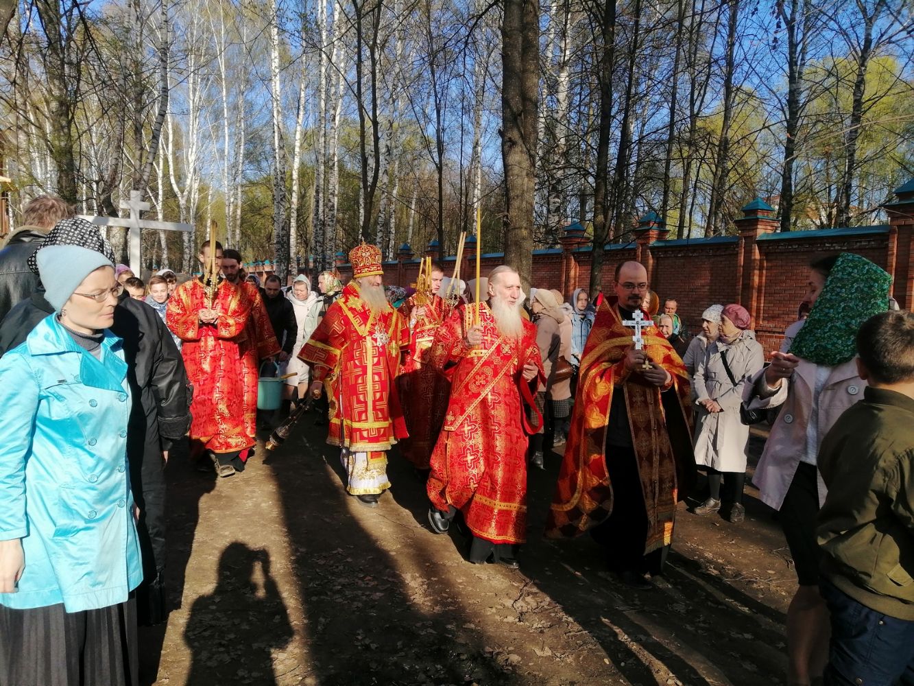 После акафиста верующие прошли крестным ходом вокруг храма. Владыка еще раз поздравил всех с продолжающимся праздником Пасхи и щедро окропил собравшихся святой водой.