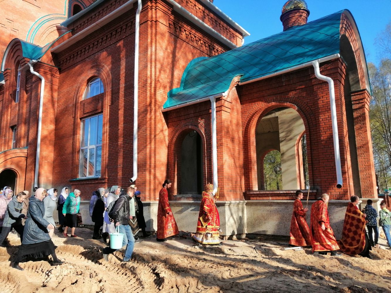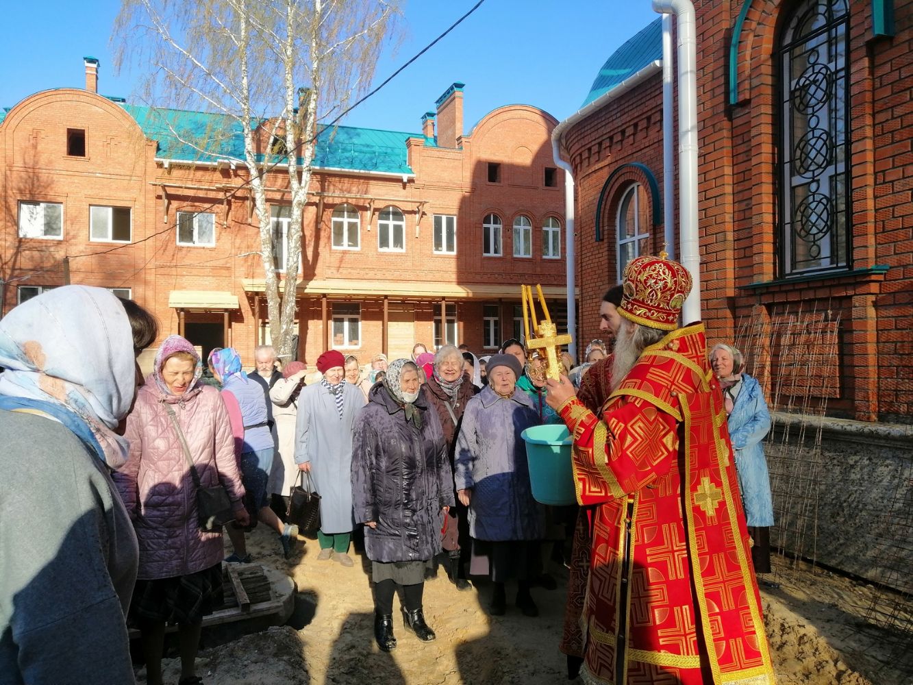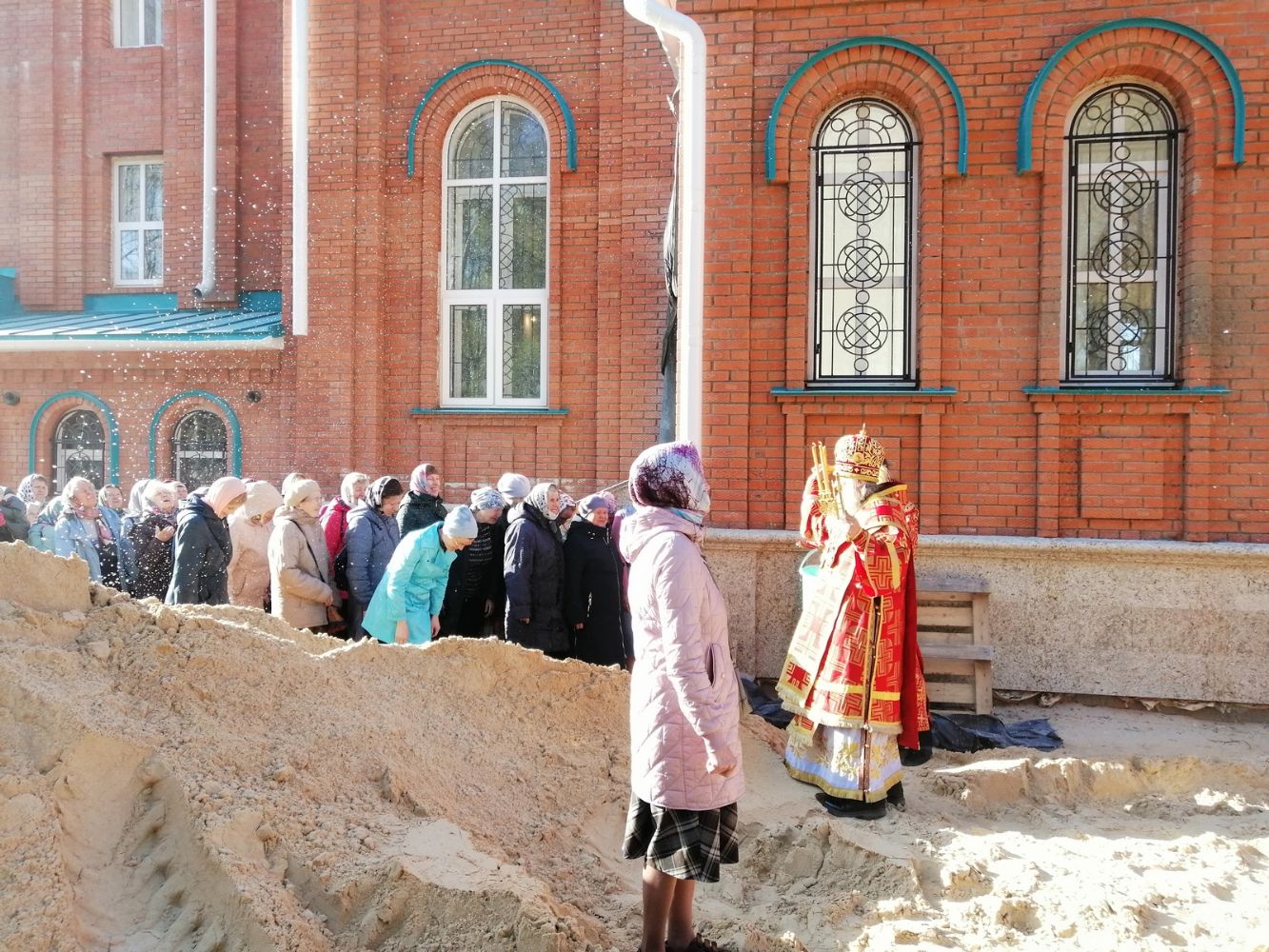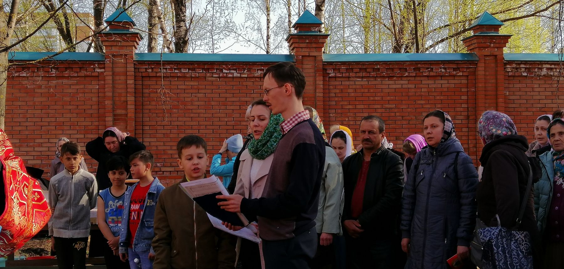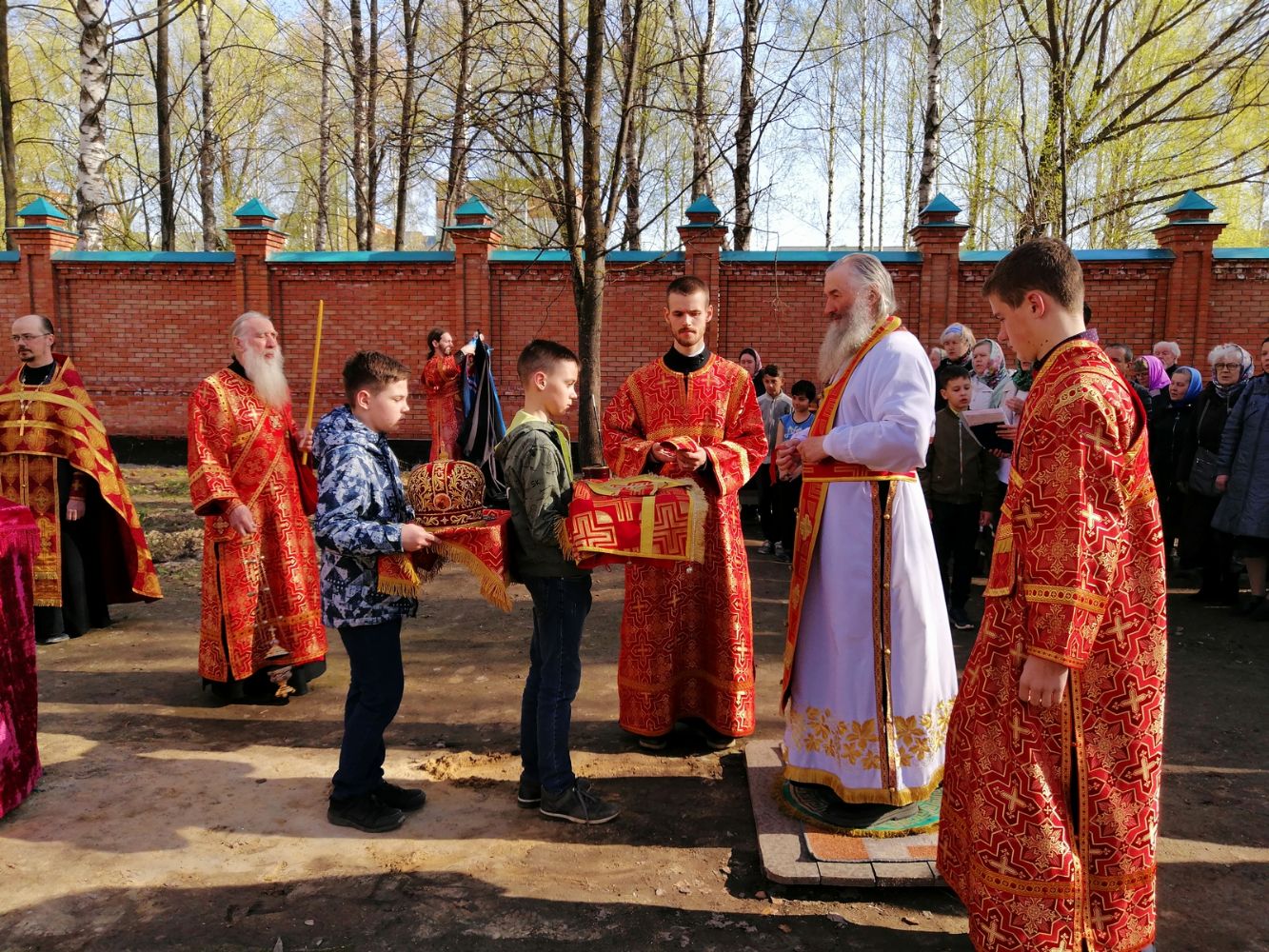 После акафиста верующие прошли крестным ходом вокруг храма. Владыка еще раз поздравил всех с продолжающимся праздником Пасхи и щедро окропил собравшихся святой водой.