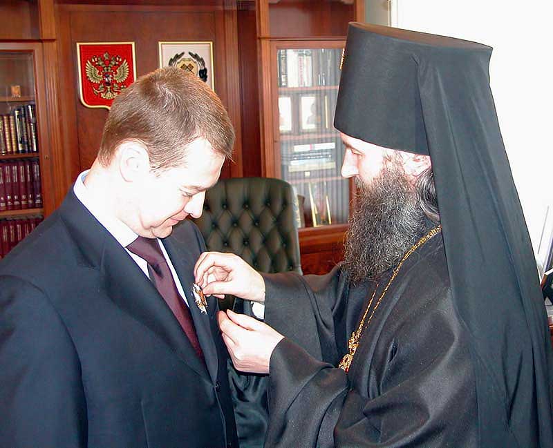 По благословению Святейшего Патриарха Алексия орден Президенту Марий Эл вручил архиепископ Йошкар-Олинский и Марийский Иоанн.