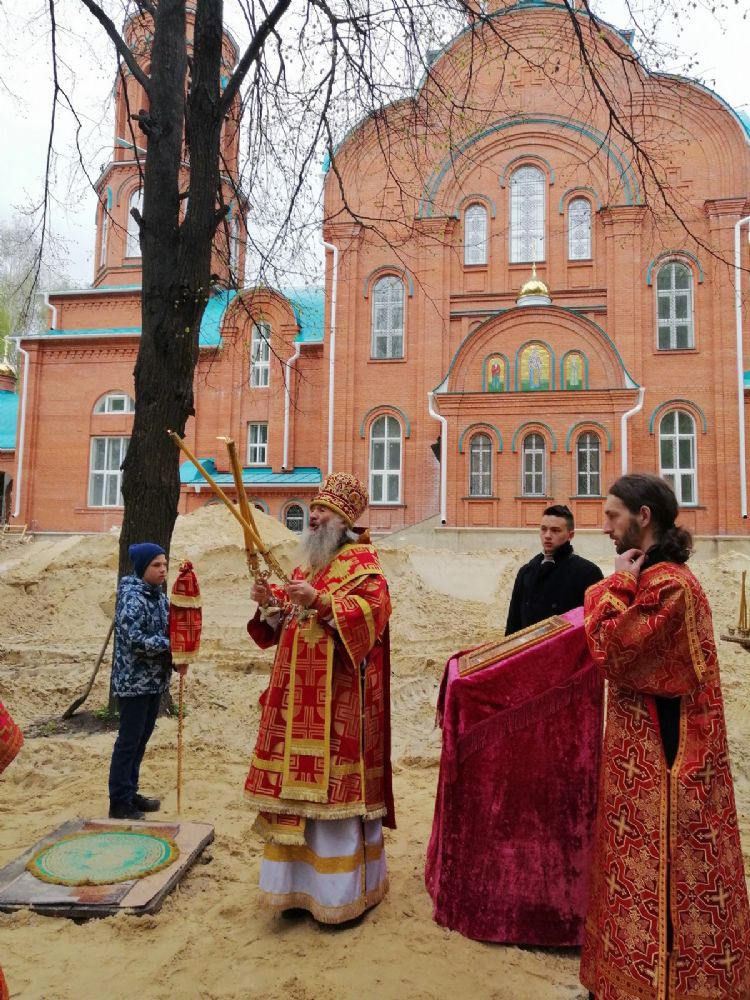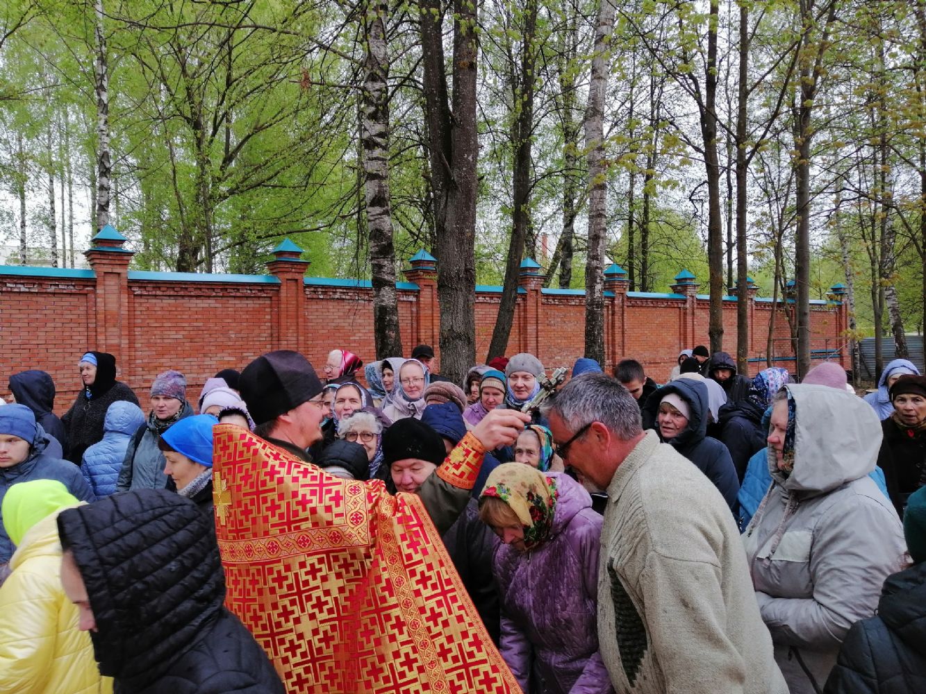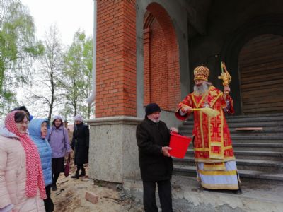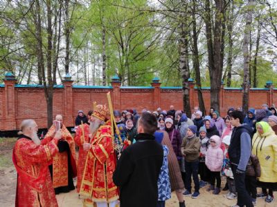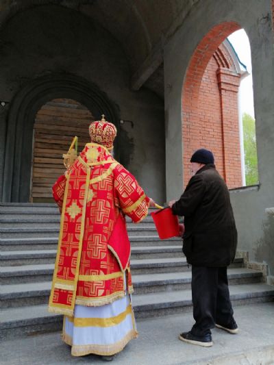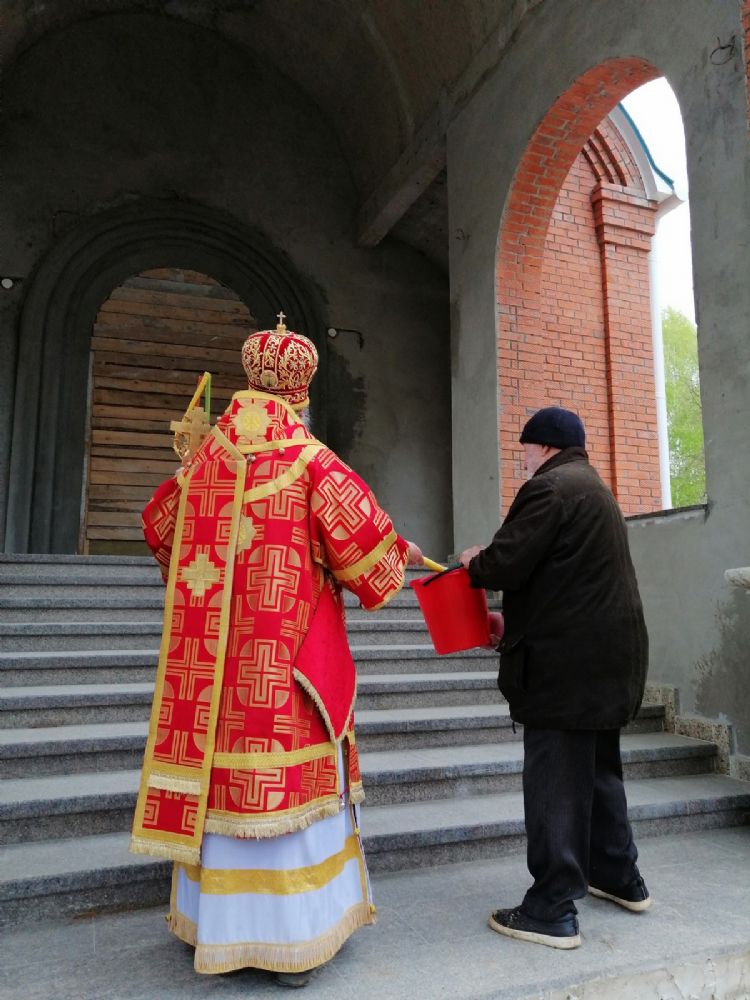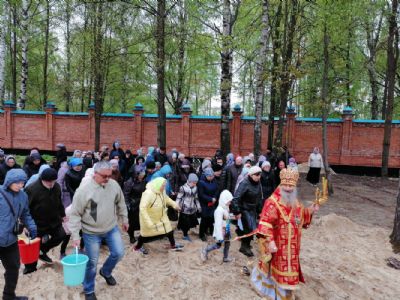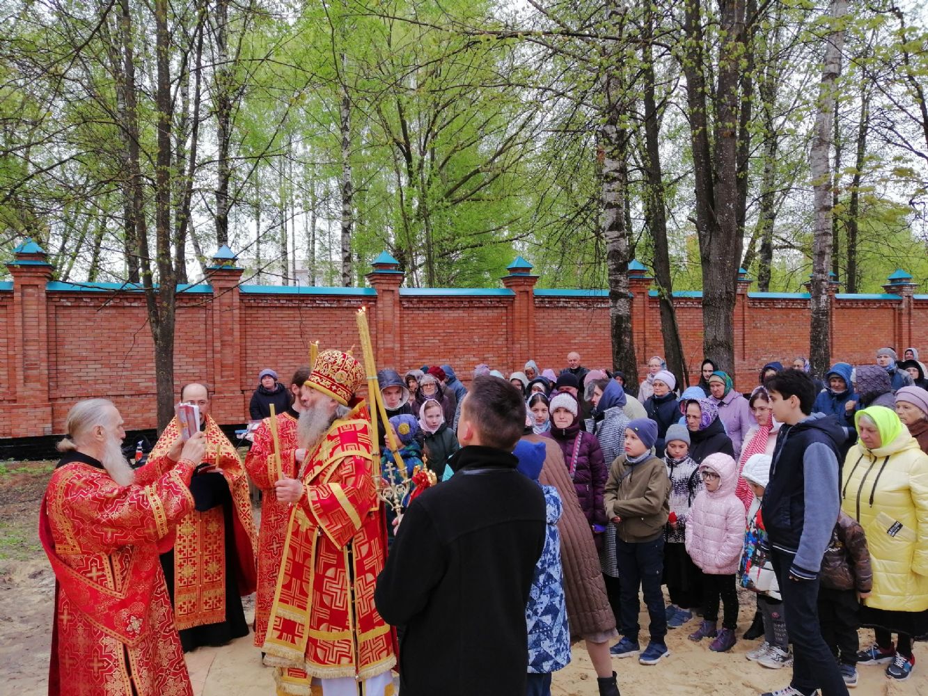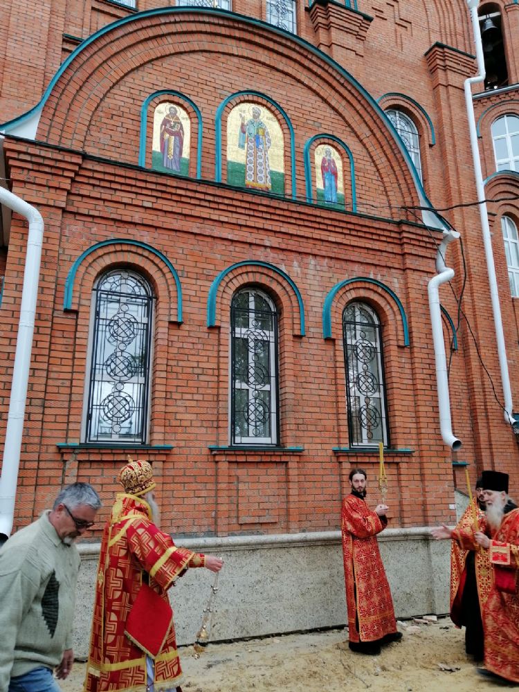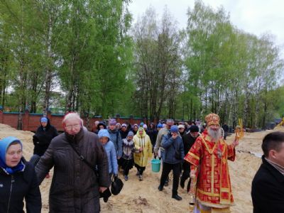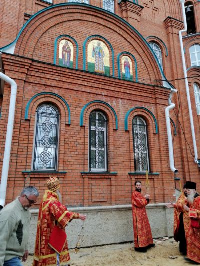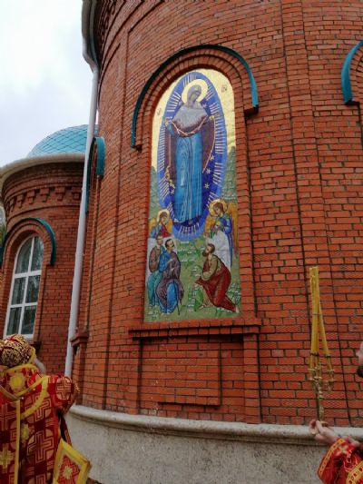 Накануне на внешних стенах храма были установлены мозаичные иконы с изображениями Пресвятой Богородицы и святых. Во время крестного хода владыка освятил их, окропив святой водой.