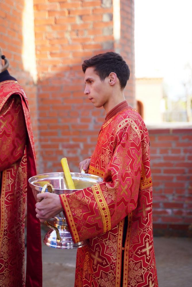 После этого каждый из нас услышал о милости Господней, Который, распявшись на кресте, распростер руки Свои и объял все человечество. И после Воскресения Он все концы земли просветил Своими апостолами, святителями и священниками. Его благодать изливается во все концы мира – поэтому мы ходили по всем сторонам храма и освящали их.