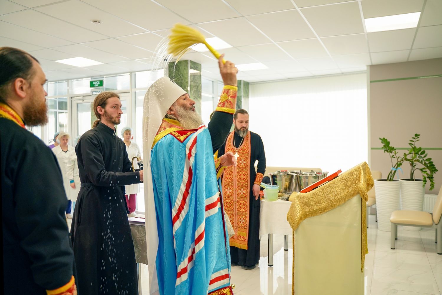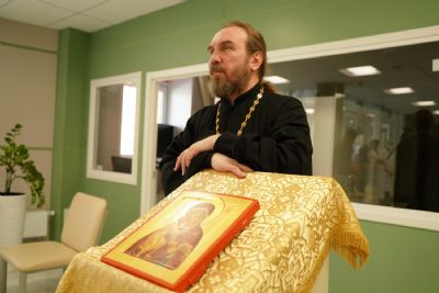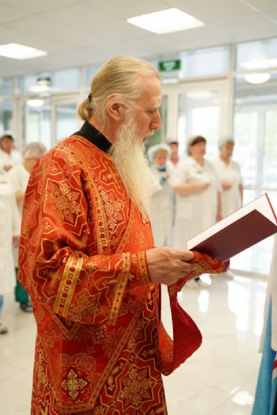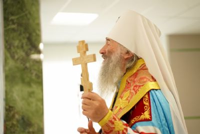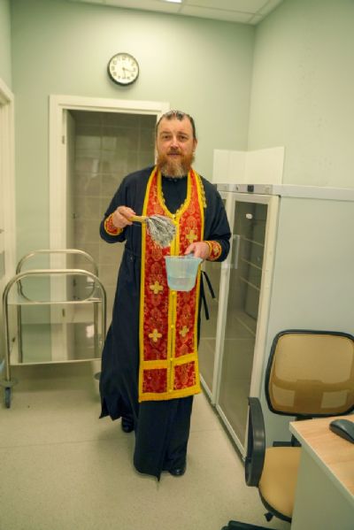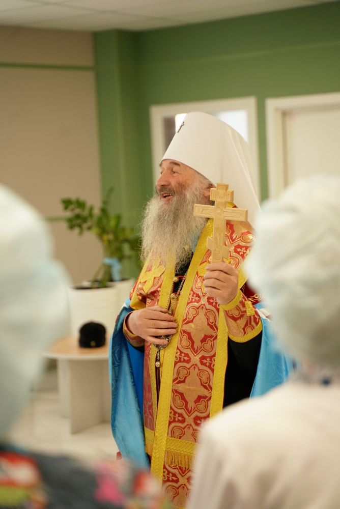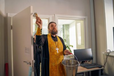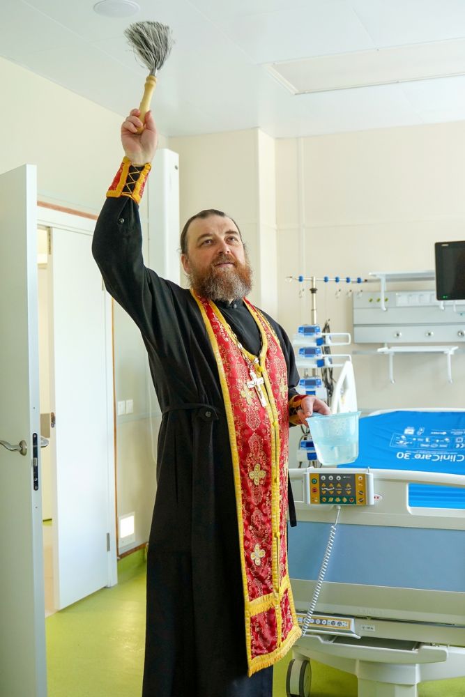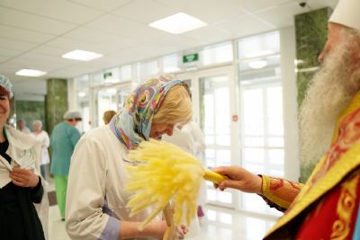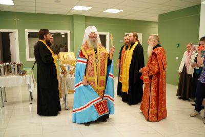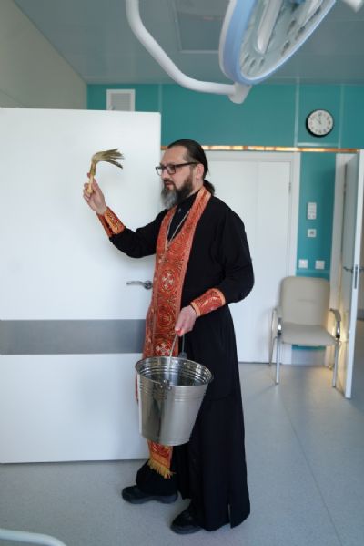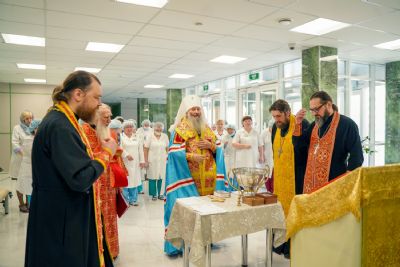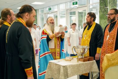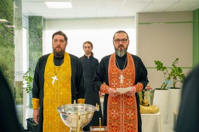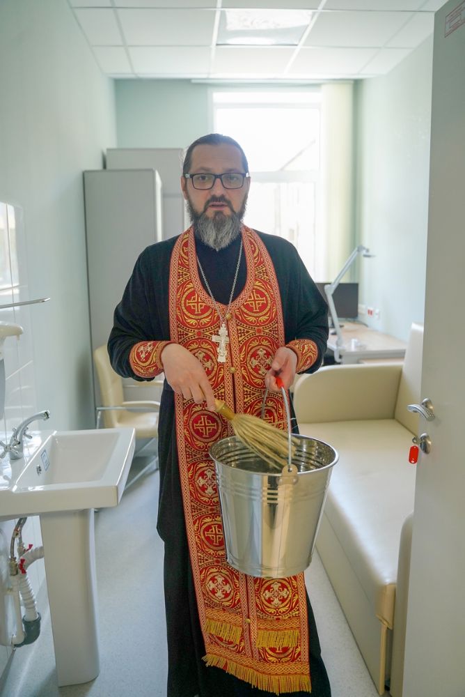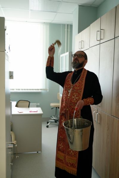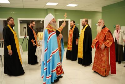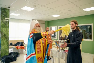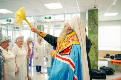 После водосвятного молебна митрополит Иоанн окропил стены на четыре стороны света и персонал центра, а сослужащие священники прошли с кроплением по всем палатам здания.