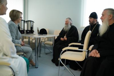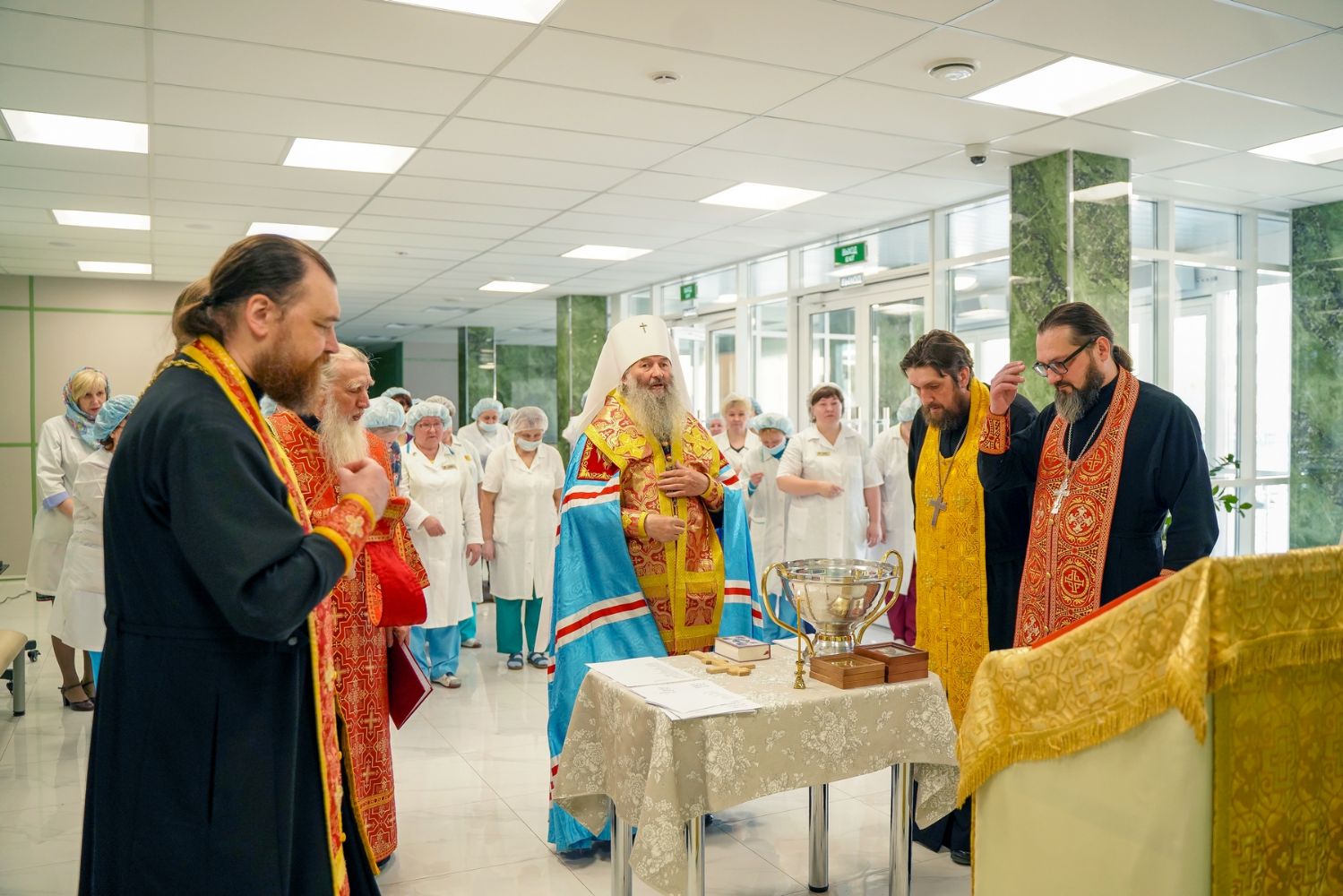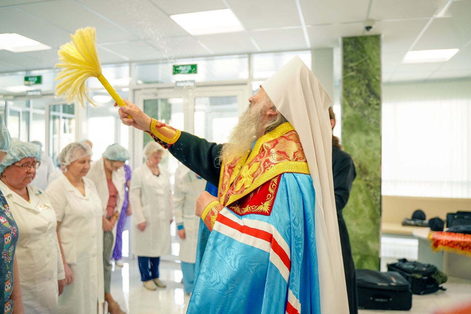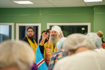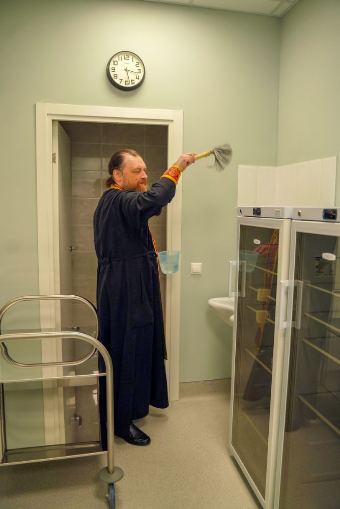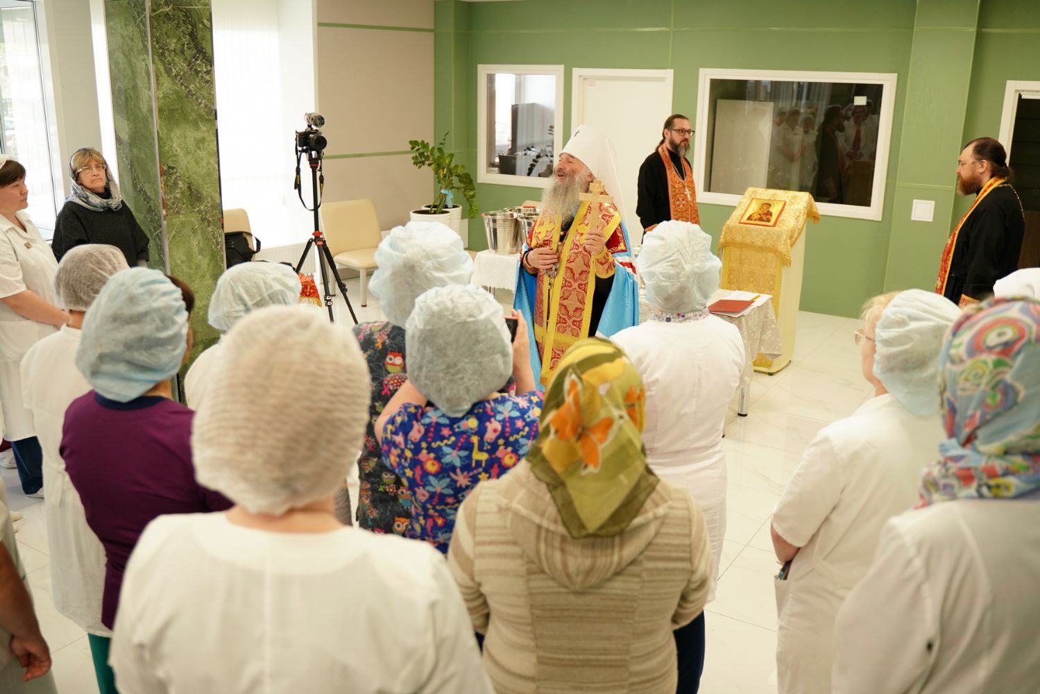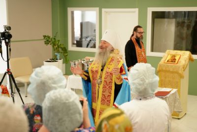 После водосвятного молебна митрополит Иоанн окропил стены на четыре стороны света и персонал центра, а сослужащие священники прошли с кроплением по всем палатам здания.