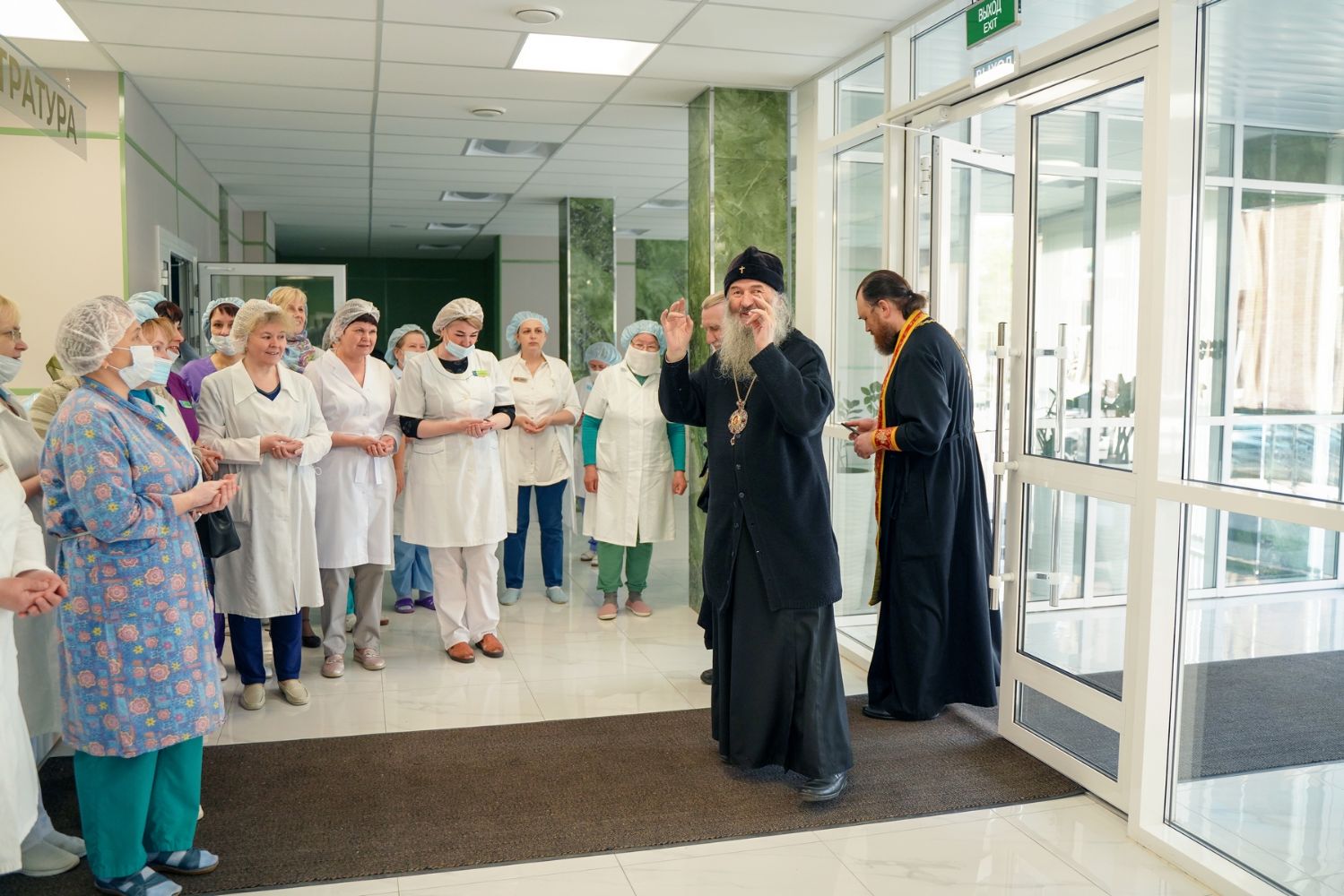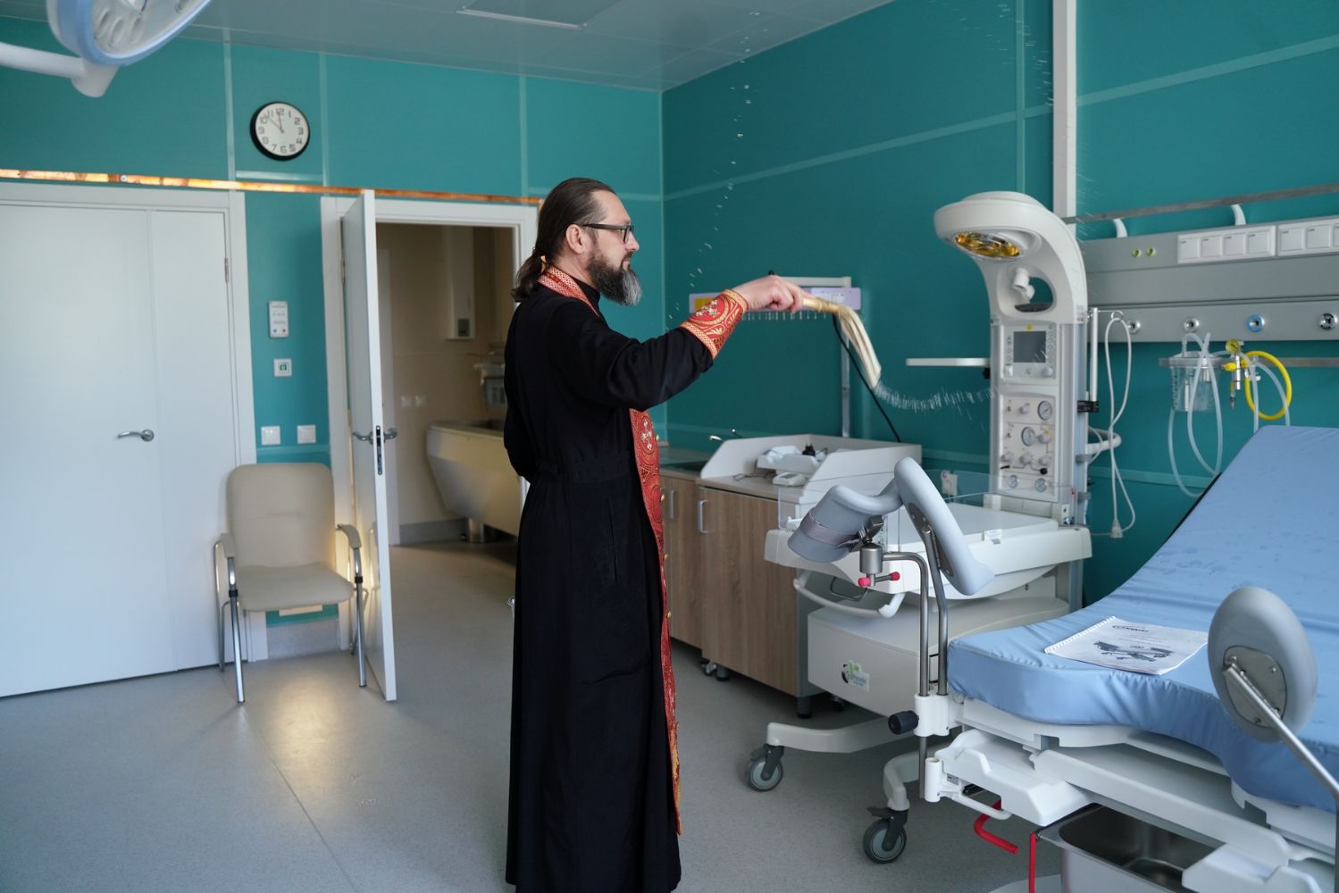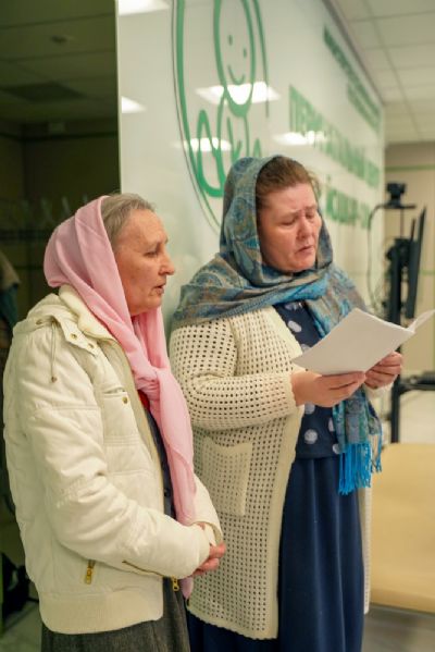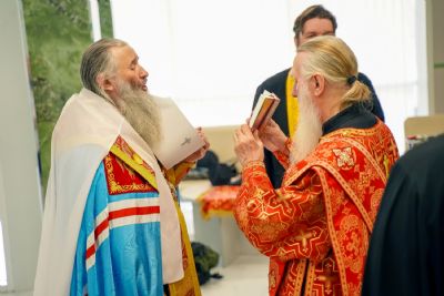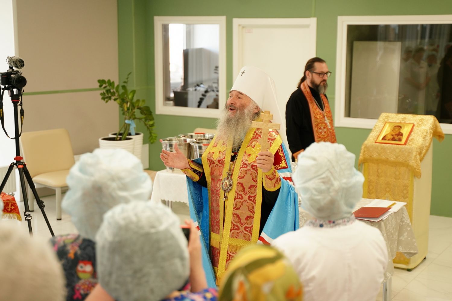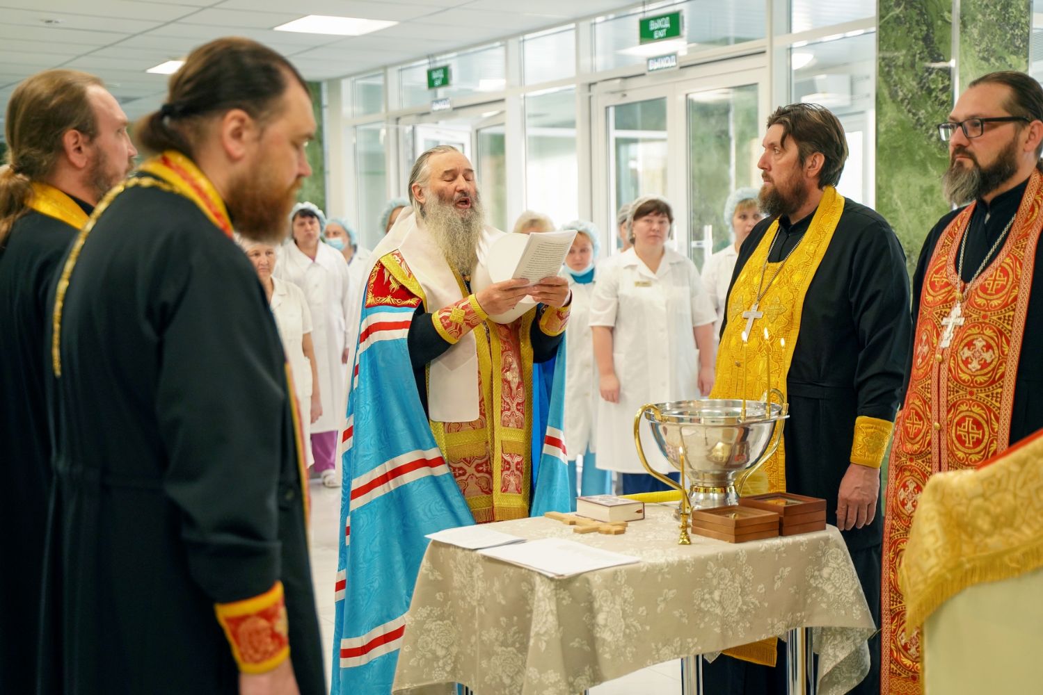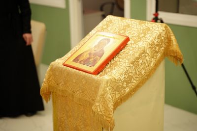 После водосвятного молебна митрополит Иоанн окропил стены на четыре стороны света и персонал центра, а сослужащие священники прошли с кроплением по всем палатам здания.
