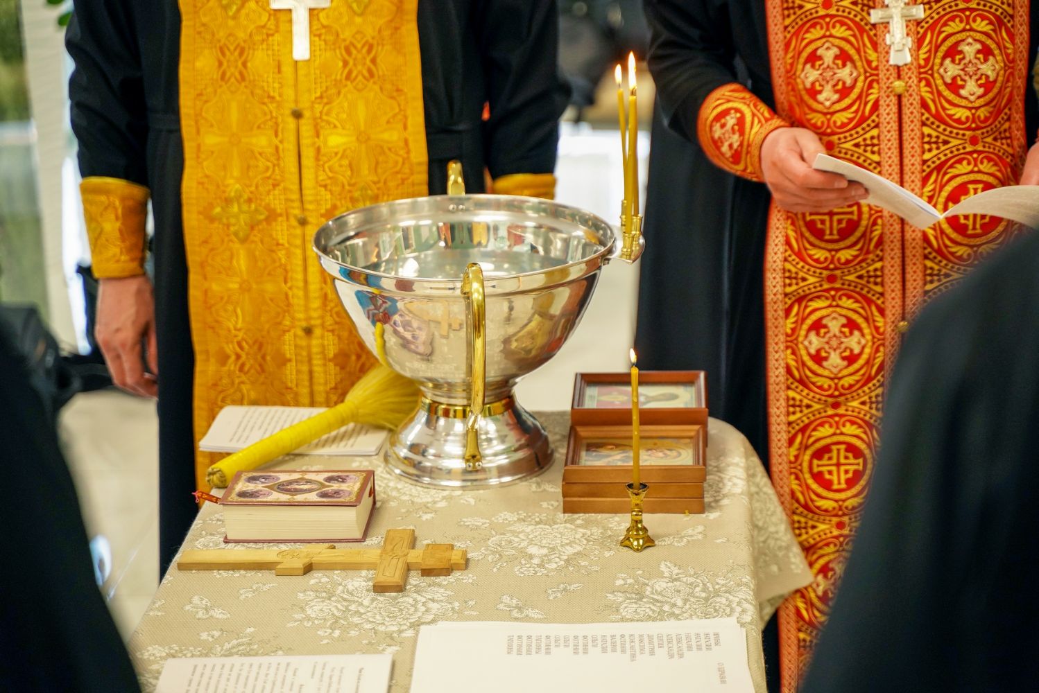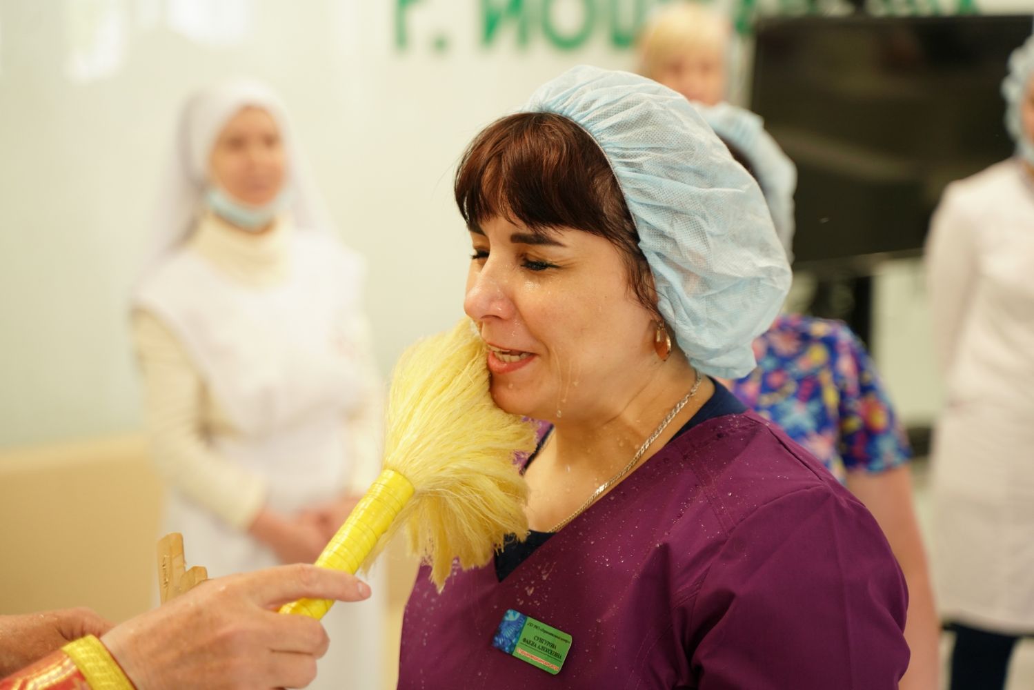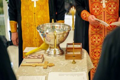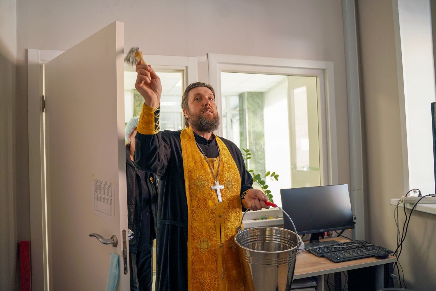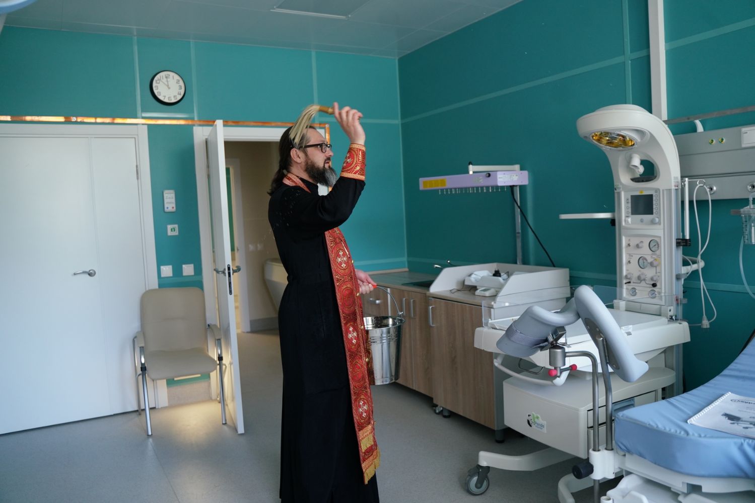 После водосвятного молебна митрополит Иоанн окропил стены на четыре стороны света и персонал центра, а сослужащие священники прошли с кроплением по всем палатам здания.