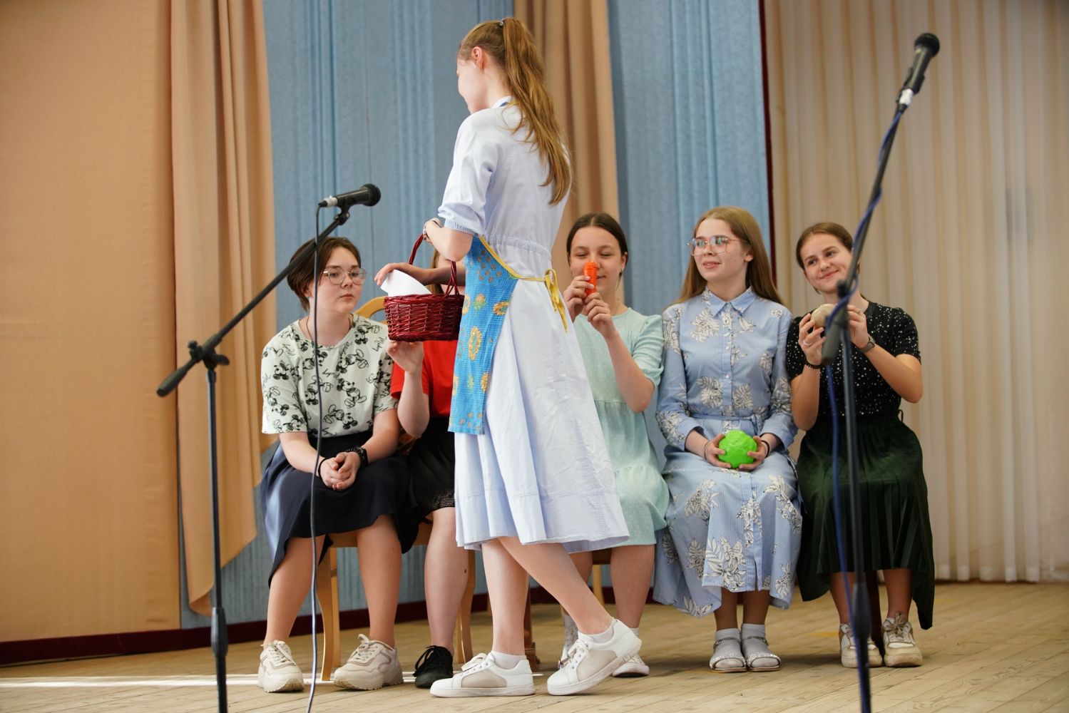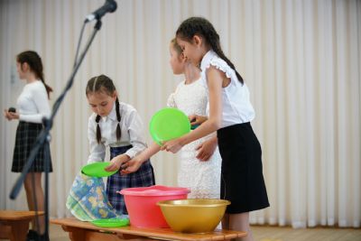 И вот, конкурс продолжается – команды представляют детские песни: ребята вспомнили множество добрых мультфильмов, вышли на сцену с мягкими игрушками…