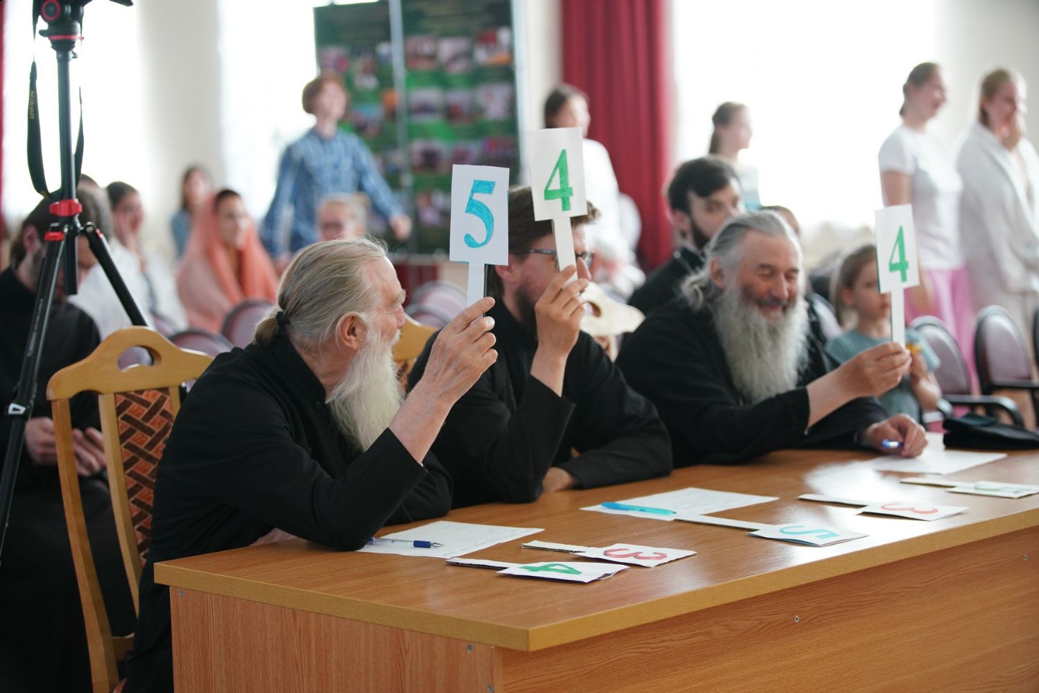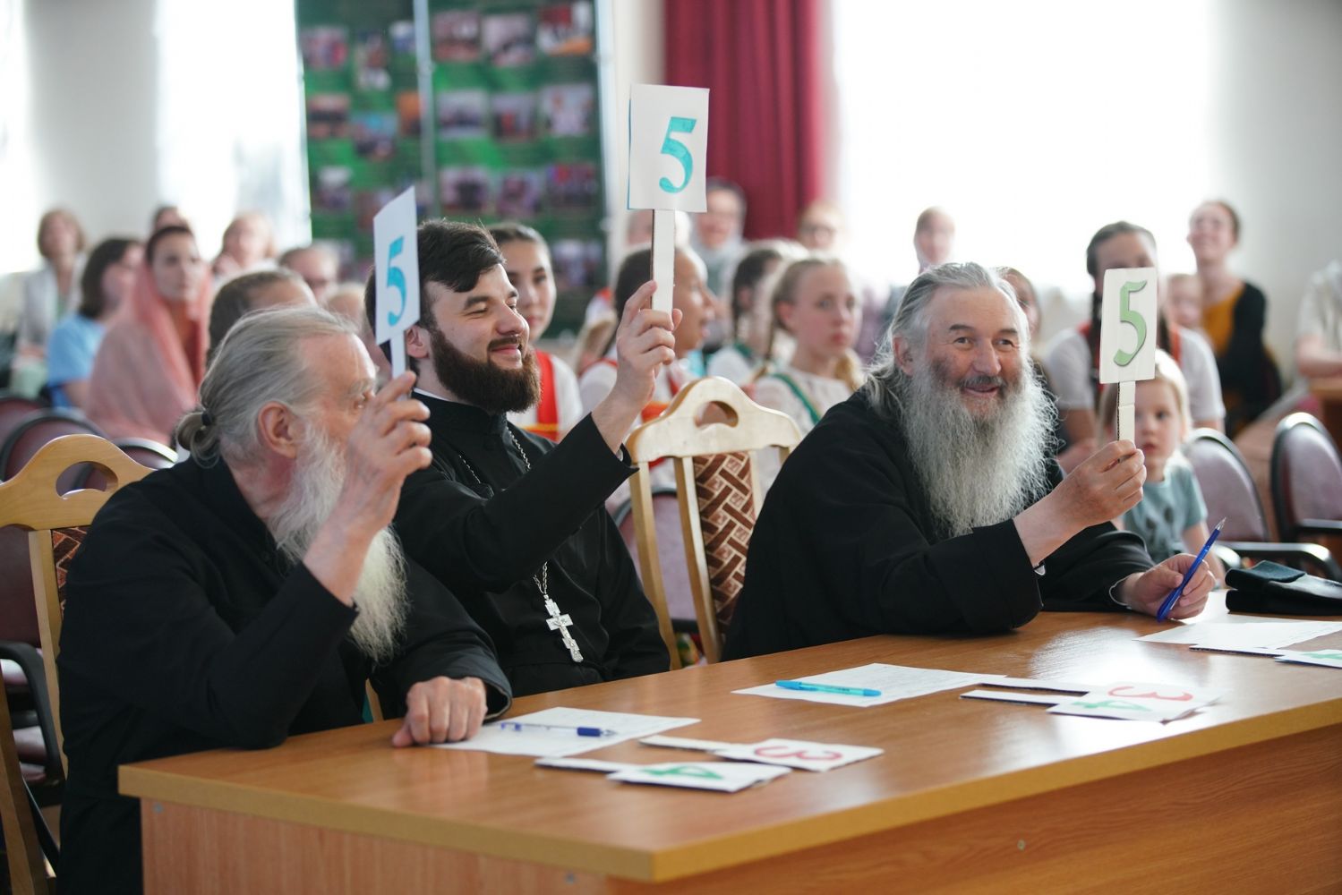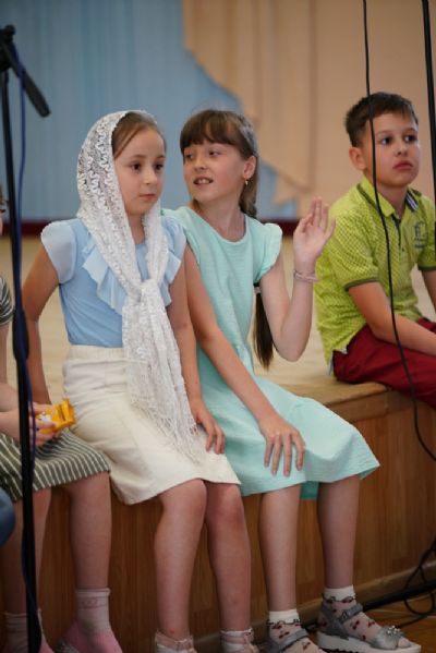 Первой номинацией стало музыкальное приветствие – ребята исполнили песни, представляющие их команды, а члены жюри выставили им оценки по пятибалльной системе. Очередность выступления команд была определена жеребьевкой: «Славословие» (Волжск), «Поющие сердца» (Благовест-1), «Доброхор», «Крутой овраг» (храм мц. Татианы), «Проснись и пой» (Благовест-2).